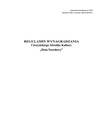 Załącznik do Zarządzenia nr 7/2013 Dyrektora COK w Cieszynie z dnia 21.05.2013 r. REGULAMIN WYNAGRADZANIA Cieszyńskiego Ośrodka Kultury „Dom Narodowy” Regulamin wynagradzania pracowników Cieszyńskiego Ośrodka Kultury „Dom Narodowy” w Cieszynie Działając w oparciu o Ustawę z dnia 26 czerwca 1974 r. Kodeks pracy (Dz. U. z 1998 r., Nr 21, poz. 94 ze zm.) Ustawę z dnia 25 października 1991 r. o organizowaniu i prowadzeniu działalności kulturalnej (Dz. U. z 2012 r., poz. 406.) Rozporządzenie Ministra Kultury i Dziedzictwa Narodowego z dnia 3 października 2012 r. w sprawie wynagradzania pracowników instytucji kultury (Dz. U. poz. 1105) ustanawiam Regulamin wynagradzania pracowników Cieszyńskiego Ośrodka Kultury „Dom Narodowy” w Cieszynie. §1 Regulamin wynagradzania ustala warunki wynagradzania za pracę i przyznawania innych świadczeń związanych z pracą. §2 Postanowienia regulaminu mają zastosowanie do wszystkich pracowników Cieszyńskiego Ośrodka Kultury „Dom Narodowy” oraz do dyrektora Cieszyńskiego Ośrodka Kultury „Dom Narodowy”, któremu wynagrodzenie ustala Burmistrz Miasta Cieszyna. §3 1. Godzinową stawkę wynagrodzenia zasadniczego pracownika określonego stawką miesięczną ustala się dzieląc miesięczną stawkę wynagrodzenia przez liczbę godzin pracy przypadających do przepracowania w danym miesiącu. 2. Wysokość wynagrodzenia lub zasiłku za czas niezdolności pracownika do pracy na skutek choroby wylicza się na podstawie odrębnych przepisów. §4 Pracownikowi zatrudnionemu w niepełnym wymiarze czasu pracy przysługuje wynagrodzenie zasadnicze i składniki wynagrodzenia w wysokości proporcjonalnej do wymiaru czasu pracy określone w umowie o pracę. §5 1. Pracownikom przysługuje dodatek za wieloletnią pracę zwany dalej „dodatkiem” w wysokości 5% wynagrodzenia zasadniczego po 5 latach pracy wzrastający o 1% za każdy następny rok aż do osiągnięcia 20% miesięcznego wynagrodzenia po 20 i dalszych latach pracy. 2. Do okresu zatrudnienia uprawniającego do dodatku wlicza się wszystkie poprzednie okresy zatrudnienia za wyjątkiem okresów zatrudnienia zakończonych rozwiązaniem umowy o pracę bez wypowiedzenia z winy pracownika. 3. Do okresu zatrudnienia uprawniającego do dodatku wlicza się także inne okresy, jeżeli na podstawie odrębnych przepisów podlegają one wliczeniu do czasu pracy, od którego zależą uprawnienia pracownicze. 4. Dodatek przysługuje pracownikowi za dni, za które otrzymuje wynagrodzenie oraz za dni nieobecności w pracy z powodu niezdolności do pracy wskutek choroby bądź konieczności osobistego sprawowania opieki nad dzieckiem lub chorym członkiem rodziny, za które pracownik otrzymuje z tego tytułu wynagrodzenie lub zasiłek z ubezpieczenia społecznego. 5. Dodatek wypłacany jest w terminie wypłaty wynagrodzenia: 1). począwszy od pierwszego dnia miesiąca następującego po miesiącu, w którym pracownik nabył prawo do dodatku lub prawo do wyższej stawki dodatku, jeżeli nabycie prawa nastąpiło w ciągu miesiąca, 2). za dany miesiąc, jeżeli nabycie prawa do dodatku lub prawa do wyższej stawki dodatku nastąpiło pierwszego dnia miesiąca. 6. W przypadku dodatkowego zatrudnienia pracownika prawo do dodatku ustala się odrębnie dla każdego stosunku pracy. Do okresu dodatkowego zatrudnienia nie wlicza się okresów zatrudnienia podstawowego. §6 1. Pracownikom zatrudnionym na stanowiskach kierowniczych przysługuje dodatek funkcyjny. 2. Dodatek funkcyjny wypłacany jest w ramach posiadanych środków na wynagrodzenia, w kwocie nieprzekraczającej 50% wynagrodzenia zasadniczego pracownika. 3. Przy ustalaniu wysokości dodatku funkcyjnego uwzględnia się zakres wykonywanych zadań, zakres odpowiedzialności na danym stanowisku, zakres uprawnień do podejmowania decyzji, poziom samodzielności niezbędnej do wykonywania zadań oraz liczbę podległych pracowników. §7 1. W ramach środków na wynagrodzenie osobowe może być tworzony fundusz premii uznaniowej w wysokości do 40% ogółem funduszu wynagrodzeń liczonego według stawek zasadniczych. 2. Wysokość premii dla poszczególnych pracowników ustala Dyrektor w granicach do 60% wynagrodzenia zasadniczego. 3. W ramach wolnych środków w uzasadnionych przypadkach Dyrektor może przyznać premie wyższe niż 60% wynagrodzenia zasadniczego. 4. Decyzję o wysokości premii pracowników oraz o jej wypłacie podejmuje Dyrektor, na wniosek bezpośredniego przełożonego. 5. Podejmując decyzję o wysokości premii uznaniowej Dyrektor bierze pod uwagę wkład pracy pracownika, jego obowiązkowość i zaangażowanie się w wykonywanie obowiązków. 6. Warunkiem przyznania premii pracownikowi jest właściwe wykonanie przez niego obowiązków oraz przestrzegania dyscypliny pracy. 7. Pracownik może zostać pozbawiony premii w całości lub w części zwłaszcza w przypadku: - nieusprawiedliwionego spóźnienia się do pracy, - nieusprawiedliwionej nieobecności w pracy, - stawienia się do pracy w stanie nietrzeźwym, - spożywania alkoholu w czasie pracy lub w miejscu pracy, - samowolnego opuszczenia miejsca pracy, - nieprzestrzegania przepisów bhp i p.poż., - nie wykonania polecenia przełożonego, - kradzieży mienia. §8 1. Pracownikom przysługuje dodatek specjalny. Warunkiem przyznania dodatku specjalnego jest wykonywanie przez pracownika: - okresowo zwiększonych obowiązków służbowych - dodatkowo powierzonych zadań o wysokim poziomie złożoności - pracy w szczególnym charakterze lub w szczególnych warunkach 2. Przy ustalaniu wysokości dodatku specjalnego uwzględnia się zakres i stopień trudności powierzonych zadań lub obowiązków oraz specyfikę i poziom uciążliwości warunków, w jakich świadczona jest praca. 3. Dodatek specjalny wypłacany jest za okres wykonywania pracy, z którą dodatek jest związany. 4. Dodatek specjalny wypłacany jest w ramach posiadanych środków na wynagrodze
