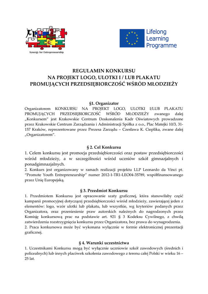 REGULAMIN KONKURSU NA PROJEKT LOGO, ULOTKI I / LUB PLAKATU PROMUJĄCYCH PRZEDSIĘBIORCZOŚĆ WŚRÓD MŁODZIEŻY §1. Organizator Organizatorem KONKURSU NA PROJEKT LOGO, ULOTKI I/LUB PLAKATU PROMUJĄCYCH PRZEDSIĘBIORCZOŚĆ WŚRÓD MŁODZIEŻY zwanego dalej „Konkursem” jest Krakowskie Centrum Doskonalenia Kadr Oświatowych prowadzone przez Krakowskie Centrum Zarządzania i Administracji Spółka z o.o., Plac Matejki 10/3, 31‐ 157 Kraków, reprezentowane przez Prezesa Zarządu – Czesława K. Cieplika, zwane dalej „Organizatorem”. § 2. Cel Konkursu 1. Celem konkursu jest promocja przedsiębiorczości oraz postaw przedsiębiorczości wśród młodzieży, a w szczególności wśród uczniów szkół gimnazjalnych i ponadgimnazjalnych. 2. Konkurs jest organizowany w ramach realizacji projektu LLP Leonardo da Vinci pt. “Promote Youth Entrepreneurship” numer 2012‐1‐TR1‐LEO04‐35789, współfinansowanego przez Unię Europejską. § 3. Przedmiot Konkursu 1. Przedmiotem Konkursu jest opracowanie szaty graficznej, która stanowiłaby część kampanii promocyjnej dotyczącej przedsiębiorczości wśród młodzieży, zawierającej jeden z elementów: logo, wzór ulotki lub plakatu, lub wszystkie, wg kryteriów podanych przez Organizatora, oraz przeniesienie praw autorskich należnych do nagrodzonych przez Komisję konkursową prac na podstawie art. 921 § 3 Kodeksu Cywilnego, z chwilą zatwierdzenia rozstrzygnięcia konkursu przez Organizatora, bez prawa do wynagrodzenia. 2. Praca konkursowa może być wykonana wyłącznie w formie elektronicznej prezentacji graficznej. § 4. Warunki uczestnictwa 1. Uczestnikami Konkursu mogą być wyłącznie uczniowie szkół zawodowych (średnich i policealnych) lub innych placówek szkolenia zawodowego z terenu całej Polski w wieku 16 – 25 lat. 2. Prace konkursowe powinny być wykonane indywidualnie i samodzielnie. Wykluczone są prace zbiorowe. 3. Jedna osoba może zgłosić wyłącznie jedną pracę konkursową. 4. W konkursie mogą uczestniczyć wyłącznie prace konkursowe przesłane drogą pocztową bądź dostarczone osobiście do siedziby Organizatora, zwane dalej „pracą” zawierające: a) zgłoszenie udziału w konkursie wraz z oświadczeniem (stanowiące Załącznik nr 1 do niniejszego Regulaminu) ‐ zwane dalej zgłoszeniem; b) prezentację graficzną (na płycie CD) spełniającą warunki określone w § 3. 5. Warunkiem przystąpienia do konkursu jest przekazanie wraz z podpisaną pracą konkursową, zgłoszenia udziału w konkursie opieczętowanego pieczęcią danej szkoły, oraz oświadczenia o treści jak stanowi Załącznik nr 1 do Regulaminu konkursu, w określonym przez Organizatora terminie. W przypadku uczestników, którzy w nie ukończyli 18 lat, wymagane jest złożenie zgłoszenia oraz oświadczenia rodzica lub opiekuna prawnego uczestnika konkursu. 6. Na płycie CD będącej nośnikiem pracy konkursowej określonej w ust. 4 pkt a‐b należy czytelnie wpisać imię, nazwisko i wiek autora. Praca powinna być odpowiednio zabezpieczona, w szczególności na czas wysyłki (np. koperta bąbelkowa). 7. Autorzy prac z chwilą przekazania ich Organizatorowi Konkursu i spełnienia warunków określonych w niniejszym Regulaminie Konkursu stają się Uczestnikami Konkursu. 8. Prace konkursowe mogą zostać przekazane za pośrednictwem szkoły / placówki, do której uczęszcza uczestnik lub przez samego uczestnika. 9. Każda szkoła lub placówka może przekazać prace dowolnej liczby uczniów. § 5. Zgłoszenia prac konkursowych 1. Prace można dostarczyć Organizatorowi korespondencyjnie bądź osobiście do dnia 7 marca 2014r. roku do godziny 16:00 (w przypadku korespondencyjnego dostarczania decyduje data wpływu do Organizatora). Po wskazanym terminie zgłoszenia nie będą przyjmowane. 2. Podpisanie i przekazanie zgłoszenia udziału wraz z oświadczeniem do Organizatora jest równoznaczne z wyrażeniem zgody na postanowienia niniejszego Regulaminu, z którymi Uczestnik Konkursu obowiązany jest zapoznać się. 4. Koszty wykonania i dostarczenia prac ponosi sam Uczestnik lub rodzic lub opiekun prawny Uczestnika lub szkoła / placówka. 5. Przekazanie prac konkursowych oraz zgłoszenia udziału w konkursie wraz z oświadczeniem, o którym mowa w Załączniku nr 1 do Regulaminu konkursu następuje z chwilą dostarczenia ich do siedziby Organizatora, na adres: Krakowskie Centrum Zarządzania i Administracji Sp. z o.o. 31‐157 Kraków, Plac Matejki 10/3 z dopiskiem na kopercie: KONKURS NA PROJEKT LOGO, ULOTKI I/LUB PLAKATU PROMUJĄCYCH PRZEDSIĘBIORCZOŚĆ WŚRÓD MŁODZIEŻY. § 6. Przebieg konkursu 1. Prezes Zarządu Krakowskiego Centrum Zarządzania i Administracji Spółka z o.o., bądź osoba przez niego wyznaczona: a) powołuje i odwołuje Komisję konkursową, która składa się co najmniej z 3 osób; b) określa organizację oraz tryb pracy Komisji konkursowej; c) sprawuje nadzór nad Komisją konkursową w zakresie zgodności rozstrzygnięcia konkursu z Regulaminem konkursu; d) zatwierdza rozstrzygnięcie konkursu, decyzją Prezesa Zarządu, która jest ostateczna i nie przysługuje od niej odwołanie. 2. Komisja konkursowa zapoznaje się z pracami konkursowymi po ostatecznym terminie składania prac podanym w § 5 ust. 1. 3. Komisja konkursowa jest niezależna w ocenie i wyborze najlepszych prac konkursowych. 4. Komisja konkursowa wybiera 3 najlepsze prace na podstawie następujących kryteriów: ‐ związek pracy z tematyką konkursową – 50%; ‐ stopień trudności wykonania – 30%; ‐ estetyka wykonania – 20%. 5. Pracami Komisji konkursowej kieruje Przewodniczący wybrany przez członków komisji z własnego grona. 6. Podpisany protokół z rozstrzygnięcia konkursu Komisja konkursowa przedstawia Prezesowi Zarządu celem jego zatwierdzenia. 7. Od podjętej przez Komisję konkursową decyzji o przyznaniu nagród nie przysługuje odwołanie. 8. Organizator nie zwraca nadesłanych prac, w tym r