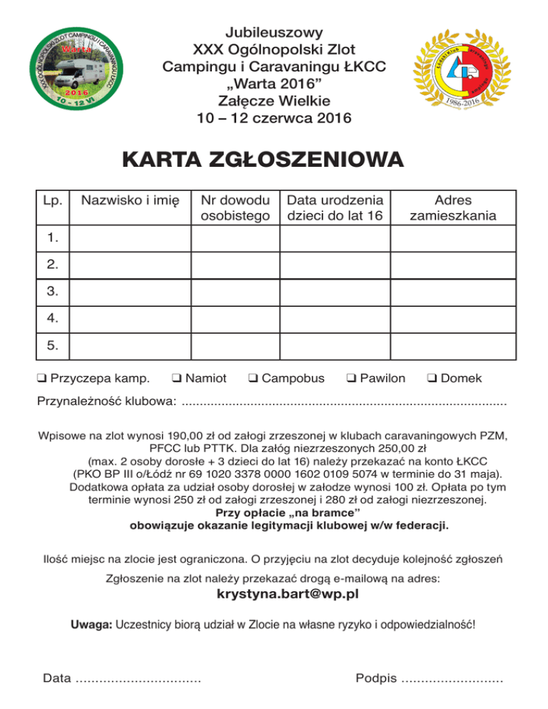 Jubileuszowy XXX Ogólnopolski Zlot Campingu i Caravaningu ŁKCC „Warta 2016” Załęcze Wielkie 10 – 12 czerwca 2016 198 6 - 2 016 KARTA ZGŁOSZENIOWA Lp. Nazwisko i imię 1. Nr dowodu osobistego Data urodzenia dzieci do lat 16 Adres zamieszkania 2. 3. 4. 5. ❑ Przyczepa kamp. ❑ Namiot ❑ Campobus ❑ Pawilon ❑ Domek Przynależność klubowa: ........................................................................................... Wpisowe na zlot wynosi 190,00 zł od załogi zrzeszonej w klubach caravaningowych PZM, PFCC lub PTTK. Dla załóg niezrzeszonych 250,00 zł (max. 2 osoby dorosłe + 3 dzieci do lat 16) należy przekazać na konto ŁKCC (PKO BP III o/Łódź nr 69 1020 3378 0000 1602 0109 5074 w terminie do 31 maja). Dodatkowa opłata za udział osoby dorosłej w załodze wynosi 100 zł. Opłata po tym terminie wynosi 250 zł od załogi zrzeszonej i 280 zł od załogi niezrzeszonej. Przy opłacie „na bramce” obowiązuje okazanie legitymacji klubowej w/w federacji. Ilość miejsc na zlocie jest ograniczona. O przyjęciu na zlot decyduje kolejność zgłoszeń Zgłoszenie na zlot należy przekazać drogą e-mailową na adres: [email protected] Uwaga: Uczestnicy biorą udział w Zlocie na własne ryzyko i odpowiedzialność! Data ................................ Podpis ..........................