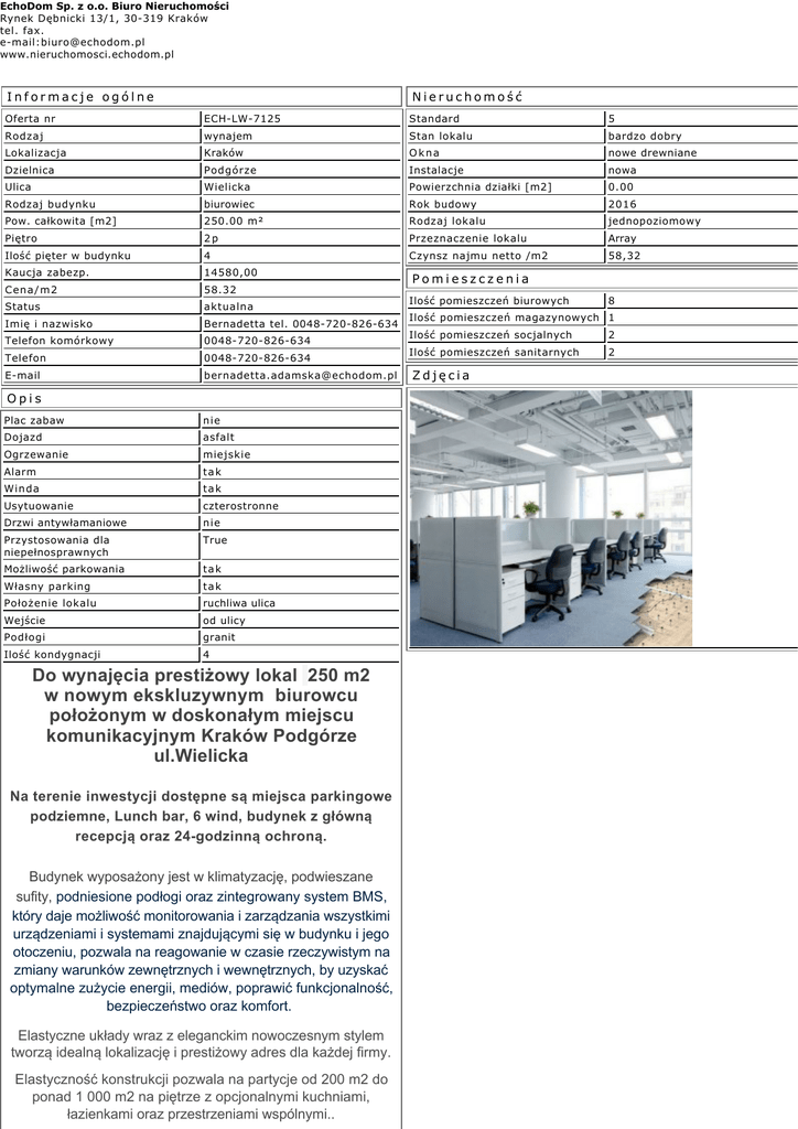 EchoDom Sp. z o.o. Biuro Nieruchomości Rynek Dębnicki 13/1, 30-319 Kraków tel. fax. e-mail:[email protected] www.nieruchomosci.echodom.pl Informacje ogólne Nieruchomość Oferta nr ECH-LW-7125 Standard 5 Rodzaj wynajem Stan lokalu bardzo dobry Lokalizacja Kraków Okna nowe drewniane Dzielnica Podgórze Instalacje nowa Ulica Wielicka Powierzchnia działki [m2] 0.00 Rodzaj budynku biurowiec Rok budowy 2016 Pow. całkowita [m2] 250.00 m² Rodzaj lokalu jednopoziomowy Piętro 2p Przeznaczenie lokalu Array Ilość pięter w budynku 4 Czynsz najmu netto /m2 58,32 Kaucja zabezp. 14580,00 Cena/m2 58.32 Status aktualna Imię i nazwisko Bernadetta tel. 0048-720-826-634 Telefon komórkowy 0048-720-826-634 Telefon 0048-720-826-634 E-mail [email protected] Opis Plac zabaw nie Dojazd asfalt Ogrzewanie miejskie Alarm tak Winda tak Usytuowanie czterostronne Drzwi antywłamaniowe nie Przystosowania dla niepełnosprawnych True Możliwość parkowania tak Własny parking tak Położenie lokalu ruchliwa ulica Wejście od ulicy Podłogi granit Ilość kondygnacji 4 Do wynajęcia prestiżowy lokal 250 m2 w nowym ekskluzywnym biurowcu położonym w doskonałym miejscu komunikacyjnym Kraków Podgórze ul.Wielicka Na terenie inwestycji dostępne są miejsca parkingowe podziemne, Lunch bar, 6 wind, budynek z główną recepcją oraz 24-godzinną ochroną. Budynek wyposażony jest w klimatyzację, podwieszane sufity, podniesione podłogi oraz zintegrowany system BMS, który daje możliwość monitorowania i zarządzania wszystkimi urządzeniami i systemami znajdującymi się w budynku i jego otoczeniu, pozwala na reagowanie w czasie rzeczywistym na zmiany warunków zewnętrznych i wewnętrznych, by uzyskać optymalne zużycie energii, mediów, poprawić funkcjonalność, bezpieczeństwo oraz komfort. Elastyczne układy wraz z eleganckim nowoczesnym stylem tworzą idealną lokalizację i prestiżowy adres dla każdej firmy. Elastyczność konstrukcji pozwala na partycje od 200 m2 do ponad 1 000 m2 na piętrze z opcjonalnymi kuchniami, łazienkami oraz przestrzeniami wspólnymi.. Pomieszczenia Ilość pomieszczeń biurowych 8 Ilość pomieszczeń magazynowych 1 Ilość pomieszczeń socjalnych 2 Ilość pomieszczeń sanitarnych 2 Zdjęcia Możliwość własnej aranżacji układu pomieszczeń, na podłogach granit, ściany - szkło/ drewno/tynk Pomieszczenia przestronne, jasne i słoneczne. Lokal w wysokim standardzie, z najwyższej jakości materiałów. Cena najmu to jedyne 13,5 euro/m2 Media 13,5 zł netto/m2 Budynek położony jest w centralnej części Krakowa Podgórza . Lokalizacja umożliwia sprawny dojazd do innych części miasta, zarówno komunikacją publiczną jak i własnym środkiem transportu. Port Lotniczy im. Jana Pawła II mieści się w odległości 30 minut jazdy samochodem od nieruchomości. Lokal idealny na siedzibę firmy, księgowość, kancelarię, biuro, administrację firmy, biuro nieruchomości, biuro sprzedaży dla dewelopera oraz wiele innych branż. Serdecznie polecam i zapraszam na prezentację nieruchomości! Więcej ofert na EchoDom.pl! BIURO NIERUCHOMOŚCI EchoDom Sp. z o.o.szeroki wybór ofert. Kompleksowa obsługa przy sprzedaży, wynajmie nieruchomości. Atrakcyjne propozycje kredytowe, sporządzane wedle potrzeb Klientów. ZAPEWNIAMY PROFESJONALIZM I BEZPIECZEŃSTWO ZAWIERANYCH TRANSAKCJI! © Wszelkie prawa zastrzeżone - EchoDom