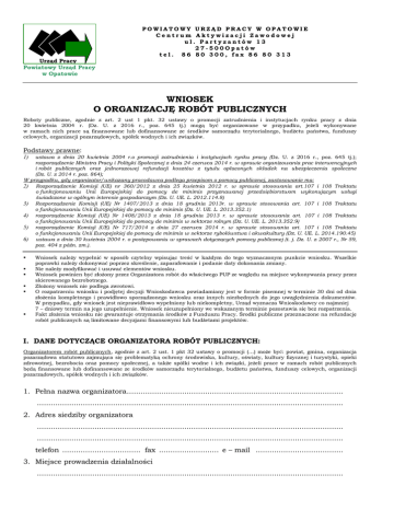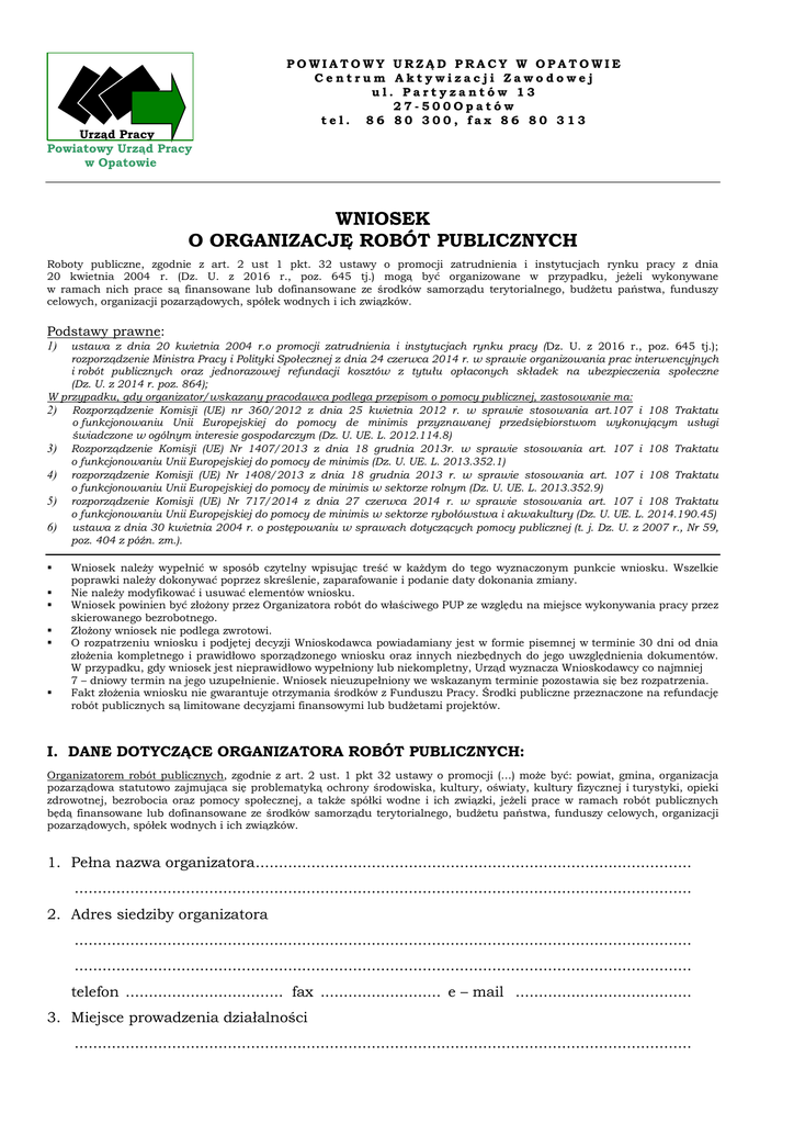 POWIATOWY URZĄD PRACY W OPATOWIE Centrum Aktywizacji Zawodowej ul. Partyzantów 13 27-500Opatów tel. 86 80 300, fax 86 80 313 Urząd Pracy Powiatowy Urząd Pracy w Opatowie WNIOSEK O ORGANIZACJĘ ROBÓT PUBLICZNYCH Roboty publiczne, zgodnie z art. 2 ust 1 pkt. 32 ustawy o promocji zatrudnienia i instytucjach rynku pracy z dnia 20 kwietnia 2004 r. (Dz. U. z 2016 r., poz. 645 tj.) mogą być organizowane w przypadku, jeżeli wykonywane w ramach nich prace są finansowane lub dofinansowane ze środków samorządu terytorialnego, budżetu państwa, funduszy celowych, organizacji pozarządowych, spółek wodnych i ich związków. Podstawy prawne: 1) ustawa z dnia 20 kwietnia 2004 r.o promocji zatrudnienia i instytucjach rynku pracy (Dz. U. z 2016 r., poz. 645 tj.); rozporządzenie Ministra Pracy i Polityki Społecznej z dnia 24 czerwca 2014 r. w sprawie organizowania prac interwencyjnych i robót publicznych oraz jednorazowej refundacji kosztów z tytułu opłaconych składek na ubezpieczenia społeczne (Dz. U. z 2014 r. poz. 864); W przypadku, gdy organizator/wskazany pracodawca podlega przepisom o pomocy publicznej, zastosowanie ma: 2) Rozporządzenie Komisji (UE) nr 360/2012 z dnia 25 kwietnia 2012 r. w sprawie stosowania art.107 i 108 Traktatu o funkcjonowaniu Unii Europejskiej do pomocy de minimis przyznawanej przedsiębiorstwom wykonującym usługi świadczone w ogólnym interesie gospodarczym (Dz. U. UE. L. 2012.114.8) 3) Rozporządzenie Komisji (UE) Nr 1407/2013 z dnia 18 grudnia 2013r. w sprawie stosowania art. 107 i 108 Traktatu o funkcjonowaniu Unii Europejskiej do pomocy de minimis (Dz. U. UE. L. 2013.352.1) 4) rozporządzenie Komisji (UE) Nr 1408/2013 z dnia 18 grudnia 2013 r. w sprawie stosowania art. 107 i 108 Traktatu o funkcjonowaniu Unii Europejskiej do pomocy de minimis w sektorze rolnym (Dz. U. UE. L. 2013.352.9) 5) rozporządzenie Komisji (UE) Nr 717/2014 z dnia 27 czerwca 2014 r. w sprawie stosowania art. 107 i 108 Traktatu o funkcjonowaniu Unii Europejskiej do pomocy de minimis w sektorze rybołówstwa i akwakultury (Dz. U. UE. L. 2014.190.45) 6) ustawa z dnia 30 kwietnia 2004 r. o postępowaniu w sprawach dotyczących pomocy publicznej (t. j. Dz. U. z 2007 r., Nr 59, poz. 404 z późn. zm.). Wniosek należy wypełnić w sposób czytelny wpisując treść w każdym do tego wyznaczonym punkcie wniosku. Wszelkie poprawki należy dokonywać poprzez skreślenie, zaparafowanie i podanie daty dokonania zmiany. Nie należy modyfikować i usuwać elementów wniosku. Wniosek powinien być złożony przez Organizatora robót do właściwego PUP ze względu na miejsce wykonywania pracy przez skierowanego bezrobotnego. Złożony wniosek nie podlega zwrotowi. O rozpatrzeniu wniosku i podjętej decyzji Wnioskodawca powiadamiany jest w formie pisemnej w terminie 30 dni od dnia złożenia kompletnego i prawidłowo sporządzonego wniosku oraz innych niezbędnych do jego uwzględnienia dokumentów. W przypadku, gdy wniosek jest nieprawidłowo wypełniony lub niekompletny, Urząd wyznacza Wnioskodawcy co najmniej 7 – dniowy termin na jego uzupełnienie. Wniosek nieuzupełniony we wskazanym terminie pozostawia się bez rozpatrzenia. Fakt złożenia wniosku nie gwarantuje otrzymania środków z Funduszu Pracy. Środki publiczne przeznaczone na refundację robót publicznych są limitowane decyzjami finansowymi lub budżetami projektów. I. DANE DOTYCZĄCE ORGANIZATORA ROBÓT PUBLICZNYCH: Organizatorem robót publicznych, zgodnie z art. 2 ust. 1 pkt 32 ustawy o promocji (…) może być: powiat, gmina, organizacja pozarządowa statutowo zajmująca się problematyką ochrony środowiska, kultury, oświaty, kultury fizycznej i turystyki, opieki zdrowotnej, bezrobocia oraz pomocy społecznej, a także spółki wodne i ich związki, jeżeli prace w ramach robót publicznych będą finansowane lub dofinansowane ze środków samorządu terytorialnego, budżetu państwa, funduszy celowych, organizacji pozarządowych, spółek wodnych i ich związków. 1. Pełna nazwa organizatora.............................................................................................. ..................................................................................................................................... 2. Adres siedziby organizatora ..................................................................................................................................... ..................................................................................................................................... telefon .................................. fax .......................... e – mail ...................................... 3. Miejsce prowadzenia działalności ..................................................................................................................................... 4. Nr REGON ................................................. Nr NIP ............................................... 5. Symbol podklasy rodzaju prowadzonej działalności określony zgodnie z PKD ............... 6. Oznaczenie formy organizacyjno-prawnej prowadzonej działalności ............................. ..................................................................................................................................... 7. Data rozpoczęcia prowadzenia działalności .................................................................. II. DANE PRACODAWCY WSKAZANEGO PRZEZ ORGANIZATORA, U KTÓREGO BĘDĄ WYKONYWANE ROBOTY PUBLICZNE: Organizator robót publicznych (tj. powiat, gmina i inne w/w), zgodnie z § 3 Rozporządzenia MPiPS z dnia 24 czerwca 2014 r. w sprawie organizowania prac interwencyjnych i robót publicznych (…), może wskazać pracodawcę 1 (np. urząd miasta, urząd gminy i inne), u którego będą wykonywane roboty publiczne. 1. Pełna nazwa pracodawcy ............................................................................................. .................................