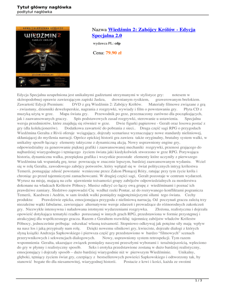 Tytuł główny nagłówka podtytuł nagłówka Nazwa Wiedźmin 2: Zabójcy Królów - Edycja Specjalna 2.0 wydawca PL: cdp Cena: 79.90 zł Edycja Specjalna uzupełniona jest unikalnymi gadżetami utrzymanymi w stylistyce gry: notesem w skóropodobnej oprawie zawierającym zapiski Jaskra, drewnianym rysikiem, grawerowanym brelokiem. Zawartość Edycji Premium: DVD z grą Wiedźmin 2: Zabójcy Królów. Materiały filmowe związane z grą - zwiastuny, dzienniki deweloperskie, nagrania z rozgrywki, wywiady i film o powstawaniu gry. Płyta CD z muzyką użytą w grze. Mapa świata gry. Przewodnik po grze, przeznaczony zarówno dla początkujących, jak i zaawansowanych graczy. Spis podstawowych zasad rozgrywki, sterowanie u ustawienia. Specjalna wersja przedmiotów, które znajdują się również w grze. Dwie figurki papierowe - Geralt oraz losowa postać z gry (dla kolekcjonerów). Dodatkowa zawartość do pobrania z sieci.. Druga część sagi RPG o przygodach Wiedźmina Geralta z Rivii oferuje wciągający, dojrzały scenariusz wyznaczający nowe standardy nieliniowej, skłaniającej do myślenia narracji. Oprócz epickiej historii gra zawiera także oryginalny, brutalny system walki, w unikalny sposób łączący elementy taktyczne z dynamiczną akcją. Nowy usprawniony engine gry, odpowiedzialny za generowanie pięknej grafiki i zaawansowanej mechaniki rozgrywki, przenosi grającego do najbardziej wiarygodnego i tętniącego życiem świata jaki kiedykolwiek stworzono w grze RPG. Porywająca historia, dynamiczna walka, przepiękna grafika i wszystkie pozostałe elementy które uczyniły z pierwszego Wiedźmina tak wspaniałą grę, teraz powracają w znacznie lepszym, bardziej zaawansowanym wydaniu. Wciel się w rolę Geralta, zawodowego zabójcy potworów, który wplątał się w świat politycznych intryg królestwa Temerii, pomagając zdusić powstanie wzniecone przez Zakon Płonącej Róży, ratując przy tym życie króla i chroniąc go przed tajemniczymi zamachowcami. W drugiej części sagi, Geralt pozostaje w centrum wydarzeń. Wyrusz na misję, mającą na celu ujawnienie tożsamości grupy zabójców odpowiedzialnych za morderstwa dokonane na władcach Królestw Północy. Musisz odkryć co łączy ową grupę z wiedźminami i poznać ich prawdziwe zamiary. Śledztwo zaprowadzi Cię wzdłuż rzeki Pontar, aż do rozrywanego konfliktami pogranicza Temerii, Kaedwen i Aedrin, w sam środek walki pomiędzy najpotężniejszymi siłami tego świata. Cechy produktu: Prawdziwie epicka, emocjonująca przygoda z nieliniową narracją. Od poczynań gracza zależą trzy niezależne wątki fabularne, zawierające alternatywne wersje zdarzeń i prowadzące do różnorodnych zakończeń gry. Niezwykle intensywna i naładowana istotnymi wydarzeniami rozgrywka. Złożona, realistyczna i dojrzała opowieść dotykająca tematyki rzadko poruszanej w innych grach RPG, przedstawiona w formie przystępnej i atrakcyjnej dla współczesnego gracza. Razem z Geraltem rozwikłaj tajemnicę zabójstw władców Królestw Północy, jednocześnie próbując odszukać własną tożsamość. Stopniowo odkrywaj jak potężne siły mają wpływ na nasz los i jaką przypisały nam rolę. Dzięki nowemu silnikowi gry, kwieciste, dojrzałe dialogi z których słyną książki Andrzeja Sapkowskiego i pierwsza część gry przedstawiono w bardzo “filmowych” scenach przerywnikowych i sekwencjach dialogowych. Nowy, usprawniony system retrospekcji. Tym razem wspomnienia Geralta, ukazujące związek pomiędzy naszymi przeszłymi wyborami i teraźniejszością, wpleciono do gry w płynny i realistyczny sposób. Seks i erotyka przedstawione zostaną w dużo bardziej realistyczny, emocjonujący i dojrzały sposób – dużo bardziej wiarygodnie niż w pierwszym Wiedźminie. Unikalny, głęboki, tętniący życiem świat gry, czerpiący z bestsellerowych powieści Sapkowskiego i odtworzony tak, by stanowić bogate tło dla niesamowitej, wiarygodnej historii. Postacie z krwi i kości, każda ze swoimi 1/3 Tytuł główny nagłówka podtytuł nagłówka własnymi motywacjami i zamiarami. Podczas wędrówek napotkasz zwykłych ludzi, żołnierzy, buntowników, potężnych magów, władców i ich zabójców. Zestaw postaci, które spotkasz różnić się będzie w zależności od podjętych przez Ciebie decyzji, wzajemne stosunki z innymi bohaterami ukształtują dalsze wydarzenia w świecie gry. Zróżnicowane, zapierające dech w piersiach lokacje, stworzone przy pomocy nowego engine’u, tworzą jednolity, w pełni oddany Ci do eksploracji świat! Bogaty, żyjący świat w którym każda postać ma swoje życie i zawód. Twoje działania wpływają na stosunki pomiędzy postaciami i otoczeniem, a także – w przypadku głównego wątku – otwierają lub zamykają możliwości interakcji w świecie gry. Zwiększona swoboda eksploracji zapewni większy realizm i szerszy wachlarz opcji taktycznych. Geralt będzie mógł pokonywać przeszkody, przeskakiwać przez płoty, wspinać się na ściany i skały. 2/3 Tytuł główny nagłówka podtytuł nagłówka Nazwa Wartość Wydawca PL CDP.pl / CD Projekt Data premiery 17.05.2010 Producent Tryb gry Kategoria wiekowa Wersja językowa Wymagania sprzętowe Format CD Projekt Red Studio Single Player 18+ PL Core 2 Quad 2.2 GHz, 3 GB RAM (4 GB dla Vista/7), kart DVD 3/3