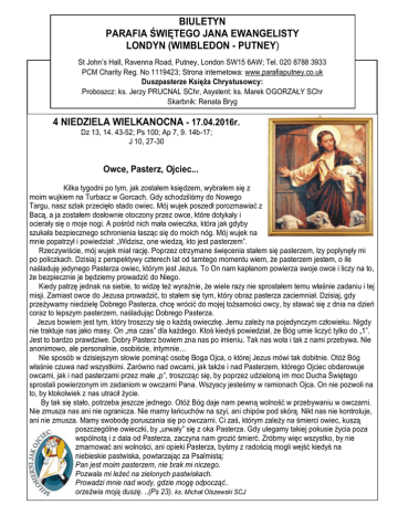 BIULETYN PARAFIA ŚWIĘTEGO JANA EWANGELISTY LONDYN (WIMBLEDON - PUTNEY) St John’s Hall, Ravenna Road, Putney, London SW15 6AW; Tel. 020 8788 3933 PCM Charity Reg. No 1119423; Strona internetowa: www.parafiaputney.co.uk Duszpasterze Księża Chrystusowcy: Proboszcz: ks. Jerzy PRUCNAL SChr, Asystent: ks. Marek OGORZAŁY SChr Skarbnik: Renata Bryg 4 NIEDZIELA WIELKANOCNA - 17.04.2016r. Dz 13, 14. 43-52; Ps 100; Ap 7, 9. 14b-17; J 10, 27-30 Owce, Pasterz, Ojciec... Kilka tygodni po tym, jak zostałem księdzem, wybrałem się z moim wujkiem na Turbacz w Gorcach. Gdy schodziliśmy do Nowego Targu, nasz szlak przecięło stado owiec. Mój wujek poszedł porozmawiać z Bacą, a ja zostałem dosłownie otoczony przez owce, które dotykały i ocierały się o moje nogi. A pośród nich mała owieczka, która jak gdyby szukała bezpiecznego schronienia łasząc się do moich nóg. Mój wujek na mnie popatrzył i powiedział: „Widzisz, one wiedzą, kto jest pasterzem”. Rzeczywiście, mój wujek miał rację. Poprzez otrzymane święcenia stałem się pasterzem, łzy popłynęły mi po policzkach. Dzisiaj z perspektywy czterech lat od tamtego momentu wiem, że pasterzem jestem, o ile naśladuję jedynego Pasterza owiec, którym jest Jezus. To On nam kapłanom powierza swoje owce i liczy na to, że bezpiecznie je będziemy prowadzić do Niego. Kiedy patrzę jednak na siebie, to widzę też wyraźnie, że wiele razy nie sprostałem temu właśnie zadaniu i tej misji. Zamiast owce do Jezusa prowadzić, to stałem się tym, który obraz pasterza zaciemniał. Dzisiaj, gdy przeżywamy niedzielę Dobrego Pasterza, chcę wrócić do mojej tożsamości owcy, by stawać się z dnia na dzień coraz to lepszym pasterzem, naśladując Dobrego Pasterza. Jezus bowiem jest tym, który troszczy się o każdą owieczkę. Jemu zależy na pojedynczym człowieku. Nigdy nie traktuje nas jako masy. On „ma czas” dla każdego. Ktoś kiedyś powiedział, że Bóg umie liczyć tylko do „1”. Jest to bardzo prawdziwe. Dobry Pasterz bowiem zna nas po imieniu. Tak nas woła i tak z nami przebywa. Nie anonimowo, ale personalnie, osobiście, intymnie… Nie sposób w dzisiejszym słowie pominąć osobę Boga Ojca, o której Jezus mówi tak dobitnie. Otóż Bóg właśnie czuwa nad wszystkimi. Zarówno nad owcami, jak także i nad Pasterzem, którego Ojciec obdarowuje owcami, jak i nad pasterzami przez małe „p”, troszcząc się, by poprzez udzieloną im moc Ducha Świętego sprostali powierzonym im zadaniom w owczarni Pana. Wszyscy jesteśmy w ramionach Ojca. On nie pozwoli na to, by ktokolwiek z nas utracił życie. By tak się stało, potrzeba jeszcze jednego. Otóż Bóg daje nam pewną wolność w przebywaniu w owczarni. Nie zmusza nas ani nie ogranicza. Nie mamy łańcuchów na szyi, ani chipów pod skórą. Nikt nas nie kontroluje, ani nie zmusza. Mamy swobodę poruszania się po owczarni. Ci zaś, którym zależy na śmierci owiec, kuszą poszczególne owieczki, by „urwały” się z oka Pasterza. Gdy ulegamy takiej pokusie życia poza wspólnotą i z dala od Pasterza, zaczyna nam grozić śmierć. Zróbmy więc wszystko, by nie zmarnować ani wolności, ani opieki Pasterza, byśmy z radością mogli wejść kiedyś na niebieskie pastwiska, powtarzając za Psalmistą: Pan jest moim pasterzem, nie brak mi niczego. Pozwala mi leżeć na zielonych pastwiskach. Prowadzi mnie nad wody, gdzie mogę odpocząć.. orzeźwia moją duszę. ..(Ps 23). ks. Michał Olszewski SCJ 16.04 Sobota IV NIEDZIELA WIELKANOCNA 18:00 O błogosławieństwo i wytrwanie w cierpieniu dla Emilii i Józefa Polniaszek 17.04 NIEDZIELA IV NIEDZIELA WIELKANOCNA 8.30 10:00 Wimbledon 11:30 12:45 18:00 Śp. Julita Wawszczak O zdrowie i Bożą opiekę dla Szymona i Alana O zdrowie synka Oskara O zdrowie i Boże błogosławieństwo dla Rodzeństwa z okazji imienin Śp. Stefania Kulińska 19.00 Koronka do BM 18.04 Poniedziałek Dzień powszedni kolor biały 10.30 19.00 O wieczną szczęsliwość dla Ernesta Śp. Jan Pierścionek 19.04 Wtorek Dzień powszedni kolor biały 10.30 19.00 Za dusze w czyśćcu cierpiące Śp. Walter Luskacz 20.04 Środa Dzień powszedni kolor biały 10.30 19.00 Za dusze w czyśćcu cierpiące Śp. Jerzy Kopański - o życie wieczne 21.04 Czwartek Dzień powszedni kolor biały 10.30 19.00 Za dusze w czyśćcu cierpiące Dziękczynna za otrzymane łaski i o Bożą opiekę dla Rodziny 22.04 Piątek Dzień powszedni kolor biały 10.30 19.00 Śp. Bogumiła Komar (8r.śm.) Dziękczynna za znajomych i przyjaciół 23.04 Sobota Ur. Św. Wojciecha, 10.30 bpa – k. czerwony V NIEDZIELA 18.00 WIELKANOCNA kolor biały Za Ojczyznę V NIEDZIELA WIELKANOCNA 8.30 10:00 Wimbledon 11:30 12:45 18:00 Śp. Jerzy (23r. śm.) Śp. Antoni Zwierkowski, śp. Maria Filipowicz chrzcielna Za dusze w czyśćcu cierpiące Za Parafian 24.04 NIEDZIELA 19.00 Koronka do BM W intencji grupy św. Ojca Pio O Boże błogosławieństwo dla księdza Proboszcza Jerzego (od grup Różańcowych) KAWIARENKA czynna po Mszach św. o godz. 8.30, 10.00 i 11.30. Zapraszamy. BIURO PARAFIALNE czynne w tym tygodniu od poniedziałku do piątku rano po Mszy św. o godz. 10.30 i wieczorem po Mszy św. o godz. 19.00. PRASA KATOLICKA. Zachęcamy do nabywania czasopism katolickich wystawionych na szafie przy wyjściu z kościoła. NAUKI PRZED CHRZTEM. Zapraszamy rodziców i chrzestnych, którzy pragną w najbliższym czasie ochrzcić swoje dzieci na naukę chrzcielną 7 maja o godz. 19.00 do kościoła. BEZPŁATNA GRUPA TERAPEUTYCZNA Weź udział w darmowej grupie terapeutycznej i naucz się efektywnych metod zarządzania swoim nastrojem. Wandsworth IAPT to darmowy serwis NHS oferujący terapię osobom z powszechnymi problemami typu: stres, problemy ze snem, lęk czy obniżony nastrój. Grupa ruszyła już 14 kwietnia 2016 r. Spotkania odbywają się w sali pod zakrystią przy naszym kościele. Jeśli chcesz otrzymać miejsce w grupie to zadzwoń pod numer 020 35136264 i pro