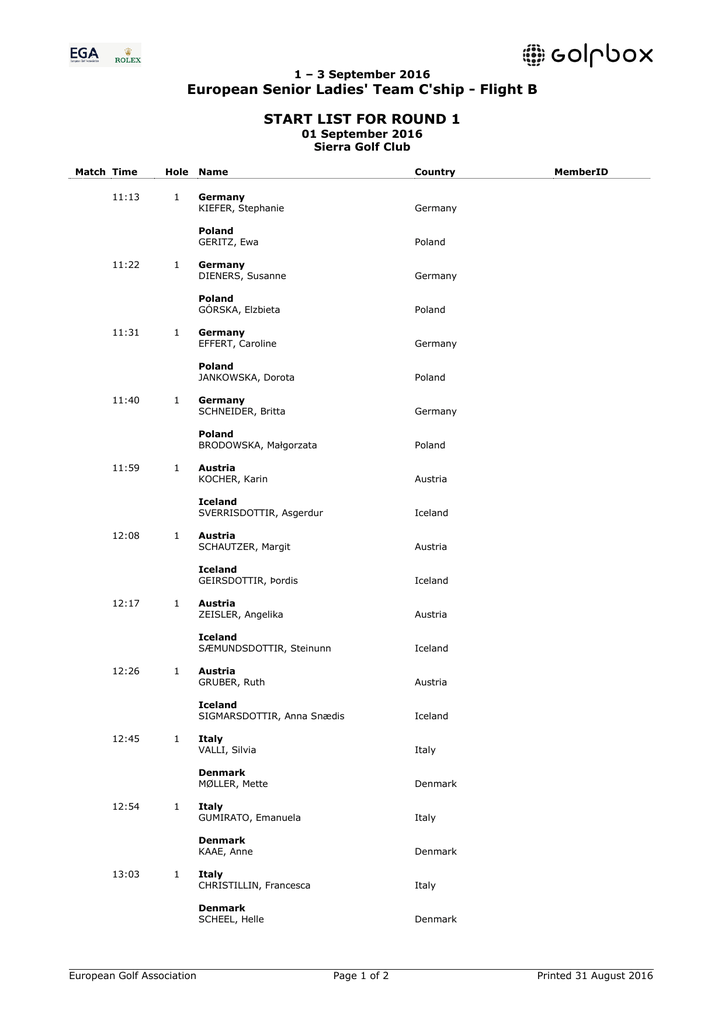 1 – 3 September 2016 European Senior Ladies' Team C'ship - Flight B START LIST FOR ROUND 1 01 September 2016 Sierra Golf Club Match Time 11:13 11:22 11:31 11:40 11:59 12:08 12:17 12:26 12:45 12:54 13:03 Hole 1 1 1 1 1 1 1 1 1 1 1 European Golf Association Name Country Germany KIEFER, Stephanie Germany Poland GERITZ, Ewa Poland Germany DIENERS, Susanne Germany Poland GÓRSKA, Elzbieta Poland Germany EFFERT, Caroline Germany Poland JANKOWSKA, Dorota Poland Germany SCHNEIDER, Britta Germany Poland BRODOWSKA, Małgorzata Poland Austria KOCHER, Karin Austria Iceland SVERRISDOTTIR, Asgerdur Iceland Austria SCHAUTZER, Margit Austria Iceland GEIRSDOTTIR, Þordis Iceland Austria ZEISLER, Angelika Austria Iceland SÆMUNDSDOTTIR, Steinunn Iceland Austria GRUBER, Ruth Austria Iceland SIGMARSDOTTIR, Anna Snædis Iceland Italy VALLI, Silvia Italy Denmark MØLLER, Mette Denmark Italy GUMIRATO, Emanuela Italy Denmark KAAE, Anne Denmark Italy CHRISTILLIN, Francesca Italy Denmark SCHEEL, Helle Denmark Page 1 of 2 MemberID Printed 31 August 2016 1 – 3 September 2016 European Senior Ladies' Team C'ship - Flight B START LIST FOR ROUND 1 01 September 2016 Sierra Golf Club Match Time 13:12 13:31 13:40 13:49 13:58 Hole 1 1 1 1 1 European Golf Association Name Country Italy PRETI MOAVERO, Guenda Italy Denmark BUNDGAAARD, Adalena Denmark Scotland DEVRIES, Fiona Scotland Czech Republic ŠIMKOVA, Michaela Czech Republic Scotland KYLE, Gillian Scotland Czech Republic DZURENDA, Anna Czech Republic Scotland LLOYD, Lesley Scotland Czech Republic DĚDEČKOVA, Blanka Czech Republic Scotland MCKINLAY, Lorna Scotland Czech Republic NOVAKOVA, Ivana Czech Republic Page 2 of 2 MemberID Printed 31 August 2016