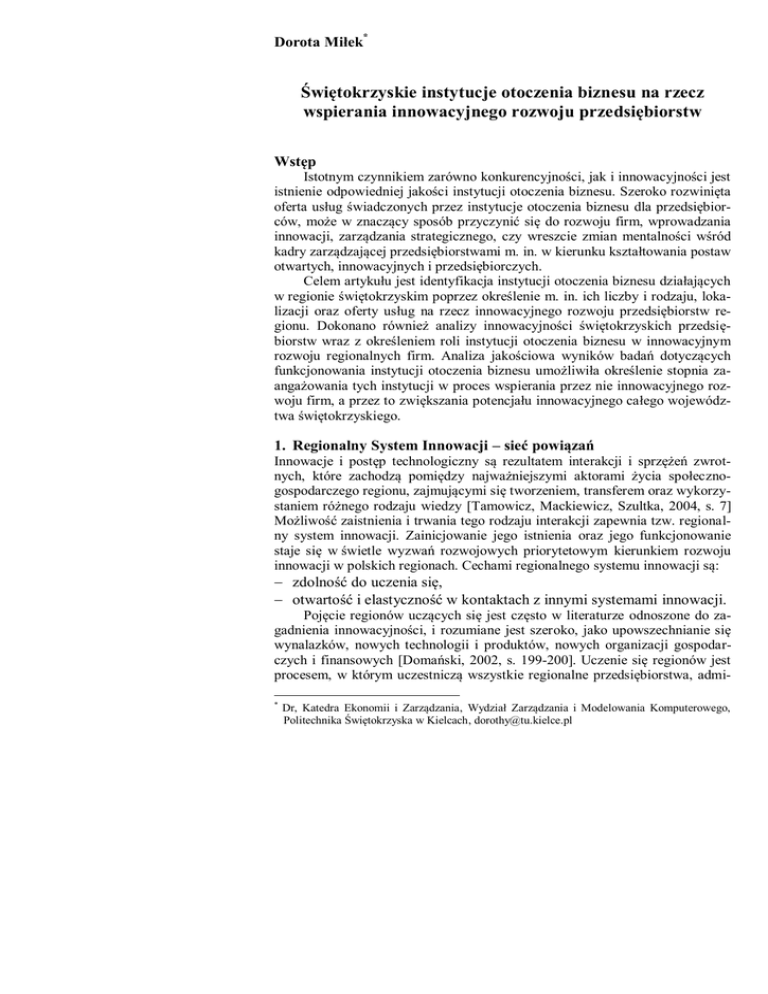 Dorota Miłek* Świętokrzyskie instytucje otoczenia biznesu na rzecz wspierania innowacyjnego rozwoju przedsiębiorstw Wstęp Istotnym czynnikiem zarówno konkurencyjności, jak i innowacyjności jest istnienie odpowiedniej jakości instytucji otoczenia biznesu. Szeroko rozwinięta oferta usług świadczonych przez instytucje otoczenia biznesu dla przedsiębiorców, może w znaczący sposób przyczynić się do rozwoju firm, wprowadzania innowacji, zarządzania strategicznego, czy wreszcie zmian mentalności wśród kadry zarządzającej przedsiębiorstwami m. in. w kierunku kształtowania postaw otwartych, innowacyjnych i przedsiębiorczych. Celem artykułu jest identyfikacja instytucji otoczenia biznesu działających w regionie świętokrzyskim poprzez określenie m. in. ich liczby i rodzaju, lokalizacji oraz oferty usług na rzecz innowacyjnego rozwoju przedsiębiorstw regionu. Dokonano również analizy innowacyjności świętokrzyskich przedsiębiorstw wraz z określeniem roli instytucji otoczenia biznesu w innowacyjnym rozwoju regionalnych firm. Analiza jakościowa wyników badań dotyczących funkcjonowania instytucji otoczenia biznesu umożliwiła określenie stopnia zaangażowania tych instytucji w proces wspierania przez nie innowacyjnego rozwoju firm, a przez to zwiększania potencjału innowacyjnego całego województwa świętokrzyskiego. 1. Regionalny System Innowacji – sieć powiązań Innowacje i postęp technologiczny są rezultatem interakcji i sprzężeń zwrotnych, które zachodzą pomiędzy najważniejszymi aktorami życia społecznogospodarczego regionu, zajmującymi się tworzeniem, transferem oraz wykorzystaniem różnego rodzaju wiedzy [Tamowicz, Mackiewicz, Szultka, 2004, s. 7] Możliwość zaistnienia i trwania tego rodzaju interakcji zapewnia tzw. regionalny system innowacji. Zainicjowanie jego istnienia oraz jego funkcjonowanie staje się w świetle wyzwań rozwojowych priorytetowym kierunkiem rozwoju innowacji w polskich regionach. Cechami regionalnego systemu innowacji są: zdolność do uczenia się, otwartość i elastyczność w kontaktach z innymi systemami innowacji. Pojęcie regionów uczących się jest często w literaturze odnoszone do zagadnienia innowacyjności, i rozumiane jest szeroko, jako upowszechnianie się wynalazków, nowych technologii i produktów, nowych organizacji gospodarczych i finansowych [Domański, 2002, s. 199-200]. Uczenie się regionów jest procesem, w którym uczestniczą wszystkie regionalne przedsiębiorstwa, admi* Dr, Katedra Ekonomii i Zarządzania, Wydział Zarządzania i Modelowania Komputerowego, Politechnika Świętokrzyska w Kielcach, [email protected] 168 Dorota Miłek nistracja samorządowa i rządowa, organizacje samorządu gospodarczego, wyższe uczelnie, instytuty badawcze i instytucje społeczne. Zdolność regionów do uczenia się ma znaczny wpływ na rozwój systemu innowacji. Zapewnia bowiem umiejętne i trafne definiowanie silnych i słabych stron gospodarki regionalnej, identyfikowanie priorytetów, współpracę poszczególnych jednostek i całej społeczności regionalnej na rzecz rozwoju regionu. W regionie innowacyjnym, wytwarzanie wiedzy następuje więc, dzięki społecznemu procesowi interakcji i współpracy, a siła i rola regionalnego systemu innowacji, jak stwierdza M. Miedziński, jest funkcją procesu uczenia się [Miedziński, 2001, s. 211]. W dobie globalizacji procesy innowacji nie są ograniczone przestrzennie, muszą zatem cechować się otwartością i elastycznością w interakcjach z innymi regionalnymi systemami innowacji zarówno w ujęciu krajowym, jak i międzynarodowym. O sukcesie regionalnego systemu innowacji decyduje też płynny przepływ wiedzy i informacji pomiędzy instytucjami zaangażowanymi w proces innowacyjny w regionie. Im większa jest siła i częstotliwość tych interakcji, tym system jest sprawniejszy, zapewniając konkurencyjną pozycję województwa na arenie krajowej i międzynarodowej. Istnienie i funkcjonowanie regionalnych systemów innowacji ma decydujące znaczenie dla rozwoju społeczno-gospodarczego województw. W procesie globalizacji uwidacznia się wzrost znaczenia regionów w kształtowaniu życia społeczno-gospodarczego oraz politycznego. Dlatego regiony coraz częściej same kształtują i prowadzą własne polityki proinnowacyjne. Ponadto, jak dowodzą badania empiryczne prowadzone w Unii Europejskiej [Tamowicz, Mackiewicz, Szultka, 2004, s. 7-8], znaczna część interakcji pomiędzy przedsiębiorstwami a sferą badawczo-rozwojową, zachodzi na poziomie regionalnym. Związane jest to zarówno z faktem bliskości przestrzennej lokalizacji tych podmiotów, jak również zaufaniem w stosunku do partnerów z tego samego regionu. O możliwości istnienia regionów w XXI wieku będzie decydowała, zdaniem A. Kuklińskiego [Tamowicz, Mackiewicz, Szultka, 2004, s. 9] zdolność do bycia regionalnym systemem innowacji. Regionalny system innowacji traktowany jest zatem jako zasadnicze ogniwo wewnętrznej i zewnętrznej dla regionu integracji gospodarki i nauki. Regionalne systemy innowacji służyć mają przede wszystkim wprowadzaniu w regionie innowacji zwiększających konkurencyjność gospodarki i polepszających jakość życia społeczeństwa. Ich zadaniem jest przekształcanie systemu badawczo–rozwojowego ze skierowanego do wewnątrz w zorientowany na potrzeby kraju (regionu) oraz z gospodarki opartej na pracy i kapitale w gospodarkę opartą na wiedzy, a także zwiększanie wzajemnych powiązań między nauką, techniką, administracją państwową i terytorialną organizacjami pozarządowymi a także edukacją. Podstawą jego działania jest istnienie powiązań sieciowych oraz środowiska innowacji [Innowacje…, 2005, 142-143]. System stanowi płaszczyznę stałej współpracy różnych organizacji w postaci sieci powiązań gospodarczych i społecznych. Świętokrzyskie instytucje otoczenia biznesu na rzecz wspierania… 169 Należy
