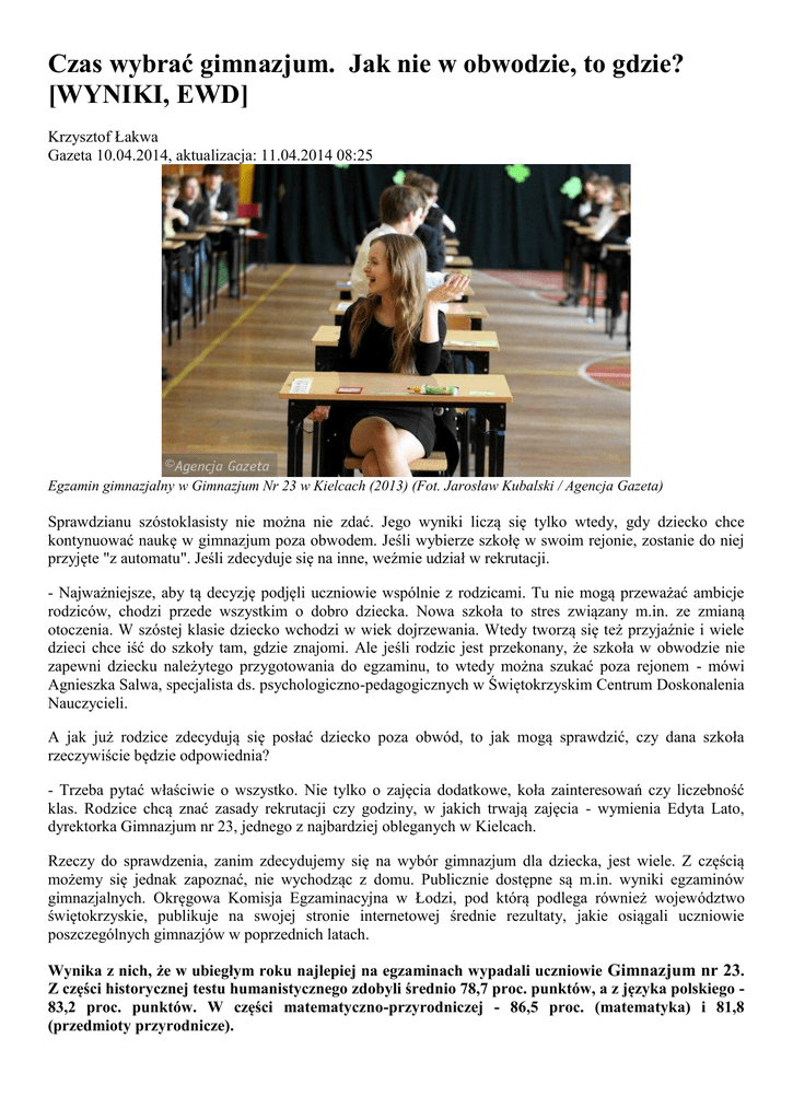 Czas wybrać gimnazjum. Jak nie w obwodzie, to gdzie? [WYNIKI, EWD] Krzysztof Łakwa Gazeta 10.04.2014, aktualizacja: 11.04.2014 08:25 Egzamin gimnazjalny w Gimnazjum Nr 23 w Kielcach (2013) (Fot. Jarosław Kubalski / Agencja Gazeta) Sprawdzianu szóstoklasisty nie można nie zdać. Jego wyniki liczą się tylko wtedy, gdy dziecko chce kontynuować naukę w gimnazjum poza obwodem. Jeśli wybierze szkołę w swoim rejonie, zostanie do niej przyjęte "z automatu". Jeśli zdecyduje się na inne, weźmie udział w rekrutacji. - Najważniejsze, aby tą decyzję podjęli uczniowie wspólnie z rodzicami. Tu nie mogą przeważać ambicje rodziców, chodzi przede wszystkim o dobro dziecka. Nowa szkoła to stres związany m.in. ze zmianą otoczenia. W szóstej klasie dziecko wchodzi w wiek dojrzewania. Wtedy tworzą się też przyjaźnie i wiele dzieci chce iść do szkoły tam, gdzie znajomi. Ale jeśli rodzic jest przekonany, że szkoła w obwodzie nie zapewni dziecku należytego przygotowania do egzaminu, to wtedy można szukać poza rejonem - mówi Agnieszka Salwa, specjalista ds. psychologiczno-pedagogicznych w Świętokrzyskim Centrum Doskonalenia Nauczycieli. A jak już rodzice zdecydują się posłać dziecko poza obwód, to jak mogą sprawdzić, czy dana szkoła rzeczywiście będzie odpowiednia? - Trzeba pytać właściwie o wszystko. Nie tylko o zajęcia dodatkowe, koła zainteresowań czy liczebność klas. Rodzice chcą znać zasady rekrutacji czy godziny, w jakich trwają zajęcia - wymienia Edyta Lato, dyrektorka Gimnazjum nr 23, jednego z najbardziej obleganych w Kielcach. Rzeczy do sprawdzenia, zanim zdecydujemy się na wybór gimnazjum dla dziecka, jest wiele. Z częścią możemy się jednak zapoznać, nie wychodząc z domu. Publicznie dostępne są m.in. wyniki egzaminów gimnazjalnych. Okręgowa Komisja Egzaminacyjna w Łodzi, pod którą podlega również województwo świętokrzyskie, publikuje na swojej stronie internetowej średnie rezultaty, jakie osiągali uczniowie poszczególnych gimnazjów w poprzednich latach. Wynika z nich, że w ubiegłym roku najlepiej na egzaminach wypadali uczniowie Gimnazjum nr 23. Z części historycznej testu humanistycznego zdobyli średnio 78,7 proc. punktów, a z języka polskiego 83,2 proc. punktów. W części matematyczno-przyrodniczej - 86,5 proc. (matematyka) i 81,8 (przedmioty przyrodnicze). Wśród kieleckich szkół niepublicznych od lat bezkonkurencyjny pozostaje Gimnazjum im. Św. Jadwigi Królowej. Uczniowie prowadzeni przez siostry nazaretanki na egzaminie humanistycznym zdobyli w ubiegłym roku 84,6 proc. punktów (historia) i 88 proc. (język polski). Imponująco wyglądają również ich wyniki na drugim egzaminie. Osiągnęli średnio 92,2 proc. z matematyki i 90,5 z przedmiotów przyrodniczych. Pomocną informacją przy wyborze gimnazjum mogą być wskaźniki tzw. Edukacyjnej Wartości Dodanej. Wylicza ją CKE w oparciu o dane z egzaminów. W przypadku gimnazjów porównuje się postępy, jakie uczniowie zrobili między sprawdzianem szóstoklasisty, a egzaminem na koniec gimnazjum. W zależności od wyników szkoły zostają przydzielone do czterech kategorii: szkoła sukcesu, wspierająca, niewykorzystanych możliwości i wymagająca pomocy. Z danych CKE wynika, że większość kieleckich gimnazjów wspiera rozwój uczniów. Najbardziej udaje się to w "Nazarecie" i Gimnazjum nr 23. Z wykresami prezentującymi EWD poszczególnych placówek można się zapoznać na ewd.edu.pl. - Najlepszym źródłem informacji są jednak inni rodzice, których dzieci już uczą się w danej szkole. Oni mogą powiedzieć, jaka atmosfera tam panuje i jak dzieciom udało się zaaklimatyzować - podkreśla Agnieszka Salwa. Podobnego zdania jest Edyta Lato. - Nie ma super dobrej szkoły czy całkowicie złej. Wszystko zależy od grupy uczniów, jaka do niej przyjdzie. Dla jednego ucznia dana szkoła może okazać się dobrym wyborem, a dla innego nie - podkreśla dyrektorka Gimnazjum nr 23. Jak uczą w szkołach, czyli Edukacyjna Wartość Dodana Egzamin humanistyczny Szkoły sukcesu: Gimnazjum nr 3, Gimnazjum Integracyjne nr 4, Gimnazjum nr 6, Gimnazjum nr 7, Gimnazjum nr 8, Gimnazjum nr 9, Gimnazjum nr 10, Gimnazjum nr 11, Gimnazjum nr 12, Gimnazjum nr 15, Gimnazjum nr 16, Gimnazjum nr 23, Gimnazjum nr 26, Gimnazjum im. św. Jadwigi Królowej, Gimnazjum Językowe, Katolickie Gimnazjum im. św. Stanisława Kostki, I Społeczne Gimnazjum, Gimnazjum Plastyczne Szkoły wspierające: Gimnazjum nr 2 Szkoły wymagające pomocy: Gimnazjum nr 1, Gimnazjum nr 5, Gimnazjum nr 13, Gimnazjum nr 14, Gimnazjum nr 24, Gimnazjum nr 25, Gimnazjum Niepubliczne Egzamin matematyczno-przyrodniczy: Szkoły sukcesu: Gimnazjum Integracyjne nr 4, Gimnazjum nr 8, Gimnazjum nr 10, Gimnazjum nr 12, Gimnazjum nr 15, Gimnazjum nr 16, Gimnazjum nr 23, Gimnazjum nr 26, Gimnazjum im. św. Jadwigi Królowej, Gimnazjum Językowe, Katolickie Gimnazjum im. św. Stanisława Kostki, I Społeczne Gimnazjum Szkoły wspierające: Gimnazjum nr 2 Szkoły niewykorzystanych możliwości: Gimnazjum nr 7, Gimnazjum nr 9, Gimnazjum Plastyczne Szkoły wymagające pomocy: Gimnazjum nr 1, Gimnazjum nr 3, Gimnazjum nr 5, Gimnazjum nr 6, Gimnazjum nr 13, Gimnazjum nr 14, Gimnazjum nr 24, Gimnazjum nr 25, Gimnazjum Niepubliczne Średnie wyniki uczniów kieleckich gimnazjów na egzaminie w 2013 Nazwa Gimnazjum nr 23 Gimnazjum nr 14 Gimnazjum nr 6 Gimnazjum nr 9 Gimnazjum nr 3 Plastyk Gimnazjum nr 15 Gimnazjum nr 11 Gimnazjum nr 1 Gimnazjum nr 12 Gimnazjum nr 13 Gimnazjum nr 7 Gimnazjum nr 8 Gimnazjum nr 5 Gimnazjum nr 2 Gimnazjum nr 16 Gimnazjum Integr. nr 4 Gimnazjum nr 10 Gimnazjum nr 26 Gimnazjum nr 24 Gimnazjum nr 25 „Plastyk” GH-H 78,7 GH-P 83,2 Suma H 161,9 GM-M 86,5 GM-P 81,8 Suma P 168,3 SUMA 330,2 54,6 53,9 108,5 32,0 50,2 82,2 190,7 58,0 64,1 122,1 46,3 62,6 108,9 231,0 59,5 66,1 125,6 47,5 60,1 107,6 233,2 57,6 66,1 123,7 45,4 61,6 107 230,7 66,9 56,4 79,0 69,1 145,9 125,5 51,1 49,
