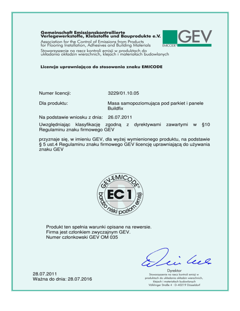 Numer licencji: 3229/01.10.05 Dla produktu: Masa samopoziomująca pod parkiet i panele Buildfix Na podstawie wniosku z dnia: 26.07.2011 Uwzględniając klasyfikację zgodną Regulaminu znaku firmowego GEV z dyrektywami zawartymi w §10 przyznaje się, w imieniu GEV, dla wyżej wymienionego produktu, na podstawie § 5 ust.4 Regulaminu znaku firmowego GEV licencję uprawniającą do używania znaku GEV Produkt ten spełnia warunki opisane na rewersie. Firma jest członkiem zwyczajnym GEV. Numer członkowski GEV OM 035 28.07.2011 Ważna do dnia: 28.07.2016 Wytyczne dotyczące warunków otrzymania licencji EMICODE Wymieniony na stronie głównej licencji produkt spełnia, zgodnie ze statutem i dyrektywami Rady Technicznej GEV, następujące warunki: • Produkt ten odpowiada przepisom prawnym, w szczególności Ustawie o preparatach chemicznych wraz ze wszystkimi związanymi z nią rozporządzeniami. • Produkt ten jest wolny od rozpuszczalników zgodnie z zasadami bezpieczeństwa i higieny pracy. • Dla wymienionego produktu została opracowana Karta charakterystyki chemicznego zgodna z obowiązującymi rozporządzeniami w aktualnej wersji. preparatu • Substancje rakotwórcze, o działaniu szkodliwym dla płodności lub płodu ludzkiego, bądź substancje podejrzane, iż takie działanie mogłyby mieć, nie były wykorzystywane przy produkcji tego wyrobu. • Badanie produktu do układania okładzin wierzchnich przeprowadza się według procedur zwanych metodą badawczą GEV. Badanie to polega na określeniu zawartości VOC w komorach badawczych metodą termodesorpcji Tenax z wykorzystaniem techniki spektrometrii masowej sprzężonej z chromatografią gazową. • Klasyfikacja na poszczególne klasy EMICODE następuje na podstawie poziomu emisji VOC. Do oznaczania produktów stosuje się następujące klasy: EMICODE Produkty EC 1 PLUS EC 1 EC 2 TVOC/TSVOC28d i µg/m³ 1. 1.1 1.2 1.3 1.4 Produkty płynne Podkłady gruntujące Kleje i środki przylepcowe o niskiej lepkości Izolacje i bariery przeciwwilgociowe Powłoki przeciwwilgociowe i elastyczne powłoki uszczelniające 2. 2.1 2.2 2.3 Produkty mineralne Szpachlówki cementowe oraz gipsowe Zaprawy do murowania na cieńkie spoiny oraz do fugowania Cementowe zaprawy uszczelniające z niską zawartością polimerów 3. Produkty elastyczne oraz Produkty z dużą zawartością spoiw organicznych Kleje do motażu okładzin wierzchnich Elastyczne środki przylepcowe Szpachlówki dyspersyjne lub na bazie żywic reakcyjnych Produkty w postaci proszku z dużą zawartością spoiw organicznych Produkty w postaci nie wymagającej chemicznych reakcji i procesu suszenia 3.1 3.2 3.3 3.4 4. po 3 dniach po 3 dniach po 3 dniach < 750 TVOC; < 1000 TVOC; < 3000 TVOC; po 28 dniach po 28 dniach po 28 dniach < 60 TVOC / < 100 TVOC / < 300 TVOC / < 40 TSVOC < 50 TSVOC < 100 TSVOC < 150 Σ TVVOC, TVOC, TSVOC < 450 Σ TVVOC, TVOC, TSVOC 4.1 4.2 4.3 4.4 5. 5.1 Podkłady Izolacje Samoprzylepne podkłady I taśmy klejące Maty odsprzęglające Uszczelniacze i izolacje przeciwwodne, taśmy klejące Materiały uszczelniające dyspersyjne lub na bazie żywic reakcyjnych 5.2 Środki izolacyjne do fug 5.3 Skompresowane taśmy uszczelniające 5.4 Folie uszczelniające 6. Wyroby do konserwacji i zabezpieczania podłóg drewnianych 6.1 Lakiery do parkietu na bazie wody nieosiągalny * TVOC = Total Volatile Organic Compounds (suma lotnych substancji organicznych) Wersja z dnia: 27.07.2011