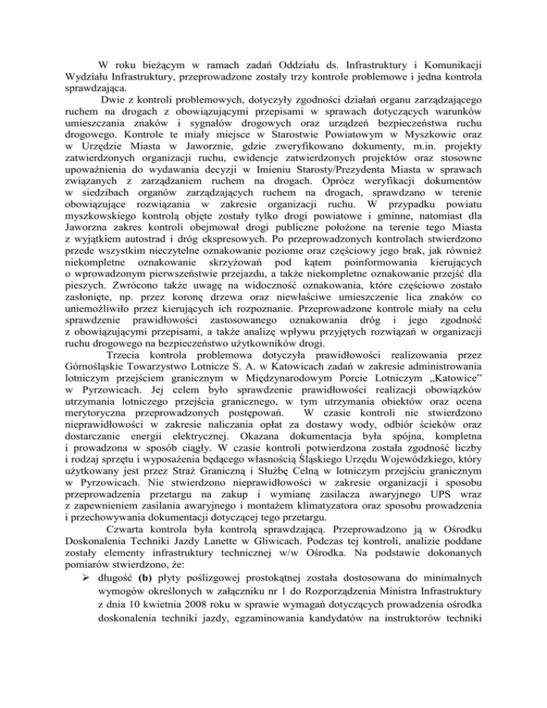 W roku bieŜącym w ramach zadań Oddziału ds. Infrastruktury i Komunikacji Wydziału Infrastruktury, przeprowadzone zostały trzy kontrole problemowe i jedna kontrola sprawdzająca. Dwie z kontroli problemowych, dotyczyły zgodności działań organu zarządzającego ruchem na drogach z obowiązującymi przepisami w sprawach dotyczących warunków umieszczania znaków i sygnałów drogowych oraz urządzeń bezpieczeństwa ruchu drogowego. Kontrole te miały miejsce w Starostwie Powiatowym w Myszkowie oraz w Urzędzie Miasta w Jaworznie, gdzie zweryfikowano dokumenty, m.in. projekty zatwierdzonych organizacji ruchu, ewidencje zatwierdzonych projektów oraz stosowne upowaŜnienia do wydawania decyzji w Imieniu Starosty/Prezydenta Miasta w sprawach związanych z zarządzaniem ruchem na drogach. Oprócz weryfikacji dokumentów w siedzibach organów zarządzających ruchem na drogach, sprawdzano w terenie obowiązujące rozwiązania w zakresie organizacji ruchu. W przypadku powiatu myszkowskiego kontrolą objęte zostały tylko drogi powiatowe i gminne, natomiast dla Jaworzna zakres kontroli obejmował drogi publiczne połoŜone na terenie tego Miasta z wyjątkiem autostrad i dróg ekspresowych. Po przeprowadzonych kontrolach stwierdzono przede wszystkim nieczytelne oznakowanie poziome oraz częściowy jego brak, jak równieŜ niekompletne oznakowanie skrzyŜowań pod kątem poinformowania kierujących o wprowadzonym pierwszeństwie przejazdu, a takŜe niekompletne oznakowanie przejść dla pieszych. Zwrócono takŜe uwagę na widoczność oznakowania, które częściowo zostało zasłonięte, np. przez koronę drzewa oraz niewłaściwe umieszczenie lica znaków co uniemoŜliwiło przez kierujących ich rozpoznanie. Przeprowadzone kontrole miały na celu sprawdzenie prawidłowości zastosowanego oznakowania dróg i jego zgodność z obowiązującymi przepisami, a takŜe analizę wpływu przyjętych rozwiązań w organizacji ruchu drogowego na bezpieczeństwo uŜytkowników drogi. Trzecia kontrola problemowa dotyczyła prawidłowości realizowania przez Górnośląskie Towarzystwo Lotnicze S. A. w Katowicach zadań w zakresie administrowania lotniczym przejściem granicznym w Międzynarodowym Porcie Lotniczym „Katowice” w Pyrzowicach. Jej celem było sprawdzenie prawidłowości realizacji obowiązków utrzymania lotniczego przejścia granicznego, w tym utrzymania obiektów oraz ocena merytoryczna przeprowadzonych postępowań. W czasie kontroli nie stwierdzono nieprawidłowości w zakresie naliczania opłat za dostawy wody, odbiór ścieków oraz dostarczanie energii elektrycznej. Okazana dokumentacja była spójna, kompletna i prowadzona w sposób ciągły. W czasie kontroli potwierdzona została zgodność liczby i rodzaj sprzętu i wyposaŜenia będącego własnością Śląskiego Urzędu Wojewódzkiego, który uŜytkowany jest przez StraŜ Graniczną i SłuŜbę Celną w lotniczym przejściu granicznym w Pyrzowicach. Nie stwierdzono nieprawidłowości w zakresie organizacji i sposobu przeprowadzenia przetargu na zakup i wymianę zasilacza awaryjnego UPS wraz z zapewnieniem zasilania awaryjnego i montaŜem klimatyzatora oraz sposobu prowadzenia i przechowywania dokumentacji dotyczącej tego przetargu. Czwarta kontrola była kontrolą sprawdzającą. Przeprowadzono ją w Ośrodku Doskonalenia Techniki Jazdy Lanette w Gliwicach. Podczas tej kontroli, analizie poddane zostały elementy infrastruktury technicznej w/w Ośrodka. Na podstawie dokonanych pomiarów stwierdzono, Ŝe: długość (b) płyty poślizgowej prostokątnej została dostosowana do minimalnych wymogów określonych w załączniku nr 1 do Rozporządzenia Ministra Infrastruktury z dnia 10 kwietnia 2008 roku w sprawie wymagań dotyczących prowadzenia ośrodka doskonalenia techniki jazdy, egzaminowania kandydatów na instruktorów techniki jazdy, postępowania z dokumentacją związaną z prowadzeniem szkoleń oraz wzorów stosowanych dokumentów (Dz. U. Nr 77, poz. 458 ze zm.) i wynosi 70 m. szerokość (a) płyty poślizgowej prostokątnej licząc od drogi dojazdowej po dokonanych korektach wynosi: a) 7 metrów na pierwszych 13 metrach długości płyty, b) 12 metrów na pozostałych 57 metrach długości płyty. Zgodnie równieŜ z zaleceniami oznaczone zostały krawędzie wykorzystywanej do celów szkoleniowych płyty poślizgowej stanowiącej wycinek pierścienia, która w części wpisana jest w obszar płyty poślizgowej prostokątnej. Krawędzie - wewnętrzna i zewnętrzna płyty o wycinku koła na powierzchni przecięcia z płytą prostokątną zostały oznaczone linią przerywaną. Kierownik Ośrodka Doskonalenia Techniki Jazdy podjął równieŜ działania mające na celu dostosowanie przestrzeni strefy bezpieczeństwa znajdującej się za płytą poślizgową prostokątną do wytycznych, jakie zawarto w Załączniku nr 1 do cyt. rozporządzenia Ministra Infrastruktury. Zgodnie z zaleceniami, z obszaru analizowanej strefy usunięte zostały zakopane do połowy swej wysokości opony samochodowe mogące doprowadzić do wywrócenia pojazdu podczas prowadzonych ćwiczeń. Podjęte czynności kontrolne wykazały jednak, iŜ powierzchnia przedmiotowej strefy bezpieczeństwa nie została wyrównana. Podczas składania wyjaśnień Kierownik Ośrodka poinformował, iŜ pozostawienie nierówności w obszarze strefy bezpieczeństwa znajdującej się za płytą poślizgową prostokątną wynika z błędnie przeprowadzonej przez Niego interpretacji wytycznych cyt. rozporządzenia w zakresie wymagań dla obiektu szkoleniowego ośrodka doskonalenia techniki jazdy. Kierownik Ośrodka, za spełnienie wymogu w tym zakresie uznał wyłącznie zapewnienie w strefie bezpieczeństwa wolnej od przeszkód - mogących doprowadzić do wywrócenia pojazdu - przestrzeni. Wyjaśnił równieŜ, iŜ niezwłocznie podejmie stosowne działania mające na celu wyrównanie obszaru strefy bezpieczeństwa. Podczas kontroli poruszona została równie