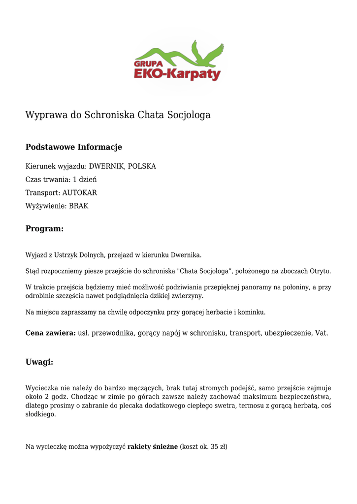 Wyprawa do Schroniska Chata Socjologa Podstawowe Informacje Kierunek wyjazdu: DWERNIK, POLSKA Czas trwania: 1 dzień Transport: AUTOKAR Wyżywienie: BRAK Program: Wyjazd z Ustrzyk Dolnych, przejazd w kierunku Dwernika. Stąd rozpoczniemy piesze przejście do schroniska "Chata Socjologa”, położonego na zboczach Otrytu. W trakcie przejścia będziemy mieć możliwość podziwiania przepięknej panoramy na połoniny, a przy odrobinie szczęścia nawet podglądnięcia dzikiej zwierzyny. Na miejscu zapraszamy na chwilę odpoczynku przy gorącej herbacie i kominku. Cena zawiera: usł. przewodnika, gorący napój w schronisku, transport, ubezpieczenie, Vat. Uwagi: Wycieczka nie należy do bardzo męczących, brak tutaj stromych podejść, samo przejście zajmuje około 2 godz. Chodząc w zimie po górach zawsze należy zachować maksimum bezpieczeństwa, dlatego prosimy o zabranie do plecaka dodatkowego ciepłego swetra, termosu z gorącą herbatą, coś słodkiego. Na wycieczkę można wypożyczyć rakiety śnieżne (koszt ok. 35 zł) * przy grupach zorganizowanych wysokie rabaty, informacja w biurze Ustjanowa Górna Grupa Eko-Karpaty Sp. z o.o. Ustjanowa Górna 242H 38-700 Ustrzyki Dolne tel/fax +48 13 461 36 45 kom. +48 512 226 481 www.eko-karpaty.com [email protected] [email protected] NIP 6891190518 Ustrzyki Dolne Grupa Eko-Karpaty ul. Rynek 19 38-700 Ustrzyki Dolne tel. +48 13 461 10 09 tel./fax +48 13 461 36 46 kom. +48 512 226 481 www.eko-karpaty.com [email protected] [email protected] NIP 6891190518 Lwów Trident - Eko-Karpaty ul. Kopernika 18 79000 Lviv tel. +38 032 298 9114 www.eko-karpaty.com [email protected] [email protected]