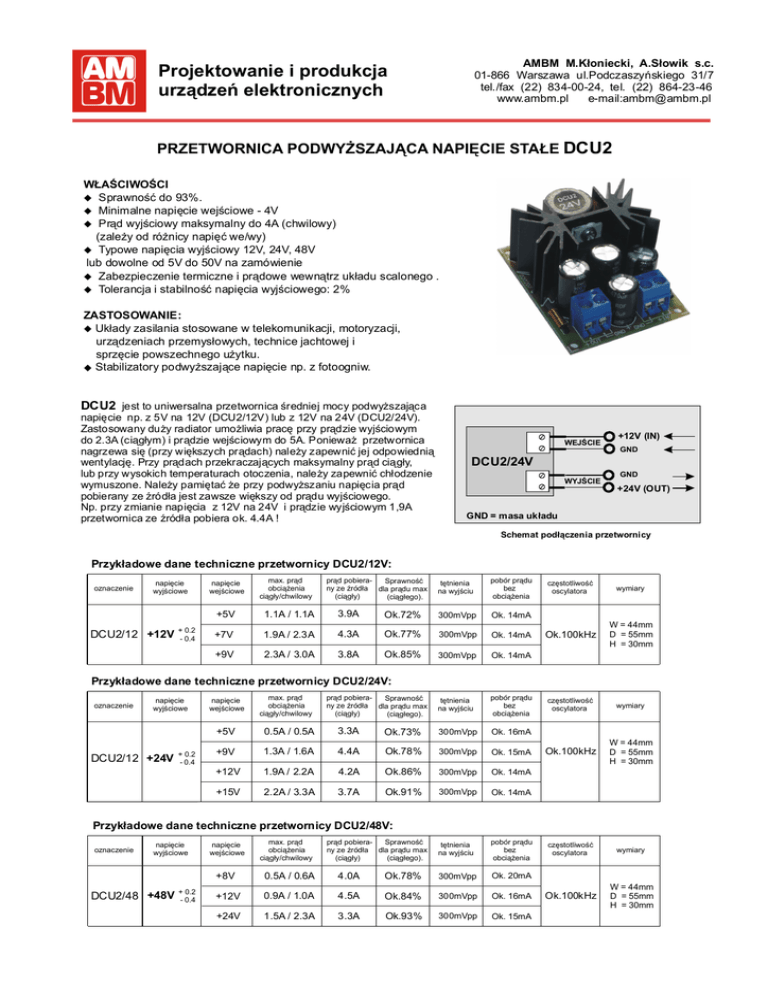 AMBM M.Kłoniecki, A.Słowik s.c. 01-866 Warszawa ul.Podczaszyńskiego 31/7 tel./fax (22) 834-00-24, tel. (22) 864-23-46 www.ambm.pl e-mail:[email protected] Projektowanie i produkcja urządzeń elektronicznych PRZETWORNICA PODWYŻSZAJĄCA NAPIĘCIE STAŁE DCU2 WŁAŚCIWOŚCI Sprawność do 93%. Minimalne napięcie wejściowe - 4V Prąd wyjściowy maksymalny do 4A (chwilowy) (zależy od różnicy napięć we/wy) Typowe napięcia wyjściowy 12V, 24V, 48V lub dowolne od 5V do 50V na zamówienie Zabezpieczenie termiczne i prądowe wewnątrz układu scalonego . Tolerancja i stabilność napięcia wyjściowego: 2% ZASTOSOWANIE: Układy zasilania stosowane w telekomunikacji, motoryzacji, urządzeniach przemysłowych, technice jachtowej i sprzęcie powszechnego użytku. Stabilizatory podwyższające napięcie np. z fotoogniw. DCU2 jest to uniwersalna przetwornica średniej mocy podwyższająca napięcie np. z 5V na 12V (DCU2/12V) lub z 12V na 24V (DCU2/24V). Zastosowany duży radiator umożliwia pracę przy prądzie wyjściowym do 2.3A (ciągłym) i prądzie wejściowym do 5A. Ponieważ przetwornica nagrzewa się (przy większych prądach) należy zapewnić jej odpowiednią wentylację. Przy prądach przekraczających maksymalny prąd ciągły, lub przy wysokich temperaturach otoczenia, należy zapewnić chłodzenie wymuszone. Należy pamiętać że przy podwyższaniu napięcia prąd pobierany ze źródła jest zawsze większy od prądu wyjściowego. Np. przy zmianie napięcia z 12V na 24V i prądzie wyjściowym 1,9A przetwornica ze źródła pobiera ok. 4.4A ! WEJŚCIE +12V (IN) GND DCU2/24V WYJŚCIE GND +24V (OUT) GND = masa układu Schemat podłączenia przetwornicy Przykładowe dane techniczne przetwornicy DCU2/12V: oznaczenie napięcie wyjściowe DCU2/12 +12V + 0.2 - 0.4 napięcie wejściowe max. prąd obciążenia ciągły/chwilowy prąd pobieraSprawność ny ze źródła dla prądu max (ciągły) (ciągłego). tętnienia na wyjściu pobór prądu bez obciążenia +5V 1.1A / 1.1A 3.9A Ok.72% 300mVpp Ok. 14mA +7V 1.9A / 2.3A 4.3A Ok.77% 300mVpp Ok. 14mA +9V 2.3A / 3.0A 3.8A Ok.85% 300mVpp Ok. 14mA tętnienia na wyjściu pobór prądu bez obciążenia częstotliwość oscylatora wymiary Ok.100kHz W = 44mm D = 55mm H = 30mm częstotliwość oscylatora wymiary Ok.100kHz W = 44mm D = 55mm H = 30mm częstotliwość oscylatora wymiary Ok.100kHz W = 44mm D = 55mm H = 30mm Przykładowe dane techniczne przetwornicy DCU2/24V: oznaczenie napięcie wyjściowe DCU2/12 +24V + 0.2 - 0.4 napięcie wejściowe max. prąd obciążenia ciągły/chwilowy prąd pobieraSprawność ny ze źródła dla prądu max (ciągły) (ciągłego). +5V 0.5A / 0.5A 3.3A Ok.73% 300mVpp Ok. 16mA +9V 1.3A / 1.6A 4.4A Ok.78% 300mVpp Ok. 15mA +12V 1.9A / 2.2A 4.2A Ok.86% 300mVpp Ok. 14mA +15V 2.2A / 3.3A 3.7A Ok.91% 300mVpp Ok. 14mA tętnienia na wyjściu pobór prądu bez obciążenia Przykładowe dane techniczne przetwornicy DCU2/48V: oznaczenie napięcie wyjściowe DCU2/48 +48V + 0.2 - 0.4 napięcie wejściowe max. prąd obciążenia ciągły/chwilowy prąd pobieraSprawność ny ze źródła dla prądu max (ciągły) (ciągłego). +8V 0.5A / 0.6A 4.0A Ok.78% 300mVpp Ok. 20mA +12V 0.9A / 1.0A 4.5A Ok.84% 300mVpp Ok. 16mA +24V 1.5A / 2.3A 3.3A Ok.93% 300mVpp Ok. 15mA U wyjściowe R2 R2A k.4 LM2587 R1 R1A R2 R1 R1A 7V5: 9V0: 12V0: 13V8: 15V0: 18V0: 24V0: 48V0: R1=1k6, R2=8k2 R1=1k6, R2=11k, R2A=130k R1=1k6, R2=15k, R2A=220k R1=1k6, R2=18k, R2A=180k R1=1k6, R2=18k R1=1k6, R2=22k, R2A=3M3 R1=1k6, R2=30k, R2A=2M7 R1=1k6, R2=62k, R2A=3M3 GND R2A U wy [V] = 1.23V ( 1 + R2/R1 ) R2 = R1 ( Uwy 1.23V -1 ) Powyżej fragment płytki DCU2 z zaznaczonymi rezystorami R1 i R2 ustalającymi napięcie wyjściowe. Rezystory dodatkowe R1A i R2A służą do korekcji napięcia w zależności od różnic między poszczególnymi egzemplarzami układów LM2587.