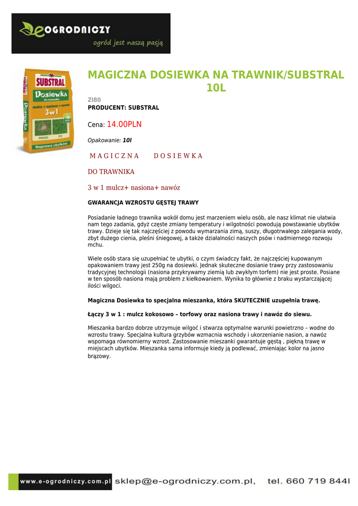 MAGICZNA DOSIEWKA NA TRAWNIK/SUBSTRAL 10L ZI80 PRODUCENT: SUBSTRAL Cena: 14.00PLN Opakowanie: 10l MAGICZNA DOSIEWKA DO TRAWNIKA 3 w 1 mulcz+ nasiona+ nawóz GWARANCJA WZROSTU GĘSTEJ TRAWY Posiadanie ładnego trawnika wokół domu jest marzeniem wielu osób, ale nasz klimat nie ułatwia nam tego zadania, gdyż częste zmiany temperatury i wilgotności powodują powstawanie ubytków trawy. Dzieje się tak najczęściej z powodu wymarzania zimą, suszy, długotrwałego zalegania wody, zbyt dużego cienia, pleśni śniegowej, a także działalności naszych psów i nadmiernego rozwoju mchu. Wiele osób stara się uzupełniać te ubytki, o czym świadczy fakt, że najczęściej kupowanym opakowaniem trawy jest 250g na dosiewki. Jednak skuteczne dosianie trawy przy zastosowaniu tradycyjnej technologii (nasiona przykrywamy ziemią lub zwykłym torfem) nie jest proste. Posiane w ten sposób nasiona mają problem z kiełkowaniem. Wynika to głównie z braku wystarczającej ilości wilgoci. Magiczna Dosiewka to specjalna mieszanka, która SKUTECZNIE uzupełnia trawę. Łączy 3 w 1 : mulcz kokosowo – torfowy oraz nasiona trawy i nawóz do siewu. Mieszanka bardzo dobrze utrzymuje wilgoć i stwarza optymalne warunki powietrzno – wodne do wzrostu trawy. Specjalna kultura grzybów wzmacnia wschody i ukorzenianie nasion, a nawóz wspomaga równomierny wzrost. Zastosowanie mieszanki gwarantuje gęstą , piękną trawę w miejscach ubytków. Mieszanka sama informuje kiedy ją podlewać, zmieniając kolor na jasno brązowy.