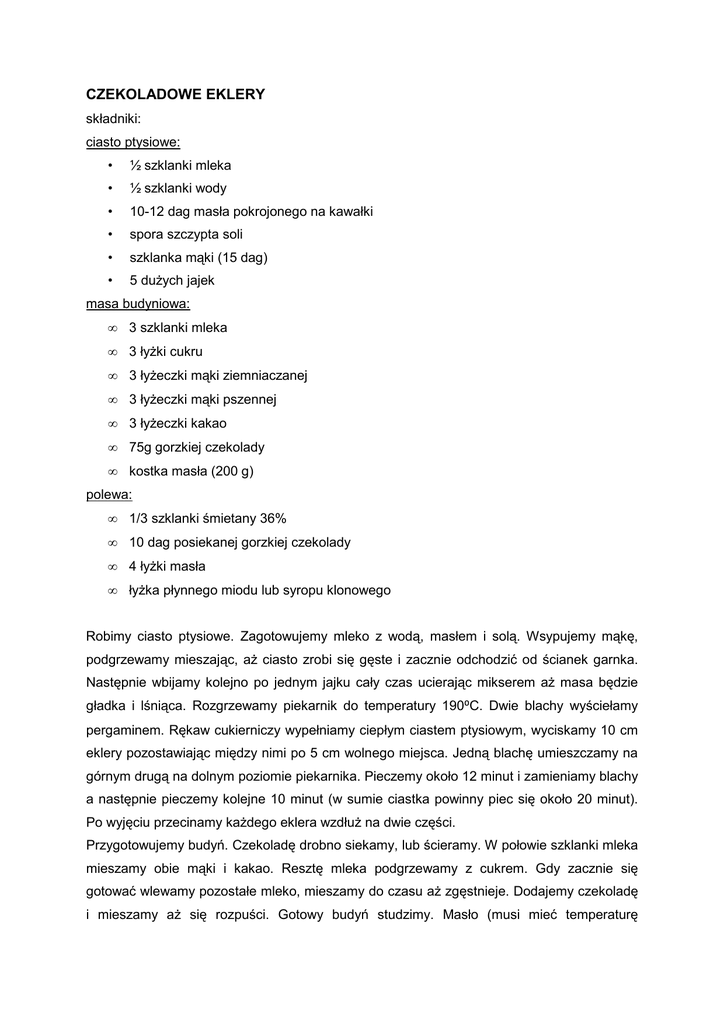 CZEKOLADOWE EKLERY składniki: ciasto ptysiowe: • ½ szklanki mleka • ½ szklanki wody • 10-12 dag masła pokrojonego na kawałki • spora szczypta soli • szklanka mąki (15 dag) • 5 dużych jajek masa budyniowa: • 3 szklanki mleka • 3 łyżki cukru • 3 łyżeczki mąki ziemniaczanej • 3 łyżeczki mąki pszennej • 3 łyżeczki kakao • 75g gorzkiej czekolady • kostka masła (200 g) polewa: • 1/3 szklanki śmietany 36% • 10 dag posiekanej gorzkiej czekolady • 4 łyżki masła • łyżka płynnego miodu lub syropu klonowego Robimy ciasto ptysiowe. Zagotowujemy mleko z wodą, masłem i solą. Wsypujemy mąkę, podgrzewamy mieszając, aż ciasto zrobi się gęste i zacznie odchodzić od ścianek garnka. Następnie wbijamy kolejno po jednym jajku cały czas ucierając mikserem aż masa będzie gładka i lśniąca. Rozgrzewamy piekarnik do temperatury 190⁰C. Dwie blachy wyściełamy pergaminem. Rękaw cukierniczy wypełniamy ciepłym ciastem ptysiowym, wyciskamy 10 cm eklery pozostawiając między nimi po 5 cm wolnego miejsca. Jedną blachę umieszczamy na górnym drugą na dolnym poziomie piekarnika. Pieczemy około 12 minut i zamieniamy blachy a następnie pieczemy kolejne 10 minut (w sumie ciastka powinny piec się około 20 minut). Po wyjęciu przecinamy każdego eklera wzdłuż na dwie części. Przygotowujemy budyń. Czekoladę drobno siekamy, lub ścieramy. W połowie szklanki mleka mieszamy obie mąki i kakao. Resztę mleka podgrzewamy z cukrem. Gdy zacznie się gotować wlewamy pozostałe mleko, mieszamy do czasu aż zgęstnieje. Dodajemy czekoladę i mieszamy aż się rozpuści. Gotowy budyń studzimy. Masło (musi mieć temperaturę pokojową) ucieramy na puszystą masę i stopniowo dodajemy budyń, dalej ucieramy tak by powstał gładki krem. Przygotowujemy polewę. Zagotowujemy śmietankę, zdejmujemy z ognia i powoli dodajemy posiekaną czekoladę, dokładnie mieszając. Następnie dodajemy po kawałku masło i na koniec miód lub syrop klonowy (nada polewie błysk). Wierzch eklerów smarujemy gorącą glazurą i pozostawiamy do zastygnięcia. Do spodów eklerek wkładamy porcje kremu, przykrywamy polanymi polewą czapeczkami i podajemy.