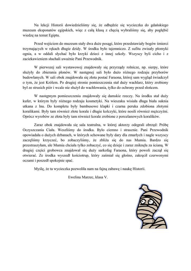 Na lekcji Historii dowiedzieliśmy się, że odbędzie się wycieczka do gdańskiego muzeum eksponatów egipskich, więc z całą klasą z chęcią wybraliśmy się, aby pogłębić wiedzę na temat Egiptu. Przed wejściem do muzeum stały dwa duże posągi, które przedstawiały bogów śmierci trzymających w rękach długie dzidy. W środku było tajemniczo. Z sufitu zwisały płomyki ognia, a w oddali słychać było krzyki dzieci z innej szkoły. Wszyscy byli cicho i z zaciekawieniem słuchali uważnie Pani Przewodnik. W pierwszej sali wystawowej znajdowały się przyrządy rolnicze, np. sierpy, które służyły do zbierania plonów. W następnej sali było dużo różnego rodzaju przyborów budowlanych. W sali obok znajdowała się złota postać Faraona, której sam wygląd świadczył o tym, że jest Królem. Po drugiej stronie pomieszczenia stał duży wachlarz, który zrobiony był ze strusich piór i wcale nie służył do wachlowania, tylko do ochrony przed słońcem. W następnym pomieszczeniu znajdowały się damskie rzeczy. Na środku stał duży kufer, w którym były różnego rodzaju kosmetyki. Na wieszaku wisiała długa biała suknia utkana z lnu. Do kompletu były bambusowe klapki i czarna peruka zdobiona złotymi koralikami. Były tam również złote korale i długie kolczyki, które nosili również mężczyźni. Oprócz wyrobów ze złota były tam również korale zrobione z porcelanowych koralików. Zaraz obok znajdowała się sala teatralna, w której aktorzy odegrali obrzęd: Próbę Oczyszczania Ciała. Weszliśmy do środka. Było ciemno i strasznie. Pani Przewodnik opowiadała o dużych dzbanach, w których schowane były dary dla zmarłych i nagle wszyscy zaczęliśmy krzyczeć, bo zobaczyliśmy, że zbliża się do nas Mumia. Bardzo się przestraszyłam, ale Mumia chciała tylko zobaczyć, co się dzieje i zaraz zniknęła za ścianą. W drugiej części grobowca znajdował się duży sarkofag Faraona, który powoli zaczął się otwierać. Ze środka wyszedł kościotrup, który zaśmiał się głośno, zakręcił czerwonymi oczami i poszedł spokojnie spać. Myślę, że ta wycieczka pozwoliła nam na fajną zabawę i naukę Historii. Ewelina Marzec, klasa V.