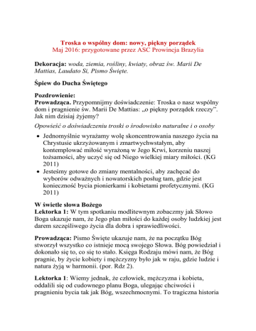 Troska o wspólny dom: nowy, piękny porządek Maj 2016: przygotowane przez ASC Prowincja Brazylia Dekoracja: woda, ziemia, rośliny, kwiaty, obraz św. Marii De Mattias, Laudato Si, Pismo Święte. Śpiew do Ducha Świętego Pozdrowienie: Prowadząca. Przypomnijmy doświadczenie: Troska o nasz wspólny dom i pragnienie św. Marii De Mattias: „o piękny porządek rzeczy”. Jak nim dzisiaj żyjemy? Opowieść o doświadczeniu troski o środowisko naturalne i o osoby Jednomyślnie wyrażamy wolę skoncentrowania naszego życia na Chrystusie ukrzyżowanym i zmartwychwstałym, aby kontemplować miłość wyrażoną w Jego Krwi, korzeniu naszej tożsamości, aby uczyć się od Niego wielkiej miary miłości. (KG 2011) Jesteśmy gotowe do zmiany mentalności, aby zachęcać do wyborów odważnych i nowatorskich posług tam, gdzie jest konieczność bycia pionierkami i kobietami profetycznymi. (KG 2011) W świetle słowa Bożego Lektorka 1: W tym spotkaniu modlitewnym zobaczmy jak Słowo Boga ukazuje nam, że Jego plan miłości do każdej osoby ludzkiej jest darem szczęśliwego życia dla dobra i sprawiedliwości. Prowadząca: Pismo Święte ukazuje nam, że na początku Bóg stworzył wszystko co istnieje mocą swojego Słowa. Bóg powiedział i dokonało się to, co się to stało. Księga Rodzaju mówi nam, że Bóg pragnie, by życie kobiety i mężczyzny było jak w raju, gdzie ludzie i natura żyją w harmonii. (por. Rdz 2). Lektorka 1: Wiemy jednak, że człowiek, mężczyzna i kobieta, oddalili się od cudownego planu Boga, ulegając chciwości i pragnieniu bycia tak jak Bóg, wszechmocnymi. To tragiczna historia grzechu, który spowodował podział w każdej duszy ludzkiej. Widzimy dobro i je rozpoznajemy jako dobro, lecz czasami czynimy zło, którego nie chcemy (Rz 7,19-23). Z powodu naszych pożądliwości i namiętności nasza wola stała się słaba. Lektorka 2: Spójrzcie, co mówi Pismo o obrazie miłości Boga życia: „Bo śmierci Bóg nie uczynił i nie cieszy się ze zguby żyjących. Stworzył bowiem wszystko po to, aby było, i byty tego świata niosą zdrowie: nie ma w nich śmiercionośnego jadu ani władania Otchłani na tej ziemi. Bo sprawiedliwość nie podlega śmierci. (…) Bo dla nieśmiertelności Bóg stworzył człowieka - uczynił go obrazem swej własnej wieczności. A śmierć weszła na świat przez zawiść diabła”. (Mdr 1: 13-15; 2,23-24a) Prowadząca: grzech zniszczył harmonię pomiędzy Bogiem, a człowiekiem i naturą. Lecz Bóg w swojej nieskończonej miłości pozostał wierny swojemu planowi dla stworzenia. On posłał nam własnego Syna, Jezusa Chrystusa, aby wybawić nas od grzechu, diabła i śmierci (por. Hbr 2,15). Św. Paweł poucza nas, że w krzyżu Chrystusa każdy podział został przezwyciężony, a Bóg Ojciec w swojej wielkiej miłości, zapragnął na nowo wszystko zjednoczyć w Chrystusie, aby całe stworzenie uczestniczyło w Jego chwale (por. Ef 1,10) Wszyscy: Panie, wierzymy, że Twój Syn nas umiłował i wydał samego siebie za nas. Przez Jego łaskę zostaliśmy zbawieni. Daj nam Ducha Świętego, abyśmy odwróciwszy się od naszych grzechów, skierowali naszą wolę na dobro i stanowczo odrzucili zło. Chcemy szanować życie i całe stworzenie oraz zawsze je bronić. Amen! Lektorka 3: Żyjemy w czasie, który można uznać jako kluczowy dla kontynuacji życia na naszej planecie Ziemi. Dewastacja, zanieczyszczenie i zniszczenie środowiska powiększają się każdego dnia i odczuwamy tego konsekwencje. Ziemia jest złożonym i żywym systemem, danym nam przez Boga. Jesteśmy wezwane, aby zatroszczyć się o ten dar. 2 Lektorka 4: Nasze działania muszą być oparte na zasadach zgodnych z celem większego szacunku dla stworzenia, dóbr naturalnych, sprawiedliwości i pokoju. Musimy wziąć odpowiedzialność za swoje decyzje. Musimy pomóc przezwyciężyć nierówności i ataki na stworzenie. Wszystkie: Panie, pomóż nam budować wspólny dom, aby wprowadzać harmonię, sprawiedliwość, braterstwo i pokój. Głoszenie Słowa Bożego: Am 5,24 Niech sprawiedliwość wystąpi jak woda z brzegów i prawość jak potok nie wysychający wyleje! Refleksja – Czy wierzymy w lepszy świat? Czy wierzymy w obraz miłości Boga? Czy wierzymy, że prawo musi być chronione, jak woda ze źródła? Jakie prawa? Milczenie i krótkie modlitwy z następującym refrenem: Przybądź, oświeć nas Twoim światłem, Panie Jezu! A- Chrystusie, który siłą swojego zmartwychwstania przyniosłeś światło nowego życia Twojemu ludowi, oświecaj nasze kroki. B- Panie wszelkiego stworzenia, wysłuchaj jęków, które cały wszechświat wznosi w bólach rodzenia. Przyjdź Panie, odnów całe stworzenie. A- Panie, Pasterzu Twojego ludu, wierny przewodniku, towarzyszu na drodze życia; umocnij nasze kroki, osłabłe na skutek trudów drogi. B- Panie, rozpromień Twoją miłość jak światło słońca, które nigdy nie zachodzi, zwłaszcza wówczas, kiedy mroki fałszu i niesprawiedliwości, lęku i samotności dosięgają naszego życia. A- Panie, zachowuj nasze wspólnoty w miłości i uczyń je mocnymi wiarą i świadectwem. 3 B- Przyjdź Panie i pomóż nam budować nowe niebo i nową ziemię, inny możliwy świat. Modlitwy wstawiennicze (na oddzielnej kartce) Modlitwa na zakończenie: Zobowiązanie W kierunku nowego porządku rzeczy, który wielki Syn Boga przyszedł ustanowić swoją Krwią. „My adoratorki jesteśmy wezwane do życia naszym powołaniem ucznia jako mistyczki i prorokinie tego nowego porządku rzeczy, które wielki Syn Boga przyszedł ustanowić swoją Krwią. Zakorzenione w wartościach Ewangelii i naśladując przykład Jezusa pragniemy podkreślić prymat osoby ludzkiej i relacji. Wybieramy promocję uczestniczenia i współodpowiedzialności w naszym życiu i misji” Poszerzona Rada Generalna Bolesławiec - Polska, 3-7 październik 2013 Błogosławieństwo Niech Pan Cię błogosławi i strzeże. Amen! Niech rozprom