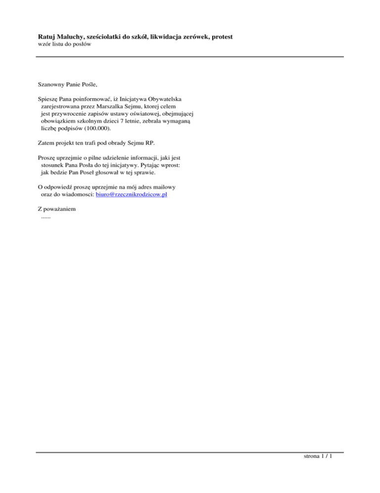 Ratuj Maluchy, sześciolatki do szkół, likwidacja zerówek, protest wzór listu do posłów Szanowny Panie Pośle, Spieszę Pana poinformować, iż Inicjatywa Obywatelska zarejestrowana przez Marszalka Sejmu, ktorej celem jest przywrocenie zapisów ustawy oświatowej, obejmującej obowiązkiem szkolnym dzieci 7 letnie, zebrala wymaganą liczbę podpisów (100.000). Zatem projekt ten trafi pod obrady Sejmu RP. Proszę uprzejmie o pilne udzielenie informacji, jaki jest stosunek Pana Posła do tej inicjatywy. Pytając wprost: jak bedzie Pan Poseł głosował w tej sprawie. O odpowiedź proszę uprzejmie na mój adres mailowy oraz do wiadomosci: [email protected] Z poważaniem ...... strona 1 / 1