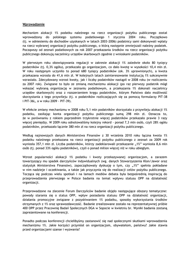 Wprowadzenie Mechanizm alokacji 1% podatku należnego na rzecz organizacji pożytku publicznego został wprowadzony do polskiego systemu podatkowego 1 stycznia 2004 roku. Początkowo (tj. w odniesieniu do dochodów uzyskanych w latach 2003-2006) podatnicy sami dokonywali wpłaty na rzecz wybranej organizacji pożytku publicznego, o którą następnie zmniejszali należny podatek. Począwszy od zeznań podatkowych za rok 2007 przekazania środków na rzecz organizacji pożytku publicznego dokonują naczelnicy urzędów skarbowych zgodnie z wnioskami podatników. W pierwszym roku obowiązywania regulacji w zakresie alokacji 1% zaledwie około 80 tysięcy podatników (tj. 0,3% ogółu), przekazało go organizacjom, co dało kwotę w wysokości 10,4 mln zł. W roku następnym uczyniło to ponad 680 tysięcy podatników (ok. 3% uprawnionych), a kwota przekazana wzrosła do 41,6 mln zł. W kolejnych latach zainteresowanie instytucją 1% sukcesywnie wzrastało. Zdecydowany wzrost kwoty, jak i liczby podatników nastąpił w 2008 roku (w rozliczeniu za 2007 rok). Związane to było ze zmianą mechanizmu alokacji (po raz pierwszy podatnik mógł wskazać wybraną organizację w zeznaniu podatkowym, a przekazania 1% dokonali naczelnicy urzędów skarbowych) oraz z rozszerzeniem kręgu podatników, którym Państwo dało możliwość skorzystania z tego przywileju (tj. o podatników rozliczających się za pomocą formularzy PIT-38 i PIT-36L, a w roku 2009 - PIT-39). W efekcie zmiany mechanizmu w 2008 roku 5,1 mln podatników skorzystało z przywileju alokacji 1% podatku, zasilając konta organizacji pożytku publicznego sumą 298 mln zł. Oznacza to, że w porównaniu z rokiem poprzednim trzykrotnie więcej podatników przekazało prawie 3 razy więcej pieniędzy. W 2009 roku odnotowaliśmy kolejny rekord - ponad 7,3 mln osób, czyli 28% ogółu podatników, przekazało łącznie 380 mln zł na rzecz organizacji pożytku publicznego. Według najnowszych danych Ministerstwa Finansów z 30 września 2010 roku łączna kwota 1% podatku należnego przekazana na rzecz organizacji pożytku publicznego z zeznań za 2009 rok wyniosła 357,1 mln zł. Liczba podatników, którzy zadeklarowali przekazanie „1%” wyniosła 8,6 mln osób (tj. ponad 33% ogółu podatników), czyli o ponad milion więcej niż w roku ubiegłym. Wzrost popularności alokacji 1% podatku i kwoty przekazywanej organizacjom, a zarazem towarzyszący mu spadek darczyńców indywidualnych (wg. danych Stowarzyszenia Klon/Jawor oraz statystyk Ministerstwa Finansów), zapoczątkowały dyskusję o tym, czy „1%” spełnia pokładane w nim nadzieje i oczekiwania, a także jak przyczynia się do realizacji celów pożytku publicznego. Tocząca się podczas wielu spotkań i na łamach mediów debata była bezpośrednią inspiracją do przeprowadzenia pierwszego w Polsce badania na temat wpływu statusu OPP na działalność organizacji. Przeprowadzone na zlecenie Forum Darczyńców badanie objęło następujące obszary tematyczne: powody starania się o status OPP, wpływ posiadania statusu OPP na działalność organizacji, działania promocyjne związane z pozyskiwaniem 1% podatku, sposoby wykorzystania środków otrzymanych z 1% oraz sprawozdawczość. Badanie zrealizowane zostało na reprezentatywnej próbie 400 OPP przez Pracownię Badań Społecznych DGA w Sopocie w kwietniu br. Wyniki badania zostaną zaprezentowane na konferencji. Ponadto podczas konferencji chcielibyśmy zastanowić się nad społecznymi skutkami wprowadzenia mechanizmu 1%. Jakie korzyści przyniósł on organizacjom, obywatelom, państwu? Jakie stawia przed organizacjami szanse i wyzwania?