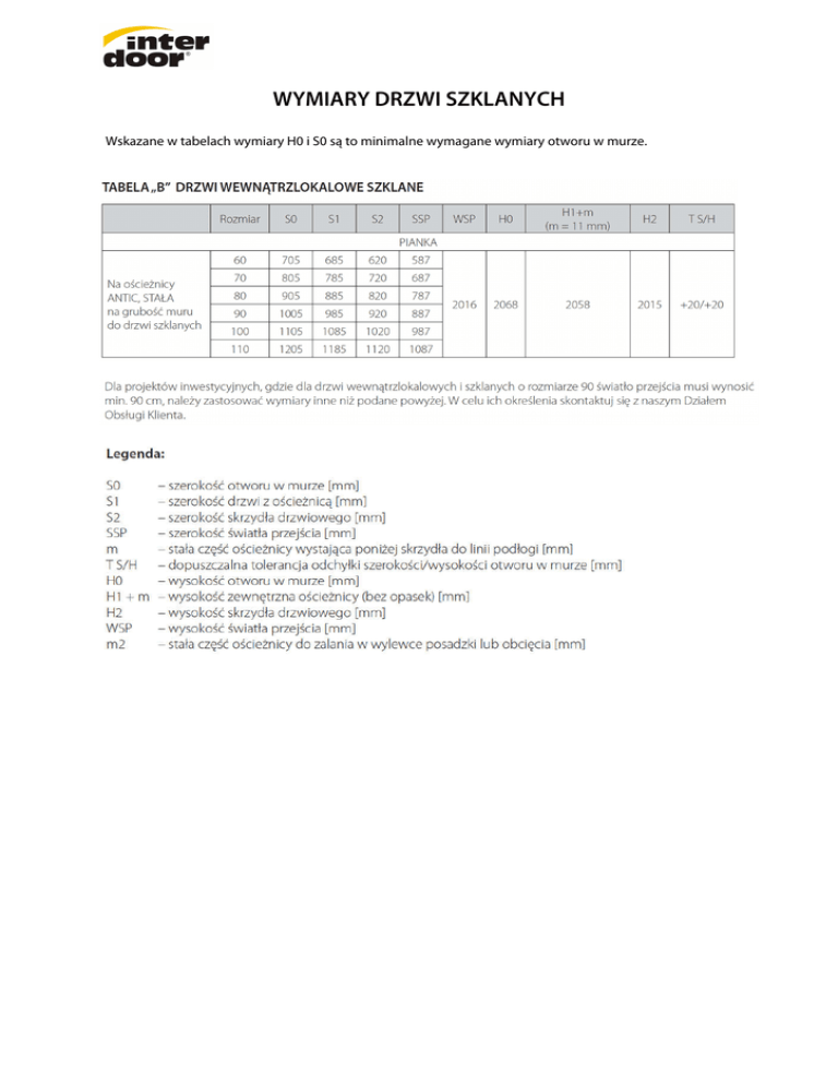 WYMIARY DRZWI SZKLANYCH Wskazane w tabelach wymiary H0 i S0 są to minimalne wymagane wymiary otworu w murze.