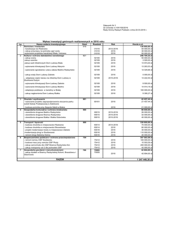 Załacznik Nr 3 do Uchwały nr XIX/100/2016 Rady Gminy Radzyń Podlaski z dnia 22.03.2016 r. Wykaz inwestycji gminnych realizowanych w 2016 roku Lp. 1 2 3 4 5 6 7 Nazwa zadania inwestycyjnego Rolnictwo i łowiectwo - kanalizacja wsi Radowiec - zakup przyczepy na potrzeby ujęć wody -wykonanie projektów kanalizacji Biała, Ustrzesz Kultura i ochrona dziedzictwa narodowego - zakup sceny -zakup szamba Dział 010 Rozdział Rok 01010 01010 01010 2012-2016 2016 2016 92105 92109 2016 2016 921 Kwota w zł. 130 000,00 zł 50 000,00 zł 30 000,00 zł 50 000,00 zł 246 794,35 zł 50 000,00 zł 3 500,00 zł -zakup szaf chłodniczych Dom Ludowy Biała 92109 2016 13 974,00 zł - wykonanie klimatyzacji Dom Ludowy Marynin 92109 2016 13 263,53 zł - wykonanie ogrodzenia i placu zabaw Bedlno Radzyńskie 92109 2016 14 029,86 zł - zakup wiaty Dom Ludowy Zabiele 92109 2016 5 000,00 zł ,- adaptacja części tarasu na chłodnię Dom Ludowy w Zbulitowie Dużym 92109 2015-2016 13 222,50 zł - wykonanie klimatyzacji Dom Ludowy Zabiele 92109 2016 9 500,00 zł - wykonanie klimatyzacji Dom Ludowy Bedlno 92109 2016 14 914,19 zł - adaptacja poddasza w świetlicy w Białej 92109 2016 100 000,00 zł - zakup nagłosnienia Dom Ludowy Białka 92109 2016 9 390,27 zł 80101 2016 42 457,44 zł 21 457,44 zł Oswiata i wychowanie - wykonanie projektu zagospodarowania otoczenia parku wokół Szkoły Podstawowej w Żabikowie - budowa pomnika przy Zespole Szkół w Białce Gospodarka komunalna i ochrona środowiska - oświetlenie drogowe Bedlno Radzyńskie - oświetlenie drogowe Branica Radzyńska - oświetlenie drogowe Białka i Białka Sidorówka Transport i łączność - budowa chodnika w miejscowości Radowiec - budowa chodnika w miejscowości Brzostówiec - projekt modernizacji mostu w miejscowosci Zabiele -modernizacja drogi w Siedlanowie - remont drogi Żabików Kolnia Bezpieczeństwo publiczne i ochrona przeciwpożarowa - remont remizy OSP Siedlanów - budowa trasu przy remizie OSP Płudy - zakup samochodu dla OSP Branica Radzyńska Kol. - zakup motopomp szt 2 dla jednostek OSP Gospodarka gruntami i nieruchomościami - zakup działek w Branicy Radzyńskiej Kolonii, Brzostówcu i Stasinowie RAZEM 801 2016 900 90015 90015 90015 2015-2016 2015-2016 2015-2016 60014 60014 60016 60016 60016 2014-2016 2016 2016 2016 2016 75412 75412 75412 75412 70005 70005 2016 2016 2016 2016 600 754 700 2016 21 000,00 zł 98 000,00 zł 26 000,00 zł 32 000,00 zł 40 000,00 zł 330 000,00 zł 70 000,00 zł 80 000,00 zł 30 000,00 zł 110 000,00 zł 40 000,00 zł 357 503,59 zł 100 000,00 zł 15 503,59 zł 200 000,00 zł 42 000,00 zł 42 694,00 zł 42 694,00 zł 1 247 449,38 zł