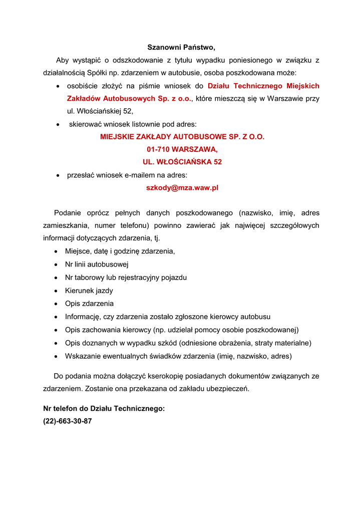 Szanowni Państwo, Aby wystąpić o odszkodowanie z tytułu wypadku poniesionego w związku z działalnością Spółki np. zdarzeniem w autobusie, osoba poszkodowana może: osobiście złożyć na piśmie wniosek do Działu Technicznego Miejskich Zakładów Autobusowych Sp. z o.o., które mieszczą się w Warszawie przy ul. Włościańskiej 52, skierować wniosek listownie pod adres: MIEJSKIE ZAKŁADY AUTOBUSOWE SP. Z O.O. 01-710 WARSZAWA, UL. WŁOŚCIAŃSKA 52 przesłać wniosek e-mailem na adres: [email protected] Podanie oprócz pełnych danych poszkodowanego (nazwisko, imię, adres zamieszkania, numer telefonu) powinno zawierać jak najwięcej szczegółowych informacji dotyczących zdarzenia, tj. Miejsce, datę i godzinę zdarzenia, Nr linii autobusowej Nr taborowy lub rejestracyjny pojazdu Kierunek jazdy Opis zdarzenia Informację, czy zdarzenia zostało zgłoszone kierowcy autobusu Opis zachowania kierowcy (np. udzielał pomocy osobie poszkodowanej) Opis doznanych w wypadku szkód (odniesione obrażenia, straty materialne) Wskazanie ewentualnych świadków zdarzenia (imię, nazwisko, adres) Do podania można dołączyć kserokopię posiadanych dokumentów związanych ze zdarzeniem. Zostanie ona przekazana od zakładu ubezpieczeń. Nr telefon do Działu Technicznego: (22)-663-30-87