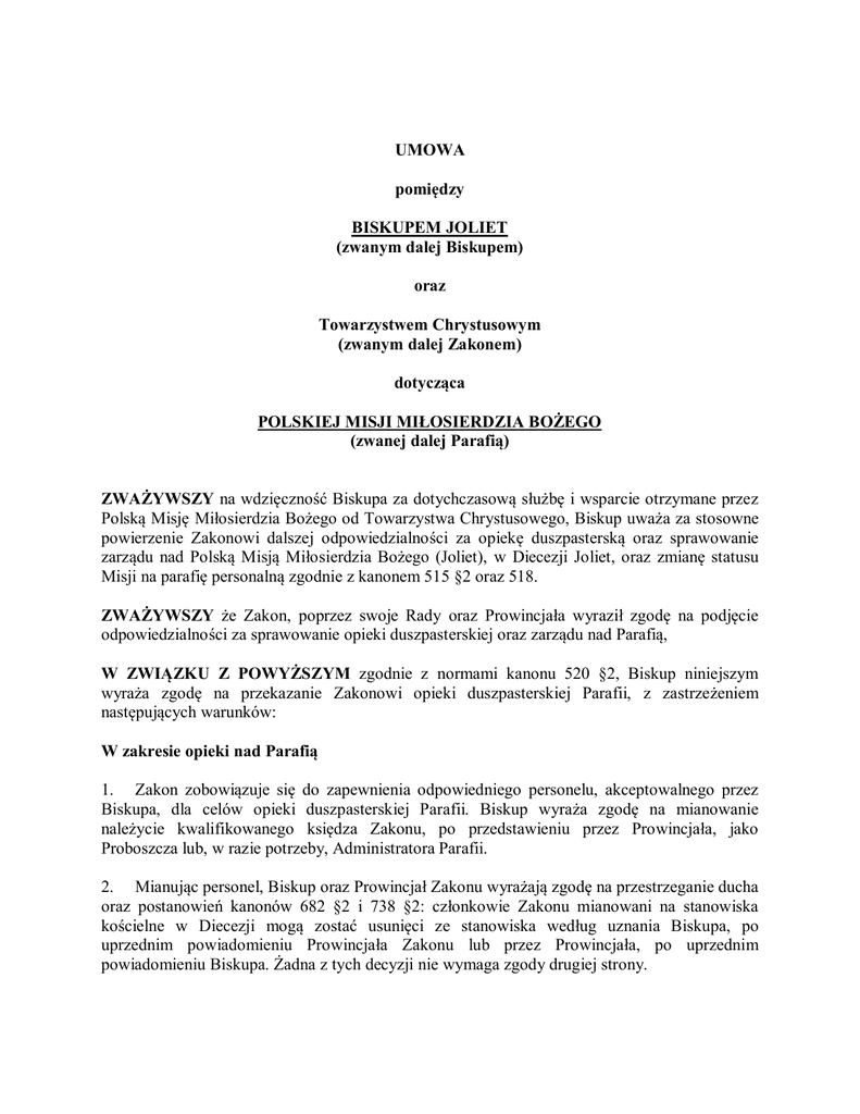 UMOWA pomiędzy BISKUPEM JOLIET (zwanym dalej Biskupem) oraz Towarzystwem Chrystusowym (zwanym dalej Zakonem) dotycząca POLSKIEJ MISJI MIŁOSIERDZIA BOŻEGO (zwanej dalej Parafią) ZWAŻYWSZY na wdzięczność Biskupa za dotychczasową służbę i wsparcie otrzymane przez Polską Misję Miłosierdzia Bożego od Towarzystwa Chrystusowego, Biskup uważa za stosowne powierzenie Zakonowi dalszej odpowiedzialności za opiekę duszpasterską oraz sprawowanie zarządu nad Polską Misją Miłosierdzia Bożego (Joliet), w Diecezji Joliet, oraz zmianę statusu Misji na parafię personalną zgodnie z kanonem 515 §2 oraz 518. ZWAŻYWSZY że Zakon, poprzez swoje Rady oraz Prowincjała wyraził zgodę na podjęcie odpowiedzialności za sprawowanie opieki duszpasterskiej oraz zarządu nad Parafią, W ZWIĄZKU Z POWYŻSZYM zgodnie z normami kanonu 520 §2, Biskup niniejszym wyraża zgodę na przekazanie Zakonowi opieki duszpasterskiej Parafii, z zastrzeżeniem następujących warunków: W zakresie opieki nad Parafią 1. Zakon zobowiązuje się do zapewnienia odpowiedniego personelu, akceptowalnego przez Biskupa, dla celów opieki duszpasterskiej Parafii. Biskup wyraża zgodę na mianowanie należycie kwalifikowanego księdza Zakonu, po przedstawieniu przez Prowincjała, jako Proboszcza lub, w razie potrzeby, Administratora Parafii. 2. Mianując personel, Biskup oraz Prowincjał Zakonu wyrażają zgodę na przestrzeganie ducha oraz postanowień kanonów 682 §2 i 738 §2: członkowie Zakonu mianowani na stanowiska kościelne w Diecezji mogą zostać usunięci ze stanowiska według uznania Biskupa, po uprzednim powiadomieniu Prowincjała Zakonu lub przez Prowincjała, po uprzednim powiadomieniu Biskupa. Żadna z tych decyzji nie wymaga zgody drugiej strony. 3. Uposażenie księdza (tzn. wynagrodzenie) Proboszcza i Wikariuszy Parafii będzie wypłacane przez Parafię i obliczane zgodnie z harmonogramem wynagrodzeń księży ustanawianym corocznie dla księży pełniących posługę w parafiach Diecezji. 4. W chwili odejścia Zakonu z Diecezji, po zakończeniu posługi Zakonu oraz gdy pożyczki Parafii zostaną przez Zakon spłacone, Zakon przekaże własność dóbr materialnych Parafii (kościoła, plebanii i wszelkiej przyszłej własności parafialnej) na rzecz Diecezji. Do czasu spełnienia obu warunków, Zakon będzie odpowiedzialny za utrzymanie własności oraz spłacanie pożyczek Parafii. 5. Biskup może uznać za rozważne skorzystanie ze swojego prawa do likwidacji Parafii zgodnie z kanonem 515. Powodem tego może być, między innymi, brak personelu ze strony Zakonu lub malejąca liczba polskojęzycznych parafian polskiego pochodzenia. 6. Całkowite koszty utrzymania i nakładów związanych z ulepszaniem środków trwałych Parafii będą ponoszone przez Parafię, zgodnie z prawem powszechnym i szczegółowym. 7. Członkowie Zakonu oraz inne osoby stowarzyszone z Zakonem zamieszkałe w obiektach Parafii, ale nie przypisane Parafii przez Biskupa, będą utrzymywane przez Zakon. Zakon będzie dążyć do pomocy Parafii w pokrywaniu kosztów operacyjnych budynku plebanii ponad te, które zostałyby poniesione na użytek Parafii, w tym jako mieszkanie Proboszcza (i Wikariusza(y) Parafii). 8. Biskup lub osoba przez niego wyznaczona ma prawo do audytu lub inspekcji dóbr, finansów, rachunków bankowych i rejestrów Parafii za powiadomieniem, jeżeli uzna to za konieczne. 9. Odrębne spisy inwentarza oraz rachunki finansowe będą utrzymywane odnośnie do dóbr należących do Parafii i tych należących do Zakonu. Dobra materialne o znacznej wartości nabyte przez Parafię podczas obowiązywania niniejszej umowy będą odnotowywane w dokumentacji finansowej Parafii. 10. Parafia zobowiązuje się przestrzegać i promować przepisy Diecezji w zakresie składek diecezjalnych, Dorocznego Apelu Duszpasterstwa Katolickiego (CatholicMinistriesAnnualAppeal), czasopisma Chrystus Naszą Nadzieją (ChristIsOurHope Magazine) oraz zbiórek specjalnych przeprowadzanych w Diecezji obecnie lub w przyszłości. 11. Wszelkie przepisy liturgiczne w tym dotyczące sztuki i środowiska, sprawozdawczości w obrębie diecezji oraz zgodności z wytycznymi zawartymi np. w Karcie Ochrony Dzieci i Młodzieży Konferencji Biskupów Katolickich Stanów Zjednoczonych (USCCB Charter for the Protection of Children and Young People) muszą być przestrzegane i utrzymywane przez Parafię. W szczególności Parafia zobowiązuje się przestrzegać i wdrożyć wszystkie postanowienia Karty. Obejmuje to między innymi zgodność z zasadami i procedurami Diecezji oraz udział w corocznym audycie. 12. W sprawowaniu nad Parafią zarządu duszpasterskiego i doczesnego, Proboszcz zobowiązuje się stosować się do wszelkich przepisów diecezjalnych dotyczących zarządzania Parafią, obowiązujących obecnie lub czasowo ustalanych przez Biskupa. Obejmuje to roczne przedstawianie dokumentacji finansowej i stanu budżetu na koniec roku z zatwierdzeniem [parafialnej] rady finansowej. 13. Parafia zobowiązuje się współpracować z Diecezjalnym Biurem ds. Finansów w zakresie przyszłych pożyczek i depozytów dotyczących parafii. W zakresie Zakonu W Diecezji 14. Członkowie Zakonu zamieszkali w Diecezji Joliet mają prawo służyć jako członkowie Rady Prezbiterialnej, Kolegium Konsultantów, Diecezjalnej Rady Pastoralnej i innych tego rodzaju gremiów, określonych przez prawo powszechne i szczegółowe. 15. Zakon wyraża zgodę na pisemne powiadamianie Biskupa o zamiarze przyjęcia członka do zamieszkania stałego, tymczasowego lub innego rodzaju w Parafii lub Diecezji. Ponadto, jeżeli ten członek zostanie zaproponowany do prowadzenia duszpasterstwa publicznego w Diecezji, Zakon wyraża zgodę na sporządzenie pisemnego wniosku wraz z niezbędną dokumentacją wymaganą przez Diecezję dotyczącą historii członka, do rozpatrzenia przez Wikariusza ds. Kleru przed przybyciem członka do Diecezji. W tym względzie należy dołożyć 