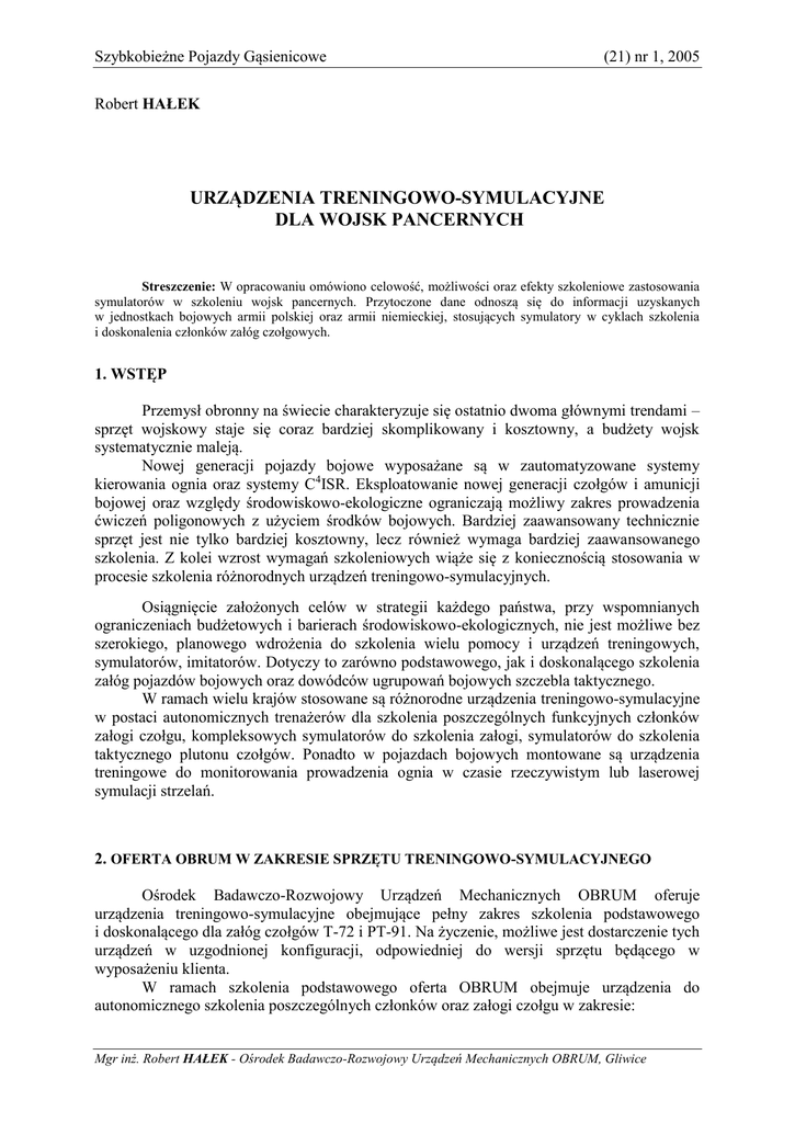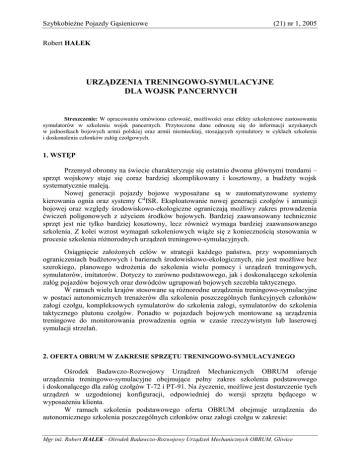 Szybkobieżne Pojazdy Gąsienicowe (21) nr 1, 2005 Robert HAŁEK URZĄDZENIA TRENINGOWO-SYMULACYJNE DLA WOJSK PANCERNYCH Streszczenie: W opracowaniu omówiono celowość, możliwości oraz efekty szkoleniowe zastosowania symulatorów w szkoleniu wojsk pancernych. Przytoczone dane odnoszą się do informacji uzyskanych w jednostkach bojowych armii polskiej oraz armii niemieckiej, stosujących symulatory w cyklach szkolenia i doskonalenia członków załóg czołgowych. 1. WSTĘP Przemysł obronny na świecie charakteryzuje się ostatnio dwoma głównymi trendami – sprzęt wojskowy staje się coraz bardziej skomplikowany i kosztowny, a budżety wojsk systematycznie maleją. Nowej generacji pojazdy bojowe wyposażane są w zautomatyzowane systemy kierowania ognia oraz systemy C4ISR. Eksploatowanie nowej generacji czołgów i amunicji bojowej oraz względy środowiskowo-ekologiczne ograniczają możliwy zakres prowadzenia ćwiczeń poligonowych z użyciem środków bojowych. Bardziej zaawansowany technicznie sprzęt jest nie tylko bardziej kosztowny, lecz również wymaga bardziej zaawansowanego szkolenia. Z kolei wzrost wymagań szkoleniowych wiąże się z koniecznością stosowania w procesie szkolenia różnorodnych urządzeń treningowo-symulacyjnych. Osiągnięcie założonych celów w strategii każdego państwa, przy wspomnianych ograniczeniach budżetowych i barierach środowiskowo-ekologicznych, nie jest możliwe bez szerokiego, planowego wdrożenia do szkolenia wielu pomocy i urządzeń treningowych, symulatorów, imitatorów. Dotyczy to zarówno podstawowego, jak i doskonalącego szkolenia załóg pojazdów bojowych oraz dowódców ugrupowań bojowych szczebla taktycznego. W ramach wielu krajów stosowane są różnorodne urządzenia treningowo-symulacyjne w postaci autonomicznych trenażerów dla szkolenia poszczególnych funkcyjnych członków załogi czołgu, kompleksowych symulatorów do szkolenia załogi, symulatorów do szkolenia taktycznego plutonu czołgów. Ponadto w pojazdach bojowych montowane są urządzenia treningowe do monitorowania prowadzenia ognia w czasie rzeczywistym lub laserowej symulacji strzelań. 2. OFERTA OBRUM W ZAKRESIE SPRZĘTU TRENINGOWO-SYMULACYJNEGO Ośrodek Badawczo-Rozwojowy Urządzeń Mechanicznych OBRUM oferuje urządzenia treningowo-symulacyjne obejmujące pełny zakres szkolenia podstawowego i doskonalącego dla załóg czołgów T-72 i PT-91. Na życzenie, możliwe jest dostarczenie tych urządzeń w uzgodnionej konfiguracji, odpowiedniej do wersji sprzętu będącego w wyposażeniu klienta. W ramach szkolenia podstawowego oferta OBRUM obejmuje urządzenia do autonomicznego szkolenia poszczególnych członków oraz załogi czołgu w zakresie: Mgr inż. Robert HAŁEK - Ośrodek Badawczo-Rozwojowy Urządzeń Mechanicznych OBRUM, Gliwice Robert HAŁEK - szkolenia kierowcy: SJ-01 – trenażer do nauki budowy i działania zespołów czołgu, SJ-03S – trenażer do nauki budowy i działania układów kierowania czołgiem, SJ-04 – trenażer do nauki budowy i działania układu ochrony przed skutkami użycia broni masowego rażenia, SJ-05– trenażer do nauki budowy i zasady pracy układu smarowania silnika, SJ-06 – trenażer do nauki budowy i zasady pracy układu paliwowego, SJ-09 – trenażer do nauki umiejętności prowadzenia pojazdu, prawidłowego posługiwania się mechanizmami sterowania i wyrabiania nawyku bieżącej obserwacji urządzeń kontrolnych, symulator kierowcy na platformie ruchowej, komputerowe instrukcje szkoleniowe CBT (Computer Based Training) do szkolenia kierowcy, - szkolenia dowódcy i działonowego: SJ-01 – trenażer do nauki budowy i działania zespołów czołgu, SJ-02 – trenażer do nauki budowy i działania automatu ładowania armaty, SJ-08 – trenażer do szkolenia ogniowego załogi wieży czołgu, symulator działonowego i dowódcy na platformie ruchowej, komputerowe instrukcje szkoleniowe CBT (Computer Based Training) do szkolenia działonowego i dowódcy, - szkolenia załogi: SJ-01 – trenażer do nauki budowy i działania zespołów czołgu, BESKID-3 – symulator taktyczny załogi czołgu, symulator kompleksowy na platformach ruchowych, komputerowe instrukcje szkoleniowe CBT (Computer Based Training) do szkolenia załogi, W zakresie szkolenia doskonalącego oferta OBRUM obejmuje urządzenia do szkolenia członków załogi, szkolenia zgrywającego współdziałanie członków załogi oraz szkolenia taktycznego plutonu czołgów a mianowicie: symulator taktyczny załogi czołgu – BESKID-3, symulator kompleksowy załogi na platformach ruchowych, symulator taktyczny plutonu czołgów – BESKID-3P, system monitorowania prowadzenia ognia w czasie rzeczywistym (Live Firing Monitoring Equipment – LFME). 3. SYMULATORY Celem treningu jest osiągnięcie wysokiego stopnia opanowania sprzętu przez każdego członka załogi czołgu oraz sprawnego współdziałania: członków załogi czołgu, pojazdów w formacji bojowej i pojazdów z innymi rodzajami broni uczestniczącymi w walce. Szczególną uwagę należy zwrócić na możliwości szkolenia, jakie stwarzają symulatory wykorzystujące najnowszą technologię wirtualnej rzeczywistości w realistycznym i inteligentnym środowisku trójwymiarowym. Oferują one dokładne odwzorowanie terenu, warunków bojowych oraz atmosferycznych, pory dnia i roku symulowanych w czasie rzeczywistym. OBRUM oferuje gotowe zestawy ćwiczeń przygotowawczych, szkolnych i sprawdzających. Zawartość tych zestawów może być dostosowywana do spełnienia potrzeb klienta. 2 Urządzenia treningowo-symulacyjne dla wojsk pancernych Symulatory pozwalają na kontrolowany trening i ocenę szkolenia. Są zaprojektowane tak, by były kontrolowane przez jednego instruktora, który ma możliwość tworzenia, zarządzania i rozwijania ćwiczeń. Opracowując nowy scenariusz ćwiczenia instruktor może: wybrać teren z dostępnej bazy obejmującej obszar ok. 600 km2, wybrać cele, jakie b