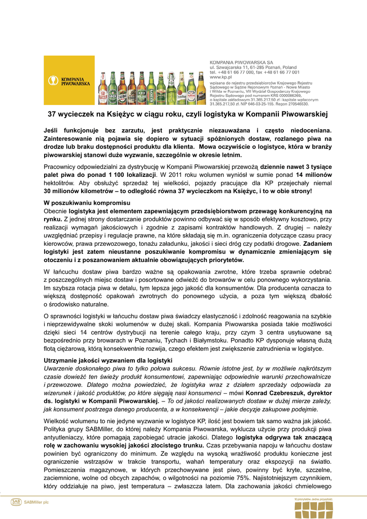 37 wycieczek na Księżyc w ciągu roku, czyli logistyka w Kompanii Piwowarskiej Jeśli funkcjonuje bez zarzutu, jest praktycznie niezauważana i często niedoceniana. Zainteresowanie nią pojawia się dopiero w sytuacji spóźnionych dostaw, rozlanego piwa na drodze lub braku dostępności produktu dla klienta. Mowa oczywiście o logistyce, która w branży piwowarskiej stanowi duże wyzwanie, szczególnie w okresie letnim. Pracownicy odpowiedzialni za dystrybucję w Kompanii Piwowarskiej przewożą dziennie nawet 3 tysiące palet piwa do ponad 1 100 lokalizacji. W 2011 roku wolumen wyniósł w sumie ponad 14 milionów hektolitrów. Aby obsłużyć sprzedaż tej wielkości, pojazdy pracujące dla KP przejechały niemal 30 milionów kilometrów – to odległość równa 37 wycieczkom na Księżyc, i to w obie strony! W poszukiwaniu kompromisu Obecnie logistyka jest elementem zapewniającym przedsiębiorstwom przewagę konkurencyjną na rynku. Z jednej strony dostarczanie produktów powinno odbywać się w sposób efektywny kosztowo, przy realizacji wymagań jakościowych i zgodnie z zapisami kontraktów handlowych. Z drugiej – należy uwzględniać przepisy i regulacje prawne, na które składają się m.in. ograniczenia dotyczące czasu pracy kierowców, prawa przewozowego, tonażu załadunku, jakości i sieci dróg czy podatki drogowe. Zadaniem logistyki jest zatem nieustanne poszukiwanie kompromisu w dynamicznie zmieniającym się otoczeniu i z poszanowaniem aktualnie obowiązujących priorytetów. W łańcuchu dostaw piwa bardzo ważne są opakowania zwrotne, które trzeba sprawnie odebrać z poszczególnych miejsc dostaw i posortowane odwieźć do browarów w celu ponownego wykorzystania. Im szybsza rotacja piwa w detalu, tym lepsza jego jakość dla konsumentów. Dla producenta oznacza to większą dostępność opakowań zwrotnych do ponownego użycia, a poza tym większą dbałość o środowisko naturalne. O sprawności logistyki w łańcuchu dostaw piwa świadczy elastyczność i zdolność reagowania na szybkie i nieprzewidywalne skoki wolumenów w dużej skali. Kompania Piwowarska posiada takie możliwości dzięki sieci 14 centrów dystrybucji na terenie całego kraju, przy czym 3 centra usytuowane są bezpośrednio przy browarach w Poznaniu, Tychach i Białymstoku. Ponadto KP dysponuje własną dużą flotą ciężarową, którą konsekwentnie rozwija, czego efektem jest zwiększenie zatrudnienia w logistyce. Utrzymanie jakości wyzwaniem dla logistyki Uwarzenie doskonałego piwa to tylko połowa sukcesu. Równie istotne jest, by w możliwie najkrótszym czasie dowieźć ten świeży produkt konsumentowi, zapewniając odpowiednie warunki przechowalnicze i przewozowe. Dlatego można powiedzieć, że logistyka wraz z działem sprzedaży odpowiada za wizerunek i jakość produktów, po które sięgają nasi konsumenci – mówi Konrad Czebreszuk, dyrektor ds. logistyki w Kompanii Piwowarskiej. – To od jakości realizowanych dostaw w dużej mierze zależy, jak konsument postrzega danego producenta, a w konsekwencji – jakie decyzje zakupowe podejmie. Wielkość wolumenu to nie jedyne wyzwanie w logistyce KP, ilość jest bowiem tak samo ważna jak jakość. Polityka grupy SABMiller, do której należy Kompania Piwowarska, wyklucza użycie przy produkcji piwa antyutleniaczy, które pomagają zapobiegać utracie jakości. Dlatego logistyka odgrywa tak znaczącą rolę w zachowaniu wysokiej jakości złocistego trunku. Czas przebywania napoju w łańcuchu dostaw powinien być ograniczony do minimum. Ze względu na wysoką wrażliwość produktu konieczne jest ograniczenie wstrząsów w trakcie transportu, wahań temperatury oraz ekspozycji na światło. Pomieszczenia magazynowe, w których przechowywane jest piwo, powinny być kryte, szczelne, zaciemnione, wolne od obcych zapachów, o wilgotności na poziomie 75%. Najistotniejszym czynnikiem, który oddziałuje na piwo, jest temperatura – zwłaszcza latem. Dla zachowania jakości chmielowego napoju optymalna jest temperatura magazynowania 2-16°C. Granice tolerancji to zakresy 0-2 i 16-25 stopni Celsjusza. W związku z tym niedopuszczalne jest wystawianie piwa na bezpośrednie oddziaływanie promieni słonecznych, magazynowanie go w pobliżu źródeł ciepła lub jego przemarznięcie. Niekorzystnie na jakość piwa wpływają także nagłe zmiany temperatury powodujące szoki termiczne. Racząc się piwem najwyższej jakości – pełnym smaku, o prawidłowej barwie, przejrzystości i zapachu – warto mieć na uwadze, że jest to zasługa nie tylko doświadczonego piwowara, ale także wielu osób, które zadbały o to, by w odpowiedni sposób dostarczyć je do ulubionego sklepu, pubu czy restauracji. Do redaktora: Kompania Piwowarska – Lider branży piwowarskiej w Polsce Kompania Piwowarska jest największym przedsiębiorstwem piwowarskim w Polsce. Kilkusetletnie doświadczenia w warzeniu piwa, nowoczesne technologie i rygorystyczne przestrzeganie zasad produkcji na światowym poziomie gwarantują najwyższą jakość naszych produktów. Do portfela marek KP należą najpopularniejsze polskie piwa – m.in. Tyskie, Żubr, Lech, Dębowe Mocne, Redd's, a także międzynarodowe marki premium: Pilsner Urquell, Grolsch oraz Peroni Nastro Azzurro. Kompania Piwowarska (utworzona w 1999 roku) posiada trzy browary (w Tychach, Poznaniu i Białymstoku) oraz oddziały handlowe na terenie całego kraju. Kompania Piwowarska prowadzi także działalność społeczną oraz programy edukacyjne popularyzujące odpowiedzialność i umiar w konsumowaniu alkoholu. Wielkość sprzedaży osiągniętej przez KP w roku finansowym zakończonym 31 marca 2012 r. wyniosła 13,5 mln hektolitrów piwa. SABMiller – jeden z największych na świecie producentów piwa Kompania Piwowarska jest częścią jednego z największych na świecie producentów piwa – SABMiller plc. Grupa produkuje lub dystrybuuje piwo na sześciu kontynentach, a jej ogólno