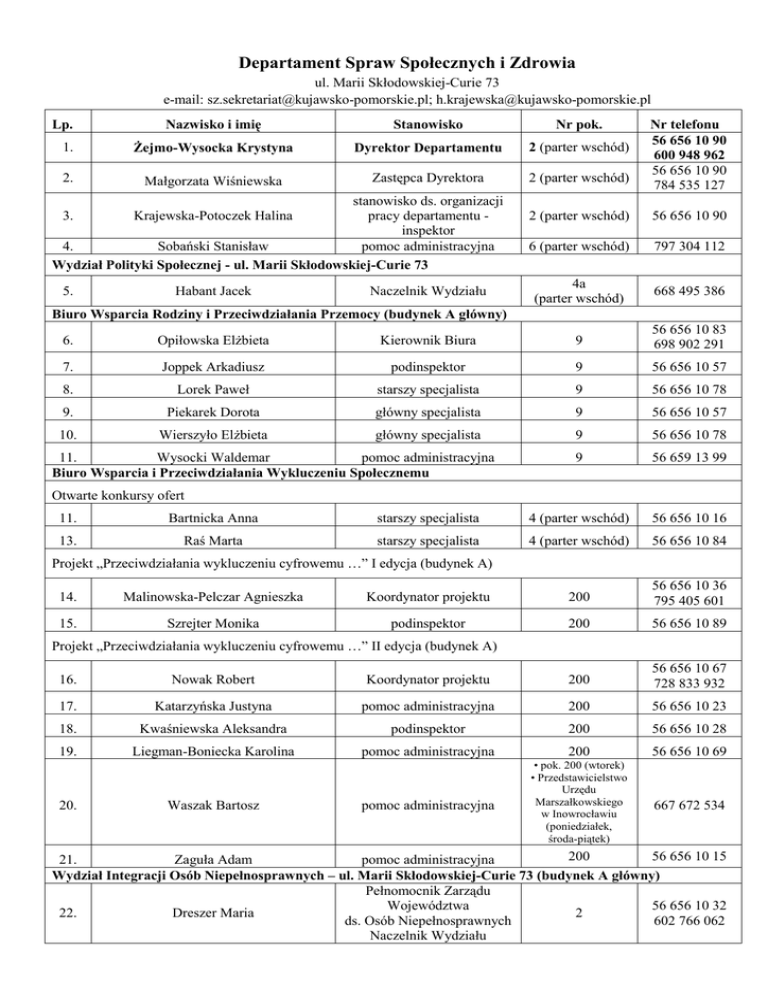 Departament Spraw Społecznych i Zdrowia ul. Marii Skłodowskiej-Curie 73 e-mail: [email protected]; [email protected] Lp. Nazwisko i imię Stanowisko Nr pok. 1. Żejmo-Wysocka Krystyna Dyrektor Departamentu 2 (parter wschód) 2. Małgorzata Wiśniewska Zastępca Dyrektora 2 (parter wschód) stanowisko ds. organizacji pracy departamentu inspektor 4. Sobański Stanisław pomoc administracyjna Wydział Polityki Społecznej - ul. Marii Skłodowskiej-Curie 73 3. 5. Krajewska-Potoczek Halina Habant Jacek Naczelnik Wydziału Nr telefonu 56 656 10 90 600 948 962 56 656 10 90 784 535 127 2 (parter wschód) 56 656 10 90 6 (parter wschód) 797 304 112 4a (parter wschód) 668 495 386 Biuro Wsparcia Rodziny i Przeciwdziałania Przemocy (budynek A główny) 6. Opiłowska Elżbieta Kierownik Biura 9 56 656 10 83 698 902 291 7. Joppek Arkadiusz podinspektor 9 56 656 10 57 8. Lorek Paweł starszy specjalista 9 56 656 10 78 9. Piekarek Dorota główny specjalista 9 56 656 10 57 10. Wierszyło Elżbieta główny specjalista 9 56 656 10 78 9 56 659 13 99 11. Wysocki Waldemar pomoc administracyjna Biuro Wsparcia i Przeciwdziałania Wykluczeniu Społecznemu Otwarte konkursy ofert 11. Bartnicka Anna starszy specjalista 4 (parter wschód) 56 656 10 16 13. Raś Marta starszy specjalista 4 (parter wschód) 56 656 10 84 Projekt „Przeciwdziałania wykluczeniu cyfrowemu …” I edycja (budynek A) 14. Malinowska-Pelczar Agnieszka Koordynator projektu 200 56 656 10 36 795 405 601 15. Szrejter Monika podinspektor 200 56 656 10 89 Projekt „Przeciwdziałania wykluczeniu cyfrowemu …” II edycja (budynek A) 16. Nowak Robert Koordynator projektu 200 56 656 10 67 728 833 932 17. Katarzyńska Justyna pomoc administracyjna 200 56 656 10 23 18. Kwaśniewska Aleksandra podinspektor 200 56 656 10 28 19. Liegman-Boniecka Karolina pomoc administracyjna 200 56 656 10 69 pomoc administracyjna • pok. 200 (wtorek) • Przedstawicielstwo Urzędu Marszałkowskiego w Inowrocławiu (poniedziałek, środa-piątek) 667 672 534 20. Waszak Bartosz 200 56 656 10 15 21. Zaguła Adam pomoc administracyjna Wydział Integracji Osób Niepełnosprawnych – ul. Marii Skłodowskiej-Curie 73 (budynek A główny) Pełnomocnik Zarządu 56 656 10 32 Województwa 22. Dreszer Maria 2 ds. Osób Niepełnosprawnych 602 766 062 Naczelnik Wydziału 23. Angielczyk Anna pomoc administracyjna 1 24. Łassa Justyna pomoc administracyjna 1 25. Łowicki Marcin pomoc administracyjna 1 26. Przewoźny Krzysztof główny specjalista 1 56 656 10 31 56 656 10 31 56 656 10 31 514 456 511 56 656 10 31 514 456 520 27. Sandecka Julita pomoc administracyjna 1 56 656 10 31 28. Tomaszewska Małgorzata starszy specjalista 1 29. Wiśniewska Beata inspektor 1 56 656 10 31 514 456 505 56 656 10 31 514 456 512 Wydział Zdrowia - ul. Marii Skłodowskiej-Curie 73 Biuro Programów Profilaktycznych (budynek A ) 30. Leźnicka Małgorzata Kierownik Biura A4 31. Chaberska Joanna starszy specjalista A4 32. Krześniak Izabela inspektor 6 (parter wschód) 56 656 10 69 32. Lemańska-Gerc Sylwia podinspektor A4 56 656 10 27 inspektor 6 (parter wschód) 56 656 10 69 33. Wójcicka-Obłój Magdalena Biuro Nadzoru 56 656 10 27 34. Ciborowska-Przewięźlikowska Ewa p. o. Kierownika Biura A2 571 293 075 35. Bołądź Joanna główny specjalista A1 56 656 10 26 36. Karpik-Piekarek Paulina inspektor A2 571 293 028 A1 56 656 10 26 5 (parter wschód) 602 178 097 37. Kuźniewicz Danuta inspektor Biuro Profilaktyki i Przeciwdziałania Uzależnieniom oraz HIV/AIDS Pełnomocnik Zarządu Województwa ds. Profilaktyki i Przeciwdziałania 38. Rachowska Elżbieta Uzależnieniom oraz HIV/AIDS Kierownik Biura 39. Różycka Karolina podinspektor 5 (parter wschód) 784 936 042 40. Szpejna Agnieszka starszy specjalista 5 (parter wschód) 602 178 153 602 178 210 41. Załucka Rita inspektor 5 (parter wschód) Wydział Inicjatyw Pozarządowych - ul. Marii Skłodowskiej-Curie 73 (budynek B) Biuro Współpracy z Organizacjami Pozarządowymi 42. Piotr Niedziałkowski p.o. Kierownika Biura 2 56 656 10 90 43. Błachowicz Sylwia starszy specjalista 1 56 656 10 90 inspektor 1 56 656 10 90 44. Jakubowska Anna Biuro Koordynacji RLKS 45. Grzywińska Angelina pomoc administracyjna 9 571 293 035 46. Jeżewska Ewa pomoc administracyjna 9 668 516 636 47. Lewandowska Agnieszka podinspektor 9 668 516 636 48. Sikut Żaneta pomoc adminstracyjna 9 571 293 035 Sporządziła: Joanna Chaberska 24.08.2015 r.