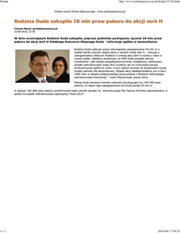 Drukuj 1z1 http://www.portalspozywczy.pl/drukuj/33736.html Wydruk strony Portalu SpoŜywczego - www.portalspoŜywczy.pl Rodzina Duda zakupiła 18 mln praw poboru do akcji serii H Łukasz Rawa, portalspozywczy.pl 16-06-2010, 15:38 W dniu wczorajszym Rodzina Duda zakupiła, poprzez podmioty powiązane, łącznie 18 mln praw poboru do akcji serii H Polskiego Koncernu Mięsnego Duda - informuje spółka w komunikacie. Rodzina Duda realizuje swoje zobowiązanie zaangaŜowania 20 mln zł w kapitał Spółki poprzez objęcie akcji w ramach emisji serii H. - Decyzja o zaangaŜowaniu własnych środków w emisję akcji serii H wynika z wiary w rozwój spółki. Jesteśmy przekonani, Ŝe PKM Duda posiada zdrowe fundamenty i jest bardzo perspektywiczną firmą. Dodatkowo, realizowany projekt restrukturyzacji Duda 2012 przełoŜy się na umocnienie pozycji konkurencyjnej spółki na rynku, a tym samym pozwoli na zbudowanie nowej trwałej wartości dla akcjonariuszy. Objęcie akcji zadeklarowaliśmy juŜ w lipcu 2009 roku w ramach podpisywanego porozumienia z Bankami dotyczącego restrukturyzacji finansowej" - mówi Maciej Duda, prezes firmy. Maciej Duda zamierza równieŜ wykonać przysługujące mu 230 000 praw poboru, co razem daje zaangaŜowanie na kwotę ponad 20 mln zł. O zakupie 100 000 praw poboru poinformował takŜe członek zarządu ds. restrukturyzacji Pan Dariusz Formela odpowiedzialny w spółce za projekt restrukturyzacji operacyjnej "Duda 2012". 2010-06-17 09:35