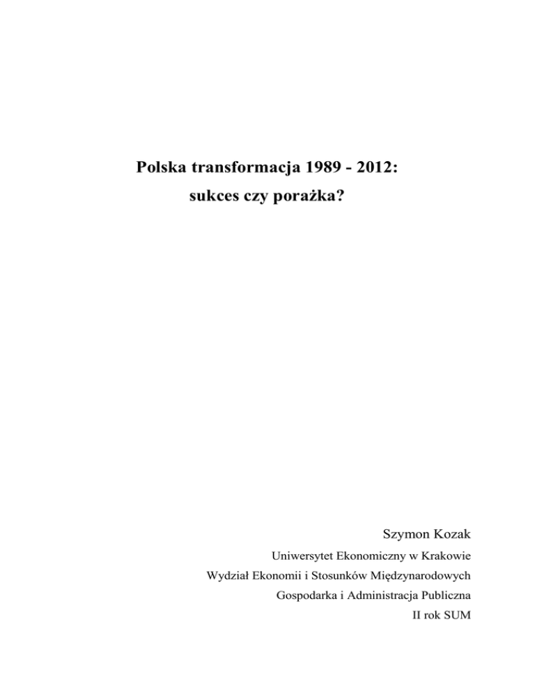 Polska transformacja 1989 - 2012: sukces czy porażka? Szymon Kozak Uniwersytet Ekonomiczny w Krakowie Wydział Ekonomii i Stosunków Międzynarodowych Gospodarka i Administracja Publiczna II rok SUM „Brak wiary w wolny rynek jest brakiem wiary w wolność” - Milton Friedman Wprowadzenie Wynik, niezależnie czy jest wygraną czy porażką, a posteriori analizowany jest przez pryzmat czynników składających się na sumaryczny rezultat. Sukces obwarowany jest pośrednimi zwycięstwami, często z samym sobą, poprzez dokonane wybory i podejmowane decyzje. W ocenie autora, polska transformacja 1989 - 2012 r. jest sukcesem. Była to operacja o szerokim zakresie, przeprowadzona na trzech głównych płaszczyznach; polityczno ustrojowej, gospodarczej oraz społeczno – obywatelskiej. Każda z nich wymagała kolejnych działań składowych. Intencją autora jest omówienie pośrednich sukcesów i najważniejszych rozwiązań, które wzajemnie się sumując i potęgując, pozwoliły Polsce osiągnąć taki wynik. Zakończenie natomiast, autor pragnie zadedykować malkontentom, odpowiadając przy tym na najczęściej pojawiające się zarzuty i oskarżenia wobec transformacji. Demokracja, decentralizacja i poczucie normalności Polska droga do transformacji ustrojowej ma kilka ważnych osiągnięć o charakterze politycznym; ustalenia zawarte podczas obrad Okrągłego Stołu, „kontraktowe” wybory 4 czerwca 1989 r. i powołanie rządu Tadeusza Mazowieckie 12 września, zwycięstwo w wyborach prezydenckich Lecha Wałęsy w 1990 r. i pierwszy w pełni demokratyczny rząd Jana Olszewskiego z 1991 roku1. To były zręby, na którym tworzył się demokratyczny establishment. W ten sposób Polacy odrzucali polityczne kajdany, które narzucono nadwiślańskiemu społeczeństwu pod pretekstem „radzieckiej przyjaźni”, którą umacniała przynależność do Układu Warszawskiego2, RWPG3 oraz czołgi i „braterska pomoc” w imię doktryny Breżniewa. W ten sposób osiągnięto jeden z najważniejszych sukcesów we współczesnej historii Polski – odzyskanie suwerenności i demokratyzację. Epilogiem tamtych rozwiązań było przystąpienie do NATO w 1999 r. i do Unii Europejskiej w 2004 r. Znaczącym osiągnięciem polskiego parlamentaryzmu jest Konstytucja III RP, uchwalona w 1997 roku. Zanim jednak doszło do jej uchwalenia, konieczne były zmiany 1 Stelmachowski A., Kształtowanie się ustroju III Rzeczypospolitej, Oficyna Wydawnicza Łośgraf, Warszawa 2011. s. 115. 2 Oficjalna nazwa: Układ o Przyjaźni, Współpracy i Pomocy Wzajemnej. Sojusz polityczno-militarny państw bloku wschodniego, z nadrzędną rolą ZSRR. Stanowił socjalistyczną wersję Paktu Północnoatlantyckiego (NATO). 3 Rada Wzajemnej Pomocy Gospodarczej. Organizacja gospodarcza zrzeszająca państwa socjalistyczne, z dominującą pozycją ZSRR. 2 konstytucyjne, wprowadzone przez sejm „kontraktowy”; reguły demokratycznego państwa prawa jako fundamentalna zasada ustroju, zmiana nazwy na Rzeczpospolita Polska i przywrócenie państwowemu herbowi korony, odejście od przewodniej roli PZPR i pluralistyczny system partyjny, usuniecie zapisu o przyjaźni z ZSRR i innymi krajami socjalistycznymi, określenie społeczeństwa mianem obywatelskiego, w zamian „ludowego” oraz zastrzeżenie, ze sejm stanowi „wolę narodu”, a nie jak w PRL-u „wyraziciela ludu pracującego miast i wsi”.4 Demokracja, jako idea, jest jednym z największych, niematerialnych osiągnięć ludzkości. Poza tą wielką zmianą, która dokonała się w Polsce, dla codziennego życia jej mieszkańców istotne znaczenie miało zyskanie poczucia normalności. Przez lata przynależności do bloku socjalistycznego Polacy byli indoktrynowani i zalewani ogromem pseudointelektualnych wywodów, przypisywanych Leninowi czy Marksowi. Kultura, tak ważny element tożsamości narodowej, musiała bronić się przed przesiąkniętym propagandą socrealizmem. Partyjna nowomowa, nadawała wszelkim publicznym dyskusjom groteskowego wymiaru. Zerwaniem z tymi pochodnymi komunizmu - zaprzestanie tytułowania wszystkiego „ludowym”, które swoją droga z ludowością niewiele miało wspólnego, pozwoliło Polakom poczuć, że żyją w normalnym kraju. Zwykłym, nastawionym pozytywnie do obywateli, nie posługującym się propagandowymi sloganami, które rzekomo miały docierać do mas, a w rzeczywistości sprawiały, że mieszkańcy tzw. „demoludów” nabyli się kompleksu niższości względem ludzi żyjących w krajach demokratycznych. Według oficjalnego przekazu w socjalizmie władze sprawowały wspomniane masy, w rzeczywistości faktycznie krąg decyzyjny był ściśle ograniczony, a nastawienie aparatu państwowego na kontrolę i inwigilację obywateli determinowało rozrastanie się administracji oraz tworzenie kolejnych biur i urzędów oraz podział kraju na 49 województw. Po oddziedziczeniu takiej struktury administracyjnej, reformatorzy musieli przeprowadzić gruntowne zmiany. Pierwszym aktem było przywrócenie w 1990 roku samorządu terytorialnego, a dopełnieniem wprowadzenie trzystopniowej hierarchii samorządu w 1999 roku z podziałem na 16 województw. Zbudowanie efektywnie działającego samorządu terytorialnego, zaowocowało faktycznym, nie ideologicznym, zmniejszeniem dystansu pomiędzy władzą publiczną a obywatelami. Nadanie wyborom samorządowym trybu powszechnego pozwoliło mieszkańcom wybierać swoich reprezentantów oraz weryfikować ich działalność. 4 Stelmachowski A., Kształtowanie się ustroju III Rzeczypospolitej, Oficyna Wydawnicza Łośgraf, Warszawa 2011. s. 120. 3 Demokratyzacja Polski zaowocowała szeregiem opracowań, analiz i uwzględnień w rankingach dotyczących sytuacji politycznej w kraju. Według Freedom House5 Polska jest krajem wolnym, z maksymalnymi notami za poziom wolności, wolność obywatelską i prawa polityczne. W ramach Democracy Index6, Polskę zlokalizowano na 45 pozycji w grupie demokracj