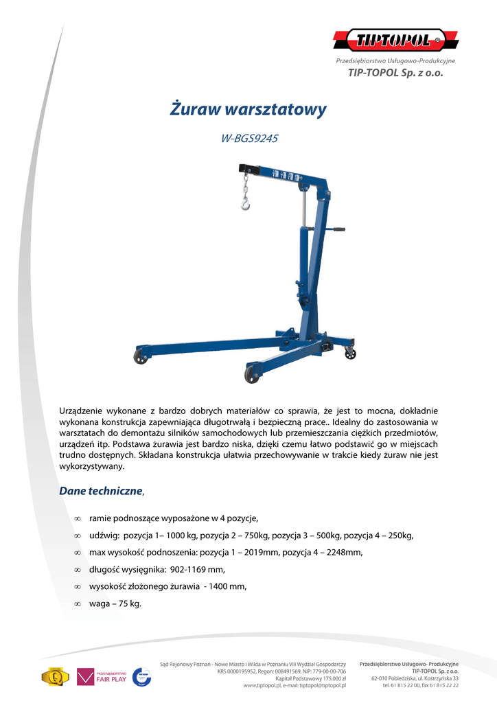 Żuraw warsztatowy W-BGS9245 Urządzenie wykonane z bardzo dobrych materiałów co sprawia, że jest to mocna, dokładnie wykonana konstrukcja zapewniająca długotrwałą i bezpieczną prace.. Idealny do zastosowania w warsztatach do demontażu silników samochodowych lub przemieszczania ciężkich przedmiotów, urządzeń itp. Podstawa żurawia jest bardzo niska, dzięki czemu łatwo podstawić go w miejscach trudno dostępnych. Składana konstrukcja ułatwia przechowywanie w trakcie kiedy żuraw nie jest wykorzystywany. Dane techniczne, • ramie podnoszące wyposażone w 4 pozycje, • udźwig: pozycja 1– 1000 kg, pozycja 2 – 750kg, pozycja 3 – 500kg, pozycja 4 – 250kg, • max wysokość podnoszenia: pozycja 1 – 2019mm, pozycja 4 – 2248mm, • długość wysięgnika: 902-1169 mm, • wysokość złożonego żurawia - 1400 mm, • waga – 75 kg. Wyposażenie dodatkowe Nr katalogowy Opis W-BGS8492 Uchwyt do żurawia regulowany Zdjęcia