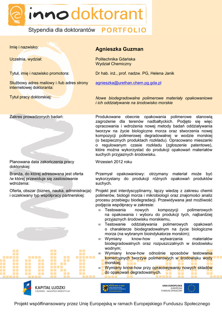 Imię i nazwisko: Agnieszka Guzman Uczelnia, wydział: Politechnika Gdańska Wydział Chemiczny Tytuł, imię i nazwisko promotora: Dr hab. inŜ., prof. nadzw. PG, Helena Janik SłuŜbowy adres mailowy i /lub adres strony internetowej doktoranta: [email protected] Tytuł pracy doktorskiej: Nowe biodegradowalne polimerowe materiały opakowaniowe i ich oddziaływanie na środowisko morskie Zakres prowadzonych badań: Produkowane obecnie opakowania polimerowe stanowią zagroŜenie dla terenów nadbałtyckich. Podjęto się więc opracowania i wdroŜenia nowej metody badań oddziaływania tworzyw na Ŝycie biologiczne morza oraz stworzenia nowej kompozycji polimerowej degradowalnej w wodzie morskiej (o bezpiecznych produktach rozkładu). Opracowano mieszanki o regulowanym czasie rozkładu (zgłoszenie patentowe), które moŜna wykorzystać do produkcji opakowań materiałów suchych przyjaznych środowisku. Planowana data zakończenia pracy doktorskiej: Wrzesień 2012 roku BranŜa, do której adresowana jest oferta /w której przewiduje się zastosowanie wdroŜenia: Przemysł opakowaniowy: otrzymany materiał moŜe być wykorzystany do produkcji róŜnych opakowań produktów suchych. Oferta, obszar (biznes, nauka, administracja) i oczekiwany typ współpracy partnerskiej: Projekt jest interdyscyplinarny, łączy wiedzę z zakresu chemii polimerów, biologii morza i mikrobiologii oraz znajomości analiz procesu przebiegu biodegradacji. Przewidywana jest moŜliwość podjęcia współpracy w zakresie: • Testowania nowych kompozycji polimerowych na opakowania i wyboru do produkcji tych, najbardziej przyjaznych środowisku morskiemu, • Testowanie oddziaływania polimerowych opakowań o charakterze biodegradowalnym na Ŝycie biologiczne morza (na wybranym bioindykatorze morskim); • Wymiany know-how wytwarzania materiałów biodegradowalnych oraz rozpuszczalnych w środowisku wodnym; • Wymiany know-how odnośnie sposobów testowania komercyjnych tworzyw polimerowych w środowisku wody morskiej; • Wymiany know-how przy opracowywaniu nowych składów do opakowań degradowalnych.