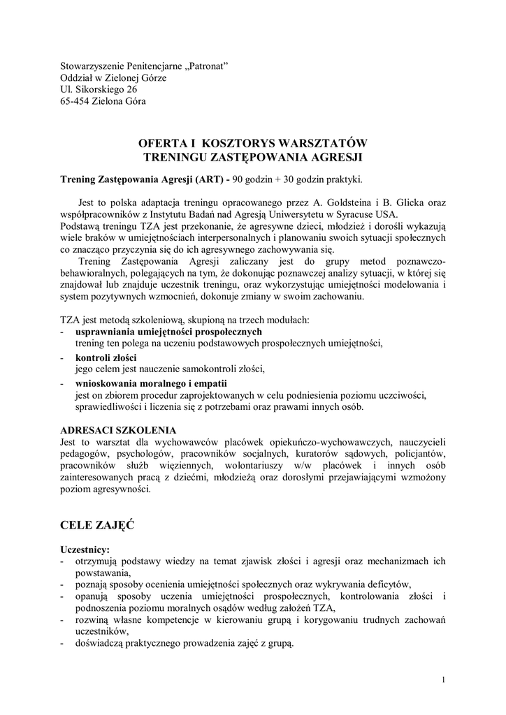 Stowarzyszenie Penitencjarne „Patronat” Oddział w Zielonej Górze Ul. Sikorskiego 26 65-454 Zielona Góra OFERTA I KOSZTORYS WARSZTATÓW TRENINGU ZASTĘPOWANIA AGRESJI Trening Zastępowania Agresji (ART) - 90 godzin + 30 godzin praktyki. Jest to polska adaptacja treningu opracowanego przez A. Goldsteina i B. Glicka oraz współpracowników z Instytutu Badań nad Agresją Uniwersytetu w Syracuse USA. Podstawą treningu TZA jest przekonanie, że agresywne dzieci, młodzież i dorośli wykazują wiele braków w umiejętnościach interpersonalnych i planowaniu swoich sytuacji społecznych co znacząco przyczynia się do ich agresywnego zachowywania się. Trening Zastępowania Agresji zaliczany jest do grupy metod poznawczobehawioralnych, polegających na tym, że dokonując poznawczej analizy sytuacji, w której się znajdował lub znajduje uczestnik treningu, oraz wykorzystując umiejętności modelowania i system pozytywnych wzmocnień, dokonuje zmiany w swoim zachowaniu. TZA jest metodą szkoleniową, skupioną na trzech modułach: - usprawniania umiejętności prospołecznych trening ten polega na uczeniu podstawowych prospołecznych umiejętności, - kontroli złości jego celem jest nauczenie samokontroli złości, - wnioskowania moralnego i empatii jest on zbiorem procedur zaprojektowanych w celu podniesienia poziomu uczciwości, sprawiedliwości i liczenia się z potrzebami oraz prawami innych osób. ADRESACI SZKOLENIA Jest to warsztat dla wychowawców placówek opiekuńczo-wychowawczych, nauczycieli pedagogów, psychologów, pracowników socjalnych, kuratorów sądowych, policjantów, pracowników służb więziennych, wolontariuszy w/w placówek i innych osób zainteresowanych pracą z dziećmi, młodzieżą oraz dorosłymi przejawiającymi wzmożony poziom agresywności. CELE ZAJĘĆ Uczestnicy: - otrzymują podstawy wiedzy na temat zjawisk złości i agresji oraz mechanizmach ich powstawania, - poznają sposoby ocenienia umiejętności społecznych oraz wykrywania deficytów, - opanują sposoby uczenia umiejętności prospołecznych, kontrolowania złości i podnoszenia poziomu moralnych osądów według założeń TZA, - rozwiną własne kompetencje w kierowaniu grupą i korygowaniu trudnych zachowań uczestników, - doświadczą praktycznego prowadzenia zajęć z grupą. 1 TREŚCI PROGRAMOWE I etap – warsztat podstawowy obejmuje 50 godzin (5dni) podzielonych na dwie części: Część 1 - (30 godzin), w trakcie której uczestnicy zostaną zapoznani z: - wiedzą dotyczącą agresji i przemocy (zdefiniowanie agresji i przemocy, przekonania dotyczące zachowań agresywnych), - mechanizmami powstawania i utrwalania zachowań agresywnych u dzieci i młodzieży oraz osób dorosłych, w tym: • zjawisko „modelowania” agresji i sprzyjające mu okoliczności, • agresja instrumentalna i jej przyczyny, - podstawami wiedzy o mechanizmach grupowych, dynamice i fazach rozwoju grupy, zawierania kontaktu z grupą, motywowania uczestników do pracy w grupie i stosowaniu różnych strategii motywacyjnych, zjawiskach oporu grupowego i sposobów radzenia sobie z nim, - technikami zachowań asertywnych, - podstawami teoretycznymi na których opiera się Trening Zastępowania Agresji, - wymaganiami wobec trenerów TZA (kwalifikacje i predyspozycje), - wynikami badań zachodnich, dotyczącymi efektywności pracy metodą TZA w różnych ośrodkach i społecznościach lokalnych, - metodyką prowadzenia treningu umiejętności prospołecznych, - metodyką prowadzenia treningu kontroli złości - różnymi sposobami wykorzystywania nabytych umiejętności w sytuacjach codziennego życia. Po tym etapie uczestnicy otrzymują materiały obejmujący, uwagi praktyczne oraz materiały używane w pracy z grupą, niezbędne do samodzielnego prowadzenia zajęć. Część 2 - trwająca 20 godzin W części tej uczestnicy poznają i ćwiczą: - metodykę prowadzenia treningu wnioskowania moralnego, - prowadzenie ćwiczeń rozwijających empatię, - sposoby wykorzystania nabytych umiejętności w sytuacjach codziennego życia, Uwaga: Nie przewiduje się możliwości zaliczenia warsztatu podstawowego, bez obecności na nim w pełnym wymiarze godzin. Praktyka Cel praktyk: - ćwiczenie diagnozowania braków umiejętności społecznych - nabycie umiejętności przeprowadzania głównych procedur nauczania: § modelowania § odgrywania scenek § udzielania informacji zwrotnych § transferu umiejętności - opanowanie procedur wzmacniania i podtrzymywania umiejętności - opanowanie strategii motywacyjnych, korygujących trudne zachowania uczestników podczas prowadzenia grupy - nabycie doświadczenia w realizacji trzech modułów TZA 2 Liczba prowadzących – dwóch trenerów. Uczestnicy grupy – osoby o podwyższonym poziomie agresji. Dobór grupy – poprzedzony rozmowami z przyszłymi uczestnikami, ich nauczycielami, opiekunami, których celem jest ocena umiejętności społecznych oraz wykrycie deficytów. Liczebność grupy – 6-8 osób. Dokumentacja: - Kwestionariusz Uczniowskich Umiejętności Prospołecznych - Kwestionariusz Trenerski Umiejętności Prospołecznych - Opis grupy, - Scenariusze prowadzonych zajęć, - Dokumentację z realizacji zajęć zebraną od uczestników: - Raporty z wykonywanych zadań domowych – raporty kontroli złości, raporty transferów trenowanych umiejętności i lista omawianych wartości podczas sesji dylematów moralnych, - Inne formy dokumentacji zajęć (fotografie, opracowania pisemne, zeszyty uczestników, rysunki tematyczne, nagrania audio lub video, analizy itp.). Długość trwania praktyk - 15 tygodni Efekty praktyk dla uczestników grupy (dzieci i młodzież): § przyswojenie nowych umiejętności w stopniu pozwalającym im na wprowadzenie ich w życie § łatwiejsze radzenie sobie w trudnych sytuacjach, § nauczenie się przewidywania konsekwencji i przez to unikania agresywnych zachowań § poprawa w relacjach z innymi ludźmi. II etap Superwizja: Po 