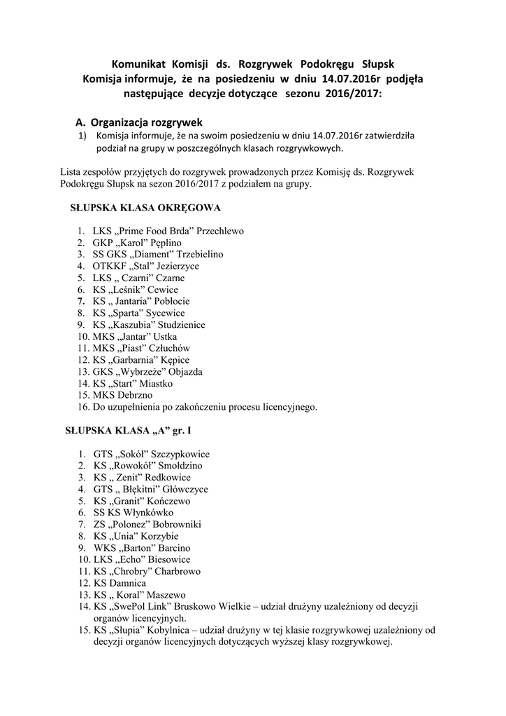 Komunikat Komisji ds. Rozgrywek Podokręgu Słupsk Komisja informuje, że na posiedzeniu w dniu 14.07.2016r podjęła następujące decyzje dotyczące sezonu 2016/2017: A. Organizacja rozgrywek 1) Komisja informuje, że na swoim posiedzeniu w dniu 14.07.2016r zatwierdziła podział na grupy w poszczególnych klasach rozgrywkowych. Lista zespołów przyjętych do rozgrywek prowadzonych przez Komisję ds. Rozgrywek Podokręgu Słupsk na sezon 2016/2017 z podziałem na grupy. SŁUPSKA KLASA OKRĘGOWA 1. LKS „Prime Food Brda” Przechlewo 2. GKP „Karol” Pęplino 3. SS GKS „Diament” Trzebielino 4. OTKKF „Stal” Jezierzyce 5. LKS „ Czarni” Czarne 6. KS „Leśnik” Cewice 7. KS „ Jantaria” Pobłocie 8. KS „Sparta” Sycewice 9. KS „Kaszubia” Studzienice 10. MKS „Jantar” Ustka 11. MKS „Piast” Człuchów 12. KS „Garbarnia” Kępice 13. GKS „Wybrzeże” Objazda 14. KS „Start” Miastko 15. MKS Debrzno 16. Do uzupełnienia po zakończeniu procesu licencyjnego. SŁUPSKA KLASA „A” gr. I 1. GTS „Sokół” Szczypkowice 2. KS „Rowokół” Smołdzino 3. KS „ Zenit” Redkowice 4. GTS „ Błękitni” Główczyce 5. KS „Granit” Kończewo 6. SS KS Włynkówko 7. ZS „Polonez” Bobrowniki 8. KS „Unia” Korzybie 9. WKS „Barton” Barcino 10. LKS „Echo” Biesowice 11. KS „Chrobry” Charbrowo 12. KS Damnica 13. KS „ Koral” Maszewo 14. KS „SwePol Link” Bruskowo Wielkie – udział drużyny uzależniony od decyzji organów licencyjnych. 15. KS „Słupia” Kobylnica – udział drużyny w tej klasie rozgrywkowej uzależniony od decyzji organów licencyjnych dotyczących wyższej klasy rozgrywkowej. SŁUPSKA KLASA „A” gr. II 1. GTS Czarna Dąbrówka 2. LKS „Granit” Koczała 3. LKS Łebunia 4. KS „Dolina – Speranda Gałąźnia Wielka 5. SS GKS „Myśliwiec” Tuchomie 6. KS „Stegna” Parchowo 7. KS „Zawisza” Borzytuchom 8. LZS „Arkonia” Pomysk Wielki 9. GKS „Lipniczanka” Lipnica 10. GKS „Sparta” Konarzyny 11. LKS „Prime Food Brda II” Przechlewo 12. GKS Kołczygłowy 13. KS „Magic” Niezabyszewo 14. KS „ Skotawa” Budowo SŁUPSKA KLASA „B” gr.I 1. KS „Victoria” Słupsk 2. KS „ Szansa” Siemianice 3. SS „ Grab” Grapice 4. SS KS „Unison” Machowino 5. TS „Pomorze” Potęgowo 6. GKP „Karol” Pęplino II 7. KS „Słupia” Charnowo 8. SS PN „Malczkowo – Łupawa” Malczkowo 9. KS „Sokół” Kuleszewo 10. KS Zaleskie 11. KS „ Dąb” Kusowo – udział drużyny w tej klasie rozgrywkowej uzależniony od decyzji organów licencyjnych dotyczących wyższych klas rozgrywkowych. 12. KS „Smoki” Podole Małe 13. KS „ Błękitni” Motarzyno SŁUPSKA KLASA „B” gr.II 1. GTS Czarna Dąbrówka II 2. KS „Baza 44” Siemirowice 3. KS „Start” Łebień 4. KS „Anioły” Garczegorze II 5. KS „Kaszubia” Studzienice II 6. MKS „Piast” Człuchów II 7. LKS „Pogoń” Lębork II 8. KS „Victoria” Dąbrówka 9. WKS Nożyno 10. KS „ Grom” Nakla 11. KS „ Urania” Udorpie 12. LZS „Orkan” Gostkowo SŁUPSKA KLASA JUNIOR „B” gr. I 1. GKP „Karol” Pęplino 2. OTKKF „Stal” Jezierzyce 3. MKS „Jantar” Ustka 4. KS „Start” Łeba 5. LKS „Pogoń” Lębork 6. KS „Chrobry” Charbrowo 7. KS Damnica 8. GKS „Wybrzeże” Objazda 9. KS „Anioły” Garczegorze 10. KS „Skotawia” Dębnica Kaszubska 11. SS GKS „Diament” Trzebielino 12. SS PN „Malczkowo – Łupawa” Malczkowo SŁUPSKA KLASA JUNIOR „B” gr. II 1. SS GKS „Myśliwiec” Tuchomie 2. LKS „ Czarni” Czarne 3. MKS „Drutex – Bytovia” Bytów 4. KS „Granit” Koczała 5. KS „Stegna” Parchowo 6. MLKS „ Tęcza” Brusy 7. KS „Zawisza” Borzytuchom 8. AP Człuchów 9. UKS „Lider” Rychnowy 10. ChKS „ Kolejarz” Chojnice 11. KS „Start” Miastko 12. MKS „Chojniczanka 1930” Chojnice SŁUPSKA KLASA JUNIOR „C1” gr. I 1. KS „Rowokół” Smołdzino 2. OTKKF „Stal” Jezierzyce 3. MKS „Jantar” Ustka 4. KS „Słupia” Kobylnica 5. KS „Chrobry” Charbrowo 6. KS Damnica 7. KS „ SwePol Link” Bruskowo Wielkie 8. KS Gryf Słupsk 9. KS „Garbarnia” Kępice 10. KS „Skotawia” Dębnica Kaszubska 11. KS „Dolina – Speranda” Gałąźnia Wielka SŁUPSKA KLASA JUNIOR „C1” gr. II – cztery rundy – propozycja oczekuje na akceptację Zarządu Pomorskiego ZPN 1. 2. 3. 4. 5. JFA Przechlewo SS „ Szarża” Krojanty LKS „ Czarni” Czarne MKS Debrzno MKS „Chojniczanka 1930” Chojnice SŁUPSKA KLASA JUNIOR „C2” 1. MKS „Drutex – Bytovia Bytów 2. AP Człuchów 3. KS „Kaszubia” Studzienice 4. MKS „Jantar” Ustka 5. ZS „Polonez” Bobrowniki 6. GKS „Wybrzeże” Objazda 7. KS „Anioły” Garczegorze 8. KS „Start” Miastko 9. GKS „Sparta” Konarzyny 10. KS Gryf Słupsk SŁUPSKA KLASA JUNIOR „D1” gr.I 1. GTS Czarna Dąbrówka 2. KS „Szansa” Siemianice 3. KS „Gryf” Słupsk 4. OTKKF „Stal” Jezierzyce 5. KS „KS Potęgowo” Potęgowo 6. LKS „Echo” Biesowice 7. KS „Anioły” Garczegorze 8. KS „ Dąb” Kusowo 9. KTS-K „ Lew” Lębork 10. KS „Chrobry” Charbrowo SŁUPSKA KLASA JUNIOR „D1” gr.II 1. JFA Przechlewo 2. MKS „Drutex – Bytovia” Bytów 3. SS GKS „Diament” Trzebielino 4. GKS „Drzewiarz” Rzeczenica 5. UKS „Lider” Rychnowy 6. MKS „Piast” Człuchów 7. GKS „Lipniczanka” Lipnica 8. KS „Start” Miastko 9. ChKS „ Kolejarz” Chojnice 10. MKS „Chojniczanka 1930” Chojnice SŁUPSKA KLASA JUNIOR „D2”gr. I 1. KS „Gryf” Słupsk 2. KS „ Olimpijczyk” Kwakowo 3. SOS „Salos” Słupsk 4. MKS „Jantar” Ustka 5. UKS „Byki” Słupsk 6. KS „Słupia” Charnowo 7. KS „Anioły” Garczegorze 8. GTS „Sokół” Szczypkowice 9. KS „Dolina – Speranda Gałąźnia Wielka 10. ULKS „U-2” Bytów SŁUPSKA KLASA JUNIOR „D2”gr. II – cztery rundy - propozycja oczekuje na akceptację Zarządu Pomorskiego ZPN 1. 2. 3. 4