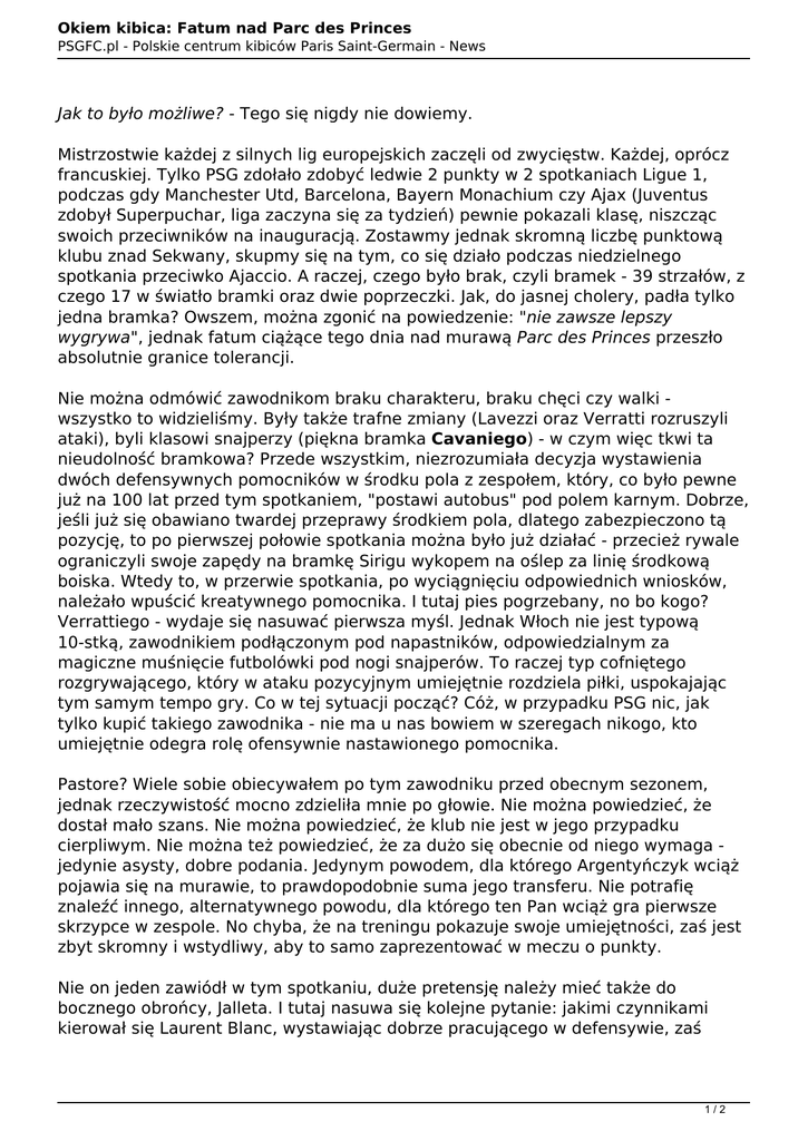 Okiem kibica: Fatum nad Parc des Princes PSGFC.pl - Polskie centrum kibiców Paris Saint-Germain - News Jak to było możliwe? - Tego się nigdy nie dowiemy. Mistrzostwie każdej z silnych lig europejskich zaczęli od zwycięstw. Każdej, oprócz francuskiej. Tylko PSG zdołało zdobyć ledwie 2 punkty w 2 spotkaniach Ligue 1, podczas gdy Manchester Utd, Barcelona, Bayern Monachium czy Ajax (Juventus zdobył Superpuchar, liga zaczyna się za tydzień) pewnie pokazali klasę, niszcząc swoich przeciwników na inauguracją. Zostawmy jednak skromną liczbę punktową klubu znad Sekwany, skupmy się na tym, co się działo podczas niedzielnego spotkania przeciwko Ajaccio. A raczej, czego było brak, czyli bramek - 39 strzałów, z czego 17 w światło bramki oraz dwie poprzeczki. Jak, do jasnej cholery, padła tylko jedna bramka? Owszem, można zgonić na powiedzenie: "nie zawsze lepszy wygrywa", jednak fatum ciążące tego dnia nad murawą Parc des Princes przeszło absolutnie granice tolerancji. Nie można odmówić zawodnikom braku charakteru, braku chęci czy walki wszystko to widzieliśmy. Były także trafne zmiany (Lavezzi oraz Verratti rozruszyli ataki), byli klasowi snajperzy (piękna bramka Cavaniego) - w czym więc tkwi ta nieudolność bramkowa? Przede wszystkim, niezrozumiała decyzja wystawienia dwóch defensywnych pomocników w środku pola z zespołem, który, co było pewne już na 100 lat przed tym spotkaniem, "postawi autobus" pod polem karnym. Dobrze, jeśli już się obawiano twardej przeprawy środkiem pola, dlatego zabezpieczono tą pozycję, to po pierwszej połowie spotkania można było już działać - przecież rywale ograniczyli swoje zapędy na bramkę Sirigu wykopem na oślep za linię środkową boiska. Wtedy to, w przerwie spotkania, po wyciągnięciu odpowiednich wniosków, należało wpuścić kreatywnego pomocnika. I tutaj pies pogrzebany, no bo kogo? Verrattiego - wydaje się nasuwać pierwsza myśl. Jednak Włoch nie jest typową 10-stką, zawodnikiem podłączonym pod napastników, odpowiedzialnym za magiczne muśnięcie futbolówki pod nogi snajperów. To raczej typ cofniętego rozgrywającego, który w ataku pozycyjnym umiejętnie rozdziela piłki, uspokajając tym samym tempo gry. Co w tej sytuacji począć? Cóż, w przypadku PSG nic, jak tylko kupić takiego zawodnika - nie ma u nas bowiem w szeregach nikogo, kto umiejętnie odegra rolę ofensywnie nastawionego pomocnika. Pastore? Wiele sobie obiecywałem po tym zawodniku przed obecnym sezonem, jednak rzeczywistość mocno zdzieliła mnie po głowie. Nie można powiedzieć, że dostał mało szans. Nie można powiedzieć, że klub nie jest w jego przypadku cierpliwym. Nie można też powiedzieć, że za dużo się obecnie od niego wymaga jedynie asysty, dobre podania. Jedynym powodem, dla którego Argentyńczyk wciąż pojawia się na murawie, to prawdopodobnie suma jego transferu. Nie potrafię znaleźć innego, alternatywnego powodu, dla którego ten Pan wciąż gra pierwsze skrzypce w zespole. No chyba, że na treningu pokazuje swoje umiejętności, zaś jest zbyt skromny i wstydliwy, aby to samo zaprezentować w meczu o punkty. Nie on jeden zawiódł w tym spotkaniu, duże pretensję należy mieć także do bocznego obrońcy, Jalleta. I tutaj nasuwa się kolejne pytanie: jakimi czynnikami kierował się Laurent Blanc, wystawiając dobrze pracującego w defensywie, zaś 1/2 Okiem kibica: Fatum nad Parc des Princes PSGFC.pl - Polskie centrum kibiców Paris Saint-Germain - News ułomnego w ataku Francuza, odstawiając na boczny tor mizernego w defensywie, zaś przyzwoicie prezentującego się w ofensywie Van der Wiela? Czy uważał, że Ajaccio będzie groźne z kontry? Ponownie - po to jest przerwa spotkania, żeby móc naprawić swoje błędy taktyczne. Dośrodkowania Jalleta wołają o pomstę do nieba, nie znam innego zawodnika tak parszywie wrzucającego futbolówkę w pole karne co Christophe. To na tym aspekcie piłkarskim powinni skoncentrować się trenerzy PSG, pracując na treningach z Francuzem - boczny obrońca bez umiejętności dośrodkowań? Okręgówka. Ponownie rozgorzała także dyskusja na temat poziomu sędziowania we Francji który nota bene leży i kwiczy na bardzo niskim poziomie. Każda kolejka przynosi coraz to nowe kontrowersje, podczas których w 90% przypadkach sędziowie podejmują złą decyzję. Nie chcę jednak komentować tego, co gwizdał sędzia Nicolas Rainville. Z dwóch powodów: pierwszy, że naprawdę ciężko było podjąć tą jedyną, słuszną decyzję w główkowym zderzeniu Matuidiego z Nadeau, a faul na Lavezzim w polu karnym znacznie lepiej widział sędzia asystent i to on powinien podnieść chorągiewkę do góry, zaś sędzie główny podtrzymał jego decyzję o niegwizdaniu tego. Drugim, znacznie ważniejszym powodem, na który nie chcę zganiać i szukać wymówek, jest przepotężna przestrzeń, oddzielająca klasę zespołu Ajaccio do Paris Saint-Germain (z całym szacunkiem do klubu z Korsyki). Jest to niewyobrażalna różnica finansowa, infrastrukturalna oraz w umiejętnościach piłkarskich. "Wielkie" PSG szukające pocieszenia w niedobrym sędziowaniu? Litości. Ajaccio powinno zostać wdeptane w murawę, zmiażdżone i wyplute. W przypadku mierzenia się z zespołami o podobnej klasie co PSG (jak Milan, Valencia czy Arsenal), wtedy dopiero można, aczkolwiek nie powinno się, usprawiedliwiać wyniki niektórymi błędnymi decyzjami sędziego. Przecież to tylko człowiek. Ciemne chmury powolutku zbierają się nad głową Laurent Blanca - po dwóch kolejkach Paris Saint-Germain ma cztery punkty straty do prowadzących Lyonu, OM oraz Saint-Etienne. Jeśli zespół nie odnajdzie szybko antidotum na kiepski start, prasa ponownie zacznie szukać nowego nazwiska na stanowisku szkoleniowca PSG. Przyznać jednak należy jedno: takich emocji, jakie przeżywali fani pod koniec spotkania, nie było od dawna w występach Paris Saint-Germain. To 