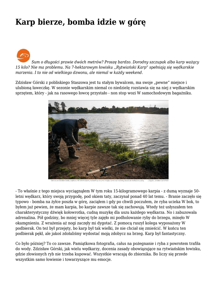 Karp bierze, bomba idzie w górę Sum o długości prawie dwóch metrów? Proszę bardzo. Dorodny szczupak albo karp ważący 15 kilo? Nie ma problemu. Na 7-hektarowym łowisku ,,Rytwiański Karp” spełniają się wędkarskie marzenia. I to nie od wielkiego dzwonu, ale niemal w każdy weekend. Zdzisław Górski z pobliskiego Staszowa jest tu stałym bywalcem, ma swoje „pewne” miejsce i ulubioną ławeczkę. W sezonie wędkarskim niemal co niedzielę rozstawia się na niej z wędkarskim sprzętem, który - jak na rasowego łowcę przystało - non stop wozi W samochodowym bagażniku. - To właśnie z tego miejsca wyciągnąłem W tym roku 15-kilogramowego karpia - z dumą wyznaje 50letni wędkarz, który swoją przygodę, pod okiem taty, zaczynał ponad 40 lat temu. - Branie zaczęło się typowo - bomba na żyłce poszła w górę, zaciąłem i gdy po chwili poczułem, że ryba ucieka W bok, to byłem już pewien, że mam karpia, bo karpie zawsze tak się zachowują. Wtedy też usłyszałem ten charakterystyczny dźwięk kołowrotka, cudną muzykę dla uszu każdego wędkarza. No i zabuzowała adrenalina. Pół godziny, bo mniej więcej tyle zajęło mi podholowanie ryby do brzegu, minęło W okamgnieniu. Z wrażenia aż nogi zaczęły mi dygotać. Z pomocą ruszył kolega wyposażony W podbierak. On też był przejęty, bo karp był tak wielki, że nie chciał się zmieścić. W końcu ten podbierak pękł, ale jakoś zdołaliśmy wydostać moją zdobycz na brzeg. Karp był fantastyczny. Co było póżniej? To co zawsze. Pamiątkowa fotografia, całus na pożegnanie i ryba z powrotem trafiła do wody. Zdzisław Górski, jak wielu wędkarzy, docenia zasady obowiązujące na rytwiańskim łowisku, gdzie złowionych ryb nie trzeba kupować. Wszystkie wracają do zbiornika. Bo liczy się przede wszystkim samo łowienie i towarzyszące mu emocje. Dziś (połowa września) Zdzisław Górski nastawił się na suma (jakiś czas temu złowił tu 16kilogramową sztukę) i karpia. Suma kusi rosówką, karpia zaś słodką kukurydzą, bo -jak wiadomo karp łasy jest na słodkości, ale zwabić go też może kulka proteinowa i pinka, czyli kolorowe robaki. Wszelkiego rodzaju sprzętu i zanęty wędkarz ze Staszowa przywiózł ze sobą sporo, ale to i tak niewiele W porównaniu z typowymi karpiarzami, którzy od czasu do czasu pojawiają się również w Rytwianach. Sprzęt z najwyższej półki Karpiowi zawodowcy W sprzęt inwestują naprawdę duże kwoty. Jeśli upatrzą sobie miejsce W odległej części stawu, W które nie są W stanie dorzucić Wędką, to wyciągają sterowane radiem specjalne małe łódki. Ładują na nie zanętę, którą następnie, dzięki GPS, wyrzucają - podobnie jak później haczyk z przynętą - W ściśle określonym miejscu. Czasami na tych sterowanych łódkach montują też echo- sondy, dzięki którym są W stanie monitorować dno stawu i wypatrywać ryby. I czekają na ruch bomby na Wędce. A co się dzieje, gdy ryba już pojawi się na brzegu? Trafia do specjalnej, częściowo wypełnionej Wodą maty, wykonanej z miękkiej, wodoodpornej tkaniny. Chodzi o to, by taki do- rodny karp nie rzucał się na trawie albo piachu i przypadkiem się nie uszkodził. W macie też zdejmuje się haczyk, dezynfekuje miejsce W pysku i na koniec myje rybę przed zrobieniem pamiątkowej fotki i ponownym wpuszczeniem do stawu. Przyroda cieszy oko Co przyciąga wędkarzy na łowisko W Rytwianach? Zdzisław Górski odpowiada krótko: - Przyroda. Przed chwilą podziwialiśmy trzy krążące na stawem orły bieliki, pięknie startującą z wody parę łabędzi, pojawiają się czaple i wiele innych rzadkich gatunków ptaków. Po prostu tutaj nie czuje się tej Wszechobecnej cywilizacji. Wręcz przeciwnie - człowiek cieszy oko pięknem naszego Świętokrzyskiego. Pewnie, że mógłbym wędkować na stawie W Staszowie albo Oleśnicy. Ale jakoś nie mogę znieść, że chodnikiem, kilka metrów ode mnie, co chwilę przechodzą ludzie, a jak już jest niedziela i tłum idzie do kościoła, to już jest zupełnie przechlapane. Co chwilę słyszę: - ,,I jak, biorą?”. To strasznie denerwujące. Wędkarze zajeżdżający do Rytwian przede wszystkim jednak zgodnie wskazują na Wyższość łowiska nad dzikimi wodami. - Tutaj ryba prędzej czy później weźmie, bo wiadomo, że ta ryba jest. Nad jeziorem już tej pewności nie ma. Ile to razy wystałem cały dzień i nic nie zacięło Tu zawsze się coś dzieje - mówi Łukasz Rogala z Zięblic i na potwierdzenie swych słów sięga do podbieraka po szczupaka, którego wyciągnął z Wody dosłownie przed dziesięcioma minutami. To właśnie na tego typu drapieżniki nastawia się dzisiaj Łukasz Rogala. Oprócz szczupaków interesują go także sandacze i okonie. Strategia połowu drapieżników jest zupełnie inna niż W przypadku białej ryby. Nie trzeba żadnych zanęt, ławeczek do siedzenia, bomb na żyłki. Wystarczy wędka, szczypce do od haczania złowionej ryby i jakaś przynęta - wobler albo gumka. - I tak macham tą Wędką - zarzucam i ściągam, zarzucam i ściągam, co jakiś czas zmieniąjąc stanowisko i rodzaj przynęty - tłumaczy Łukasz Rogala, który W Rytwianach wyciągnął już czterokilogramowego szczupaka. - Tak to już jest, drapieżnika trzeba szukać. Poruszam się przy tym trochę, no i nachodzę, bo zwy- kle W ciągu trzech godzin okrążam całe łowisko. Za te trzy godziny superprzyjemności płacę 10 zł i na dodatek nie muszę kupować żadnej karty węd karskiej. I tak to powinno wyglądać. Krystyna Tyniec z Gospodarstwa Rybackiego „Rytwiany”, przy którym od czerwca 2015 roku działa ,,Rytwiański Karp”, zaznacza, że łowisko będzie się rozwijać. - Już teraz funkcjonuje przy nim wędkarski hotelik na 10 osób, a gościom oferujemy pochodzącego z naszego gospodarstwa karpia wędzonego - mówi Krystyna Tyniec. - Na stronie internetowej gospodarstwa (www.polskikarp.pl), na której publ