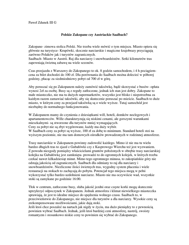 Paweł Zdunek III G Polskie Zakopane czy Austriackie Saalbach? Zakopane- zimowa stolica Polski. Nie trzeba wiele mówić o tym miejscu. Miasto opiera się głównie na turystyce- Krupówki, skocznie narciarskie i magiczne krajobrazy przyciągają zarówno Polaków jak i turystów zagranicznych. Saalbach- Miasto w Austrii. Raj dla narciarzy i snowboardzistów. Setki kilometrów tras zapewniają świetną zabawę na wiele sezonów. Czas przejazdu z Warszawy do Zakopanego to ok. 8 godzin samochodem, i 4 h pociągiemcena za bilet dochodzi do 100 zł. Dla porównania do Saalbach można dolecieć w półtorej godziny, płacąc za siedmiodniowy pobyt od 700 zł w górę. Aby poruszać się po Zakopanem należy zamówić taksówkę, bądź skorzystać z busów- opłata wynosi 2zł za osobę. Busy są z reguły zatłoczone, jednak ich stan jest dobry. Zakopane to małe miasteczko, nie ma tu dużych supermarketów, wszystko jest blisko i niepotrzebna za każdym razem zamawiać taksówki, aby się skutecznie poruszać po mieście. Saalbach to duże miasto, w którym ceny za przejazd taksówką są o wiele wyższe. Tutaj samochód jest niezbędny do normalnego funkcjonowania. W Zakopanem mamy do czynienia z dziesiątkami will, hoteli, domków noclegowych i apartamentowców. Wille charakteryzują się niskimi cenami, ale gorszymi warunkami mieszkalnymi- są stworzone dla turystów mniej wymagających. Ceny za pobyt nie są zbyt wygórowane, każdy ma duży wybór. W Saalbach ceny za pobyt są wyższe, 100 zł za dobę to minimum. Standard hoteli stoi na wyższym poziomie, nie ma tam domowych ośrodków prowadzonych w rodzinnej atmosferze. Trasy narciarskie w Zakopanem powinny zadowolić każdego. Mimo iż nie ma tu wielu bardzo długich tras to zjazd z Gubałówki czy z Kasprowego Wierchu też jest wyzwaniem. Z powodu niezgody pomiędzy właścicielami gruntów położonych w obrębie trasy narciarskiej kolejka na Gubałówkę jest zamknięta- prowadzi to do ogromnych kolejek, w których trzeba czekać nawet kilkadziesiąt minut. Mimo tego ogromnego minusa, to zakopiańskie góry nie odstają jakością od zagranicznych. Saalbach dla odmiany to raj dla narciarzy i snowboardzistów. Niezliczone ilości świetnych tras, wygodny system płacenia i wiele restauracji na stokach to zachęcają do pobytu. Potencjał tego miejsca mogą w pełni wykorzystać tylko bardzo uzdolnieni narciarze. Miasto nie ma oczywiście wad, wszystkie stoki są zamykane po godzinie 16:00. Tłok w centrum, zatłoczone busy, słaba jakość jezdni oraz częste korki mogą skutecznie uprzykrzyć odpoczynek w Zakopanem. Jednak atmosfera i klimat niewielkiego miasteczka sprawiają, że jest to idealne miejsce do spędzenia wolnego czasu. Saalbach to, w przeciwieństwie do Zakopanego, nie miejsce dla turystów a dla narciarzy. Wysokie ceny są zrekompensowane możliwościami, jakie dają stoki. Jeśli ktoś chce poszaleć na nartach jak nigdy w życiu, ma dużo pieniędzy to z pewnością powinien wybrać Saalbach. Jednak, jeśli ktoś bardziej ceni atmosferę, nastrój, swoisty romantyzm i stosunkowo niskie ceny to powinien się wybrać do Zakopanego.