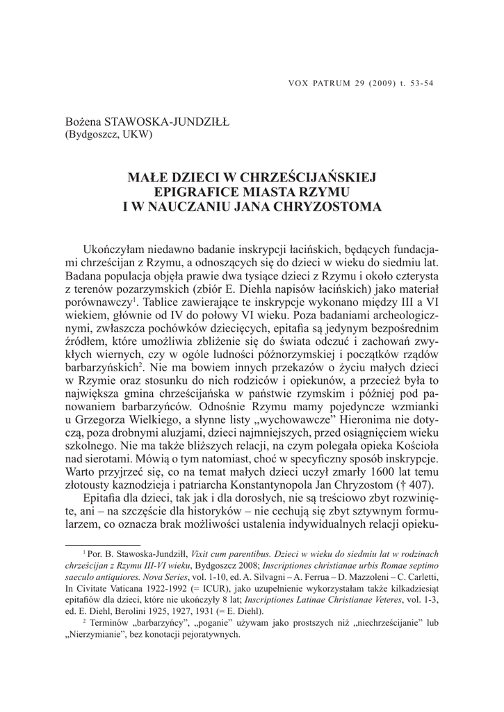 V O X PAT R U M 2 9 ( 2 0 0 9 ) t . 5 3 - 5 4 Bożena STAWOSKA-JUNDZIŁŁ (Bydgoszcz, UKW) MAŁE DZIECI W CHRZEŚCIJAŃSKIEJ EPIGRAFICE MIASTA RZYMU I W NAUCZANIU JANA CHRYZOSTOMA Ukończyłam niedawno badanie inskrypcji łacińskich, będących fundacjami chrześcijan z Rzymu, a odnoszących się do dzieci w wieku do siedmiu lat. Badana populacja objęła prawie dwa tysiące dzieci z Rzymu i około czterysta z terenów pozarzymskich (zbiór E. Diehla napisów łacińskich) jako materiał porównawczy1. Tablice zawierające te inskrypcje wykonano między III a VI wiekiem, głównie od IV do połowy VI wieku. Poza badaniami archeologicznymi, zwłaszcza pochówków dziecięcych, epitafia są jedynym bezpośrednim źródłem, które umożliwia zbliżenie się do świata odczuć i zachowań zwykłych wiernych, czy w ogóle ludności późnorzymskiej i początków rządów barbarzyńskich2. Nie ma bowiem innych przekazów o życiu małych dzieci w Rzymie oraz stosunku do nich rodziców i opiekunów, a przecież była to największa gmina chrześcijańska w państwie rzymskim i później pod panowaniem barbarzyńców. Odnośnie Rzymu mamy pojedyncze wzmianki u Grzegorza Wielkiego, a słynne listy „wychowawcze” Hieronima nie dotyczą, poza drobnymi aluzjami, dzieci najmniejszych, przed osiągnięciem wieku szkolnego. Nie ma także bliższych relacji, na czym polegała opieka Kościoła nad sierotami. Mówią o tym natomiast, choć w specyficzny sposób inskrypcje. Warto przyjrzeć się, co na temat małych dzieci uczył zmarły 1600 lat temu złotousty kaznodzieja i patriarcha Konstantynopola Jan Chryzostom († 407). Epitafia dla dzieci, tak jak i dla dorosłych, nie są treściowo zbyt rozwinięte, ani – na szczęście dla historyków – nie cechują się zbyt sztywnym formularzem, co oznacza brak możliwości ustalenia indywidualnych relacji opieku1 Por. B. Stawoska-Jundziłł, Vixit cum parentibus. Dzieci w wieku do siedmiu lat w rodzinach chrześcijan z Rzymu III-VI wieku, Bydgoszcz 2008; Inscriptiones christianae urbis Romae septimo saeculo antiquiores. Nova Series, vol. 1-10, ed. A. Silvagni – A. Ferrua – D. Mazzoleni – C. Carletti, In Civitate Vaticana 1922-1992 (= ICUR), jako uzupełnienie wykorzystałam także kilkadziesiąt epitafiów dla dzieci, które nie ukończyły 8 lat; Inscriptiones Latinae Christianae Veteres, vol. 1-3, ed. E. Diehl, Berolini 1925, 1927, 1931 (= E. Diehl). 2 Terminów „barbarzyńcy”, „poganie” używam jako prostszych niż „niechrześcijanie” lub „Nierzymianie”, bez konotacji pejoratywnych. 234 BOŻENA STAWOSKA-JUNDZIŁŁ nów z dziećmi. Te, które badałam mają jedną cechę wspólną – podawanie wieku zmarłych dzieci, dzięki czemu mogłam z fundacji rodzicielskich wyróżnić te dla małych dzieci. Najprostsze zawierają tylko imię (wtedy pojedyncze) i wiek dziecka. W nieco bogatszych, obok tego występują także drobne elementy ikonograficzne, listki, kropki lub chryzmony. W dłuższych epitafiach pojawiają się również epitety dotyczące zmarłych dzieci, określenia tego, co je spotkało i czeka po śmierci, a także terminy związane z samym faktem śmierci i pochówku. Tu też podaje się także dane konkretne: o czasie śmierci, dacie pogrzebu (o wiele częściej), rzadko o dacie chrztu. W takich napisach są również wzmianki o fundatorach, najczęściej rodzicach, rzadziej samym ojcu lub matce, najrzadziej dziadkach, rodzeństwie lub opiekunach. Zamiast informacji o fundatorach często pojawia się tylko dedykacja dla córki lub syna. Najmniej informacji dotyczy życia dziecka, z czego wnioskujemy, że nie potrafiono wyartykułować opisów codziennych zachowań niemowląt i dzieci kilkuletnich lub uznawano je za niegodne uwiecznienia. Pozostają nieliczne wyrazy zachwytu nad wyjątkowością dziecka, jego pięknem, zdolnościami przejawianymi w rozpoczętej dopiero nauce (to zwłaszcza w stosunku do najstarszych w tej grupie 6-7 latków). Nie ma także na ogół wyraźnie i wprost zdefiniowanych uczuć fundatorów tablic odnośnie faktu śmierci dzieci, jak i tego, co czuli wcześniej do żyjących poza najczęściej stosowanymi epitetami dulcissimus, -a, carissimus, - a. Rozkład ilościowy omawianych danych, to kilkanaście epitafiów dla noworodków do miesiąca życia, nieco ponad dwieście dla dzieci do roku, a około 700 dla dzieci do ukończonego 3 roku. Skok ilościowy to około 1000 epitafiów wystawionych dzieciom od ukończonych 3 do niepełnych 8 lat. Proporcje między płciami nie są mocno zachwiane, przewaga chłopców zwłaszcza w grupach 1-3 i 3-7 lat obejmuje tylko nieco ponad 10%, choć zarówno niechrześcijanie, jak i chrześcijanie na ogół częściej upamiętniali mężczyzn niż kobiety. Co można wyczytać z analizowanych inskrypcji? W literaturze naukowej panuje zgoda co do wysokiej, a nawet bardzo wysokiej śmiertelności dzieci w Cesarstwie Rzymskim3. Tym bardziej dotyczy to okresu panowania najeźdźców w Rzymie i rekonkwisty Bizantyjczyków z racji choćby długotrwałych wojen, co epitafia zdają się potwierdzać nie tylko ilością fundowanych tablic, ale i poprzez świadectwa wysokiej dzietności, która trwa czasami wyjątkowo długo, do ponad 30 lat u kobiet, a małe dzieci mają mężczyźni po 50 roku życia. Oznacza to w wielu przypadkach powtórne, a nawet wielokrotne małżeństwa i fundowanie napisów dzieciom z poprzednich związków, bez zaznaczania tego faktu i różnicowania dzieci. Podobnie zresztą nie widać większych różnic między treściami epitafiów dla chłopców i dziewczynek, różnice wy- Por. W. Scheidel, Roman Age Structure: Evidence and Models, JRS 91 (2001) 1-26; W. Suder, Census populi. Demografia starożytnego Rzymu, Wrocław 2003 i podana tam literatura naukowa. 3 MAŁE DZIECI W CHRZEŚCIJAŃSKIEJ EPIGRAFICE MIASTA RZYMU 235 stępują między młodszymi i starszymi – dla tych ostatnich przeznaczano na ogół epitafia nieco obszerniejsze. 
