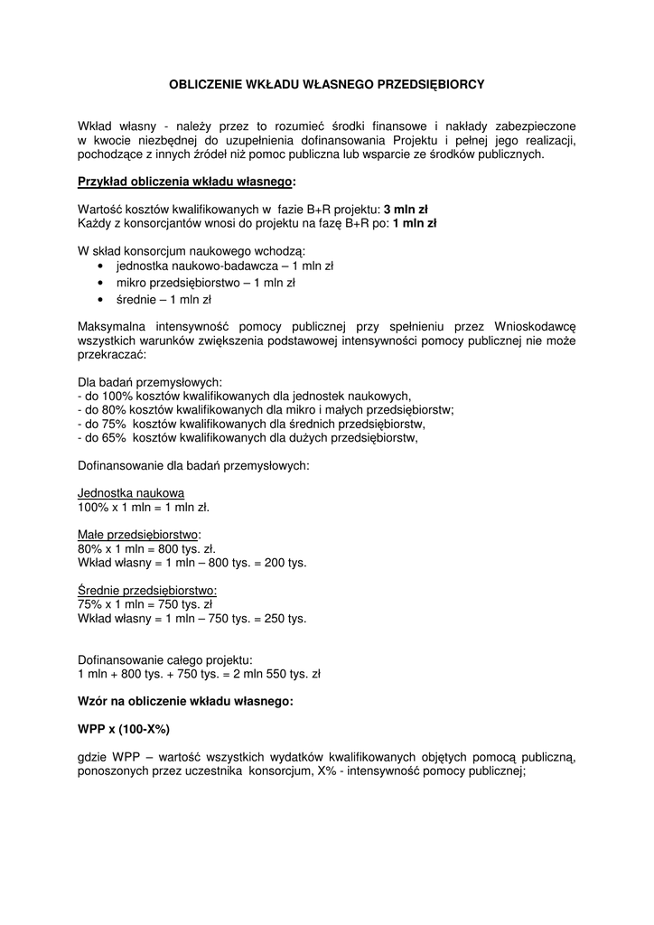 OBLICZENIE WKŁADU WŁASNEGO PRZEDSIĘBIORCY Wkład własny - należy przez to rozumieć środki finansowe i nakłady zabezpieczone w kwocie niezbędnej do uzupełnienia dofinansowania Projektu i pełnej jego realizacji, pochodzące z innych źródeł niż pomoc publiczna lub wsparcie ze środków publicznych. Przykład obliczenia wkładu własnego: Wartość kosztów kwalifikowanych w fazie B+R projektu: 3 mln zł Każdy z konsorcjantów wnosi do projektu na fazę B+R po: 1 mln zł W skład konsorcjum naukowego wchodzą: • jednostka naukowo-badawcza – 1 mln zł • mikro przedsiębiorstwo – 1 mln zł • średnie – 1 mln zł Maksymalna intensywność pomocy publicznej przy spełnieniu przez Wnioskodawcę wszystkich warunków zwiększenia podstawowej intensywności pomocy publicznej nie może przekraczać: Dla badań przemysłowych: - do 100% kosztów kwalifikowanych dla jednostek naukowych, - do 80% kosztów kwalifikowanych dla mikro i małych przedsiębiorstw; - do 75% kosztów kwalifikowanych dla średnich przedsiębiorstw, - do 65% kosztów kwalifikowanych dla dużych przedsiębiorstw, Dofinansowanie dla badań przemysłowych: Jednostka naukowa 100% x 1 mln = 1 mln zł. Małe przedsiębiorstwo: 80% x 1 mln = 800 tys. zł. Wkład własny = 1 mln – 800 tys. = 200 tys. Średnie przedsiębiorstwo: 75% x 1 mln = 750 tys. zł Wkład własny = 1 mln – 750 tys. = 250 tys. Dofinansowanie całego projektu: 1 mln + 800 tys. + 750 tys. = 2 mln 550 tys. zł Wzór na obliczenie wkładu własnego: WPP x (100-X%) gdzie WPP – wartość wszystkich wydatków kwalifikowanych objętych pomocą publiczną, ponoszonych przez uczestnika konsorcjum, X% - intensywność pomocy publicznej;