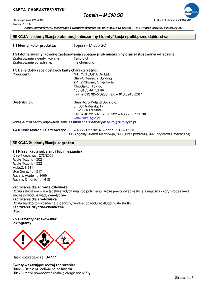 KARTA CHARAKTERYSTYKI Topsin – M 500 SC Data aktualizacji 21.09.2015 Data wydania 02.2007 Wersja PL: 5.0 Karta Charakterystyki jest zgodna z Rozporządzeniem WE 1907/2006 z 18.12.2006 – REACH oraz 2015/830 z 28.05.2015r. SEKCJA 1: Identyfikacja substancji/mieszaniny i identyfikacja spółki/przedsiębiorstwa 1.1 Identyfikator produktu: Topsin – M 500 SC 1.2 Istotne zidentyfikowane zastosowania substancji lub mieszaniny oraz zastosowania odradzane: Zastosowanie zidentyfikowane: Fungicyd Zastosowanie odradzane: nie określono 1.3 Dane dotyczące dostawcy karty charakterystyki: Producent: NIPPON SODA Co Ltd. Shin-Ohtemachi Building 2-1, 2-Chome, Ohtemachi Chioda-ku, Tokyo, 100-8165 JAPONIA Tel.: + 813 3245 6268, fax: + 813 3245 6287 Dystrybutor: Sumi Agro Poland Sp. z o.o. ul. Bonifraterska 17 00-203 Warszawa Tel.: + 48 22 637 32 37, fax: + 48 22 637 32 38 www.sumiagro.pl Adres e-mail osoby odpowiedzialnej za kartę charakterystyki: [email protected] 1.4 Numer telefonu alarmowego: + 48 22 637 32 37 – godz. 7.30 – 15.30 112 (ogólny telefon alarmowy), 998 (straż pożarna), 999 (pogotowie medyczne); SEKCJA 2: Identyfikacja zagrożeń 2.1 Klasyfikacja substancji lub mieszaniny Klasyfikacja wg 1272/2008 Acute Tox. 4; H302 Acute Tox. 4; H332 Muta.2; H341 Skin Sens. 1; H317 Aquatic Acute 1; H400 Aquatic Chronic 1; H410 Zagrożenia dla zdrowia człowieka Działa szkodliwie w następstwie wdychania i po połknięciu. Może powodować reakcję alergiczną skóry. Podejrzewa się, że powoduje wady genetyczne Zagrożenia dla środowiska Działa bardzo toksycznie na organizmy wodne, powodując długotrwałe skutki. Zagrożenia fizyczne/chemiczne Brak 2.2 Elementy oznakowania: Piktogramy: Hasło ostrzegawcze: Uwaga Zwroty wskazujące rodzaj zagrożenia: H302 – Działa szkodliwie po połknięciu H317 – Może powodować reakcję alergiczną skóry Strona 1 z 8 KARTA CHARAKTERYSTYKI Topsin – M 500 SC Data aktualizacji 21.09.2015 Data wydania 02.2007 Wersja PL: 5.0 Karta Charakterystyki jest zgodna z Rozporządzeniem WE 1907/2006 z 18.12.2006 – REACH oraz 2015/830 z 28.05.2015r. H332 – Działa szkodliwie w następstwie wdychania H341 – Podejrzewa się, że powoduje wady genetyczne H410 – Działa bardzo toksycznie na organizmy wodne, powodując długotrwałe skutki EUH401 – W celu uniknięcia zagrożeń dla zdrowia ludzi i środowiska, należy postępować zgodnie z instrukcją użycia Zwroty określające warunki bezpiecznego stosowania: P202 – Nie używać przed zapoznaniem się i zrozumieniem wszystkich środków bezpieczeństwa. P261 – Unikać wdychania mgły P281 – Stosować wymagane środki ochrony indywidualnej Składniki niebezpieczne: Tiofanat metylowy; 1,2-di(3-metoksykarbonylo--2-tioureido) benzen; 500 g w 1 litrze środka (41,91%). 2.3 Inne zagrożenia: Brak informacji na temat spełnienia kryteriów PBT lub vPvB zgodnie z załącznikiem XIII rozporządzenia REACH. Odpowiednie badania nie były przeprowadzone. SEKCJA 3: Skład/informacja o składnikach 3.1 Substancje Nie dotyczy. 3.2 Mieszaniny: Niebezpieczne składniki: Klasyfikacja CLP Identyfikator produktu Tiofanat metylowy (PN); 1,2-di(3metoksykarbonylo--2-tioureido) benzen; CAS: 23564-05-8 WE: 245-740-7 Nr indeksowy: 006-069-00-3 Nr REACH: substancja podlega przepisom okresu przejściowego Kwas fenolosulfonowy formaldehyd polikondensat jako sól sodowa CAS: 102980-04-1 WE: 600-378-2 Nr indeksowy: Nr REACH: substancja podlega przepisom okresu przejściowego Pełna treść zwrotów H w sekcji 16 Zawartość % Klasa zagrożenia i kody kategorii Kody zwrotów wskazujących rodzaj zagrożenia 41,7 Muta. 2 Acute Tox. 4 Skin Sens. 1 Aquatic Acute 1 Aquatic Chronic 1 H341 H332 H317 H400 H410 1,7 Aquatic Chronic 3 H412 SEKCJA 4: Środki pierwszej pomocy 4.1 Opis środków pierwszej pomocy W przypadku kontaktu ze skórą Zdjąć zanieczyszczoną odzież, umyć zabrudzoną skórę wodą z mydłem, spłukać dokładnie wodą, w przypadku pojawienia się podrażnienia, rumieni skontaktować się z lekarzem. W przypadku kontaktu z oczami Przepłukać oczy przez kilkanaście minut (ok. 15) dużą ilością wody, trzymając powieki szeroko rozwarte. Unikać silnego strumienia, ze względu na niebezpieczeństwo uszkodzenia rogówki - natychmiast skontaktować się z lekarzem. Strona 2 z 8 KARTA CHARAKTERYSTYKI Topsin – M 500 SC Data wydania 02.2007 Data aktualizacji 21.09.2015 Wersja PL: 5.0 Karta Charakterystyki jest zgodna z Rozporządzeniem WE 1907/2006 z 18.12.2006 – REACH oraz 2015/830 z 28.05.2015r. Narażenie inhalacyjne W razie zawrotów głowy lub nudności wyprowadzić poszkodowanego na świeże powietrze, w razie braku szybkiej poprawy zasięgnąć porady lekarza. W przypadku połknięcia Nie wywoływać wymiotów, przepłukać usta, nie połykając wody, natychmiast skontaktować się z lekarzem. 4.2 Najważniejsze ostre i opóźnione objawy oraz skutki narażenia: Układ oddechowy. W warunkach ekstremalnego narażenia wdychanie par może powodować podrażnienia błon śluzowych układu oddechowego. Działa szkodliwie przez drogi oddechowe. Przewód pokarmowy. Podrażnienia chemiczne układu pokarmowego, objawy zatrucia pokarmowego, po wchłonięciu – nudności, wymioty, bóle i zawroty głowy – działa szkodliwie. Kontakt ze skórą. Nie stwierdzono podrażnień. Może powodować uczulenie w kontakcie ze skórą. 4.3 Wskazania dotyczące wszelkiej natychmiastowej pomocy lekarskiej i szczególnego postępowania z poszkodowanym: Decyzję o sposobie postępowania podejmuje lekarz po ocenie stanu poszkodowanego. SEKCJA 5: Postępowanie w przypadku pożaru 5.1 Środki gaśnicze: Odpowiednie środki gaśnicze: Piana alkoholoodporna, dwutlenek węgla (gaśnica śniegowa), mgła wodna. Stosować metody gaśnicze odpowiednie do warunków otoczenia. Niewłaściwe środki gaśnicze: brak. 5.2 Szczególne zagrożenia związane z substancją lub mieszaniną: W trakcie pożarów wydzielają się szkodliwe produkty s