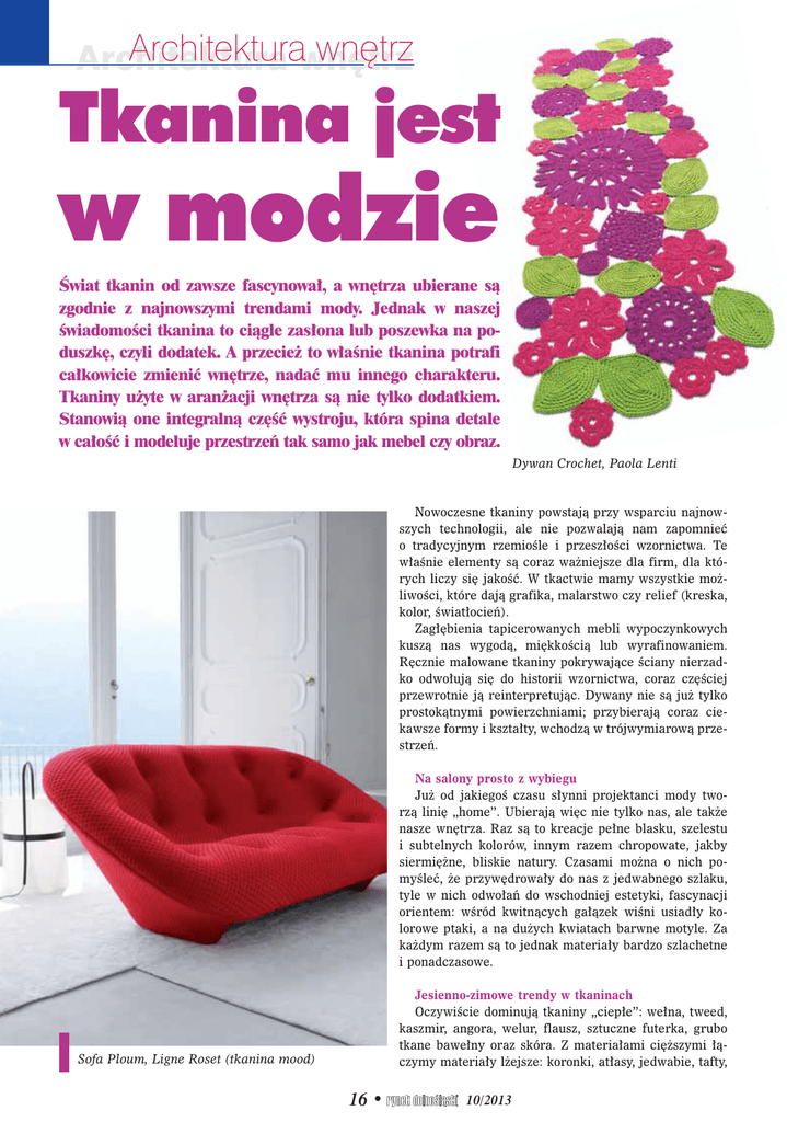 Architekturawnętrz wnętrz Architektura Tkanina jest w modzie Świat tkanin od zawsze fascynował, a wnętrza ubierane są zgodnie z najnowszymi trendami mody. Jednak w naszej świadomości tkanina to ciągle zasłona lub poszewka na poduszkę, czyli dodatek. A przecież to właśnie tkanina potrafi całkowicie zmienić wnętrze, nadać mu innego charakteru. Tkaniny użyte w aranżacji wnętrza są nie tylko dodatkiem. Stanowią one integralną część wystroju, która spina detale w całość i modeluje przestrzeń tak samo jak mebel czy obraz. Dywan Crochet, Paola Lenti Nowoczesne tkaniny powstają przy wsparciu najnowszych technologii, ale nie pozwalają nam zapomnieć o tradycyjnym rzemiośle i przeszłości wzornictwa. Te właśnie elementy są coraz ważniejsze dla firm, dla których liczy się jakość. W tkactwie mamy wszystkie możliwości, które dają grafika, malarstwo czy relief (kreska, kolor, światłocień). Zagłębienia tapicerowanych mebli wypoczynkowych kuszą nas wygodą, miękkością lub wyrafinowaniem. Ręcznie malowane tkaniny pokrywające ściany nierzadko odwołują się do historii wzornictwa, coraz częściej przewrotnie ją reinterpretując. Dywany nie są już tylko prostokątnymi powierzchniami; przybierają coraz ciekawsze formy i kształty, wchodzą w trójwymiarową przestrzeń. Na salony prosto z wybiegu Już od jakiegoś czasu słynni projektanci mody tworzą linię „home”. Ubierają więc nie tylko nas, ale także nasze wnętrza. Raz są to kreacje pełne blasku, szelestu i subtelnych kolorów, innym razem chropowate, jakby siermiężne, bliskie natury. Czasami można o nich pomyśleć, że przywędrowały do nas z jedwabnego szlaku, tyle w nich odwołań do wschodniej estetyki, fascynacji orientem: wśród kwitnących gałązek wiśni usiadły kolorowe ptaki, a na dużych kwiatach barwne motyle. Za każdym razem są to jednak materiały bardzo szlachetne i ponadczasowe. Jesienno-zimowe trendy w tkaninach Oczywiście dominują tkaniny „ciepłe”: wełna, tweed, kaszmir, angora, welur, flausz, sztuczne futerka, grubo tkane bawełny oraz skóra. Z materiałami cięższymi łączymy materiały lżejsze: koronki, atłasy, jedwabie, tafty, Sofa Ploum, Ligne Roset (tkanina mood) 16 • 10/2013 Architektura wnętrz Architektura wnętrz żorżety, tiule oraz wszelakiej maści transparentne tkaniny. Hitem tego sezonu będą prawdopodobnie materiały żakardowe, gobelinowe i aksamity. Panujące obecnie trendy rynkowe promują bogatą ornamentykę i duże, dekoracyjne, organiczne motywy. Z drugiej jednak strony coraz więcej tkanin przetwarza wzory geometryczne, wzajemnie się przenikające, tworząc kompozycje, czasem wypukłe, wykonane z innego rodzaju materiału, co daje modny efekt trójwymiarowości. Wzorem, który święci ponowny triumf, jest słynna pepitka, rozsławiona na świecie przez Coco Chanel. W tkaninach obiciowych ciągle modne są prymitywne formy, grube nierówne szycia i sploty, nieregularne, nieobrobione maszynowo krawędzie. Wykorzystuje się takie materiały, jak: wełna, filc, skóra, futro, a więc naturalne surowce o wyrazistej strukturze. Tkaniny niezwykłe, sławne i doskonałe Alcantara – można ją opisać jako sztuczną skórę, nubuk lub zamsz. Jest to materiał syntetyczny, który został opracowany w roku 1970 przez japońskiego naukowca Miyoshi Okamoto. Alcantara składa się w 68% z poliestru i w 32% z poliuretanu. Dzięki zastosowaniu poliestru tkanina jest wytrzymała, a poliuretan nadaje jej miękkość. Materiał ten z powodzeniem używany jest do wytwarzania obić meblowych i świetnie się sprawdza w tej roli. Mood – do ubrania sofy Ploum słynnego projektu braci Ronan & Erwan Bouroullec użyto specjalnej tkaniny mood. Jej niespotykana grubość oraz mięsistość i rozciągliwość spowodowały, że sofa otrzymała wiele prestiżowych nagród za komfort użytkowania. Ruché – sofa ze specjalną, kunsztownie pikowaną, falistą formą tapicerki przypominającą kołdrę to kolejny majstersztyk. Żakard – kiedy wymyślono krosno żakardowe, było ono jedną z najbardziej zaawansowanych technologicznie maszyn przemysłowych. Jego pojawienie się radykalnie zmieniło sposób produkcji tkanin. Abakany – to z kolei chyba najsłynniejsza tkanina artystyczna w Polsce; rodzaj miękkich, wiszących, dużych rzeźb z sizalu autorstwa Magdaleny Abakanowicz (stąd nazwa). Tkaniny ludowe – ta osobna grupa tkanin cieszy się coraz większym zainteresowaniem. Są one wytwarzane z reguły w sposób ręczny, na prostych warsztatach tkackich. Surowcem do ich wykonywania jest najczęściej przędza lniana lub wełniana. Jako wątek stosuje się również ścinki tkanin, futer, łodygi traw, słomę, trzcinę, pędy bambusa, a nawet cienkie listewki drewniane. Przyszłość tkanin Coraz częściej eksperymentuje się z tkaninami, z ich splotami, włóknami, fakturami. Dzięki temu powstają tkaniny trójwymiarowe, z domieszkami innych tworzyw, jak chociażby drewna. Takie tkaniny mogą stanowić nie tylko element dekoracyjny, ale są też wykorzystywane jako panele akustyczne, pochłaniające dźwięk. Tkanina – niewyczerpane źródło możliwości kreacyjnych Wyobraź sobie wnętrze bez tkanin… Oczywiście istnieją wnętrza minimalistyczne, ale także one stosują w ograniczonym zakresie tkaninę. Dlaczego? Buduje ona bowiem przestrzeń, dzieli, przesłania, odsłania, poprawia akustykę… Dlatego projektanci wnętrza zawsze sięgali Galeria Wnętrza zaprasza na kolejny Dzień Architekta, tym razem pod hasłem „Dookoła wnętrza z tkaniną”. Ta całodniowa impreza odbędzie się 10 października w siedzibie firmy przy ul. Szwedzkiej 5A we Wrocławiu. Początek o godz. 10:00. 17 • 10/2013 Niezwykła forma przestrzenna z tkanin – Cloud, Ligne Roset i będą po nią sięgać. Nie traktujmy więc tkanin po macoszemu. Nie obawiajmy się mocnych, nasyconych kolorów, wyrazistych wzorów, intensywnie wypełnio