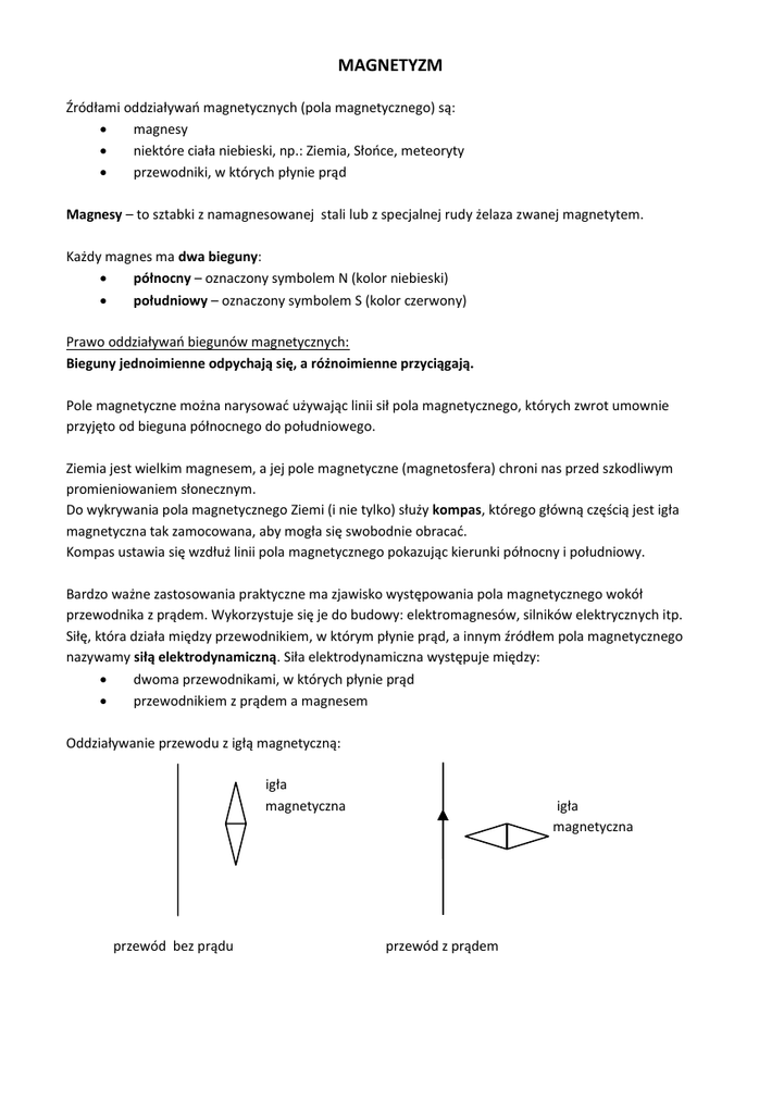 MAGNETYZM Źródłami oddziaływań magnetycznych (pola magnetycznego) są: magnesy niektóre ciała niebieski, np.: Ziemia, Słońce, meteoryty przewodniki, w których płynie prąd Magnesy – to sztabki z namagnesowanej stali lub z specjalnej rudy żelaza zwanej magnetytem. Każdy magnes ma dwa bieguny: północny – oznaczony symbolem N (kolor niebieski) południowy – oznaczony symbolem S (kolor czerwony) Prawo oddziaływań biegunów magnetycznych: Bieguny jednoimienne odpychają się, a różnoimienne przyciągają. Pole magnetyczne można narysować używając linii sił pola magnetycznego, których zwrot umownie przyjęto od bieguna północnego do południowego. Ziemia jest wielkim magnesem, a jej pole magnetyczne (magnetosfera) chroni nas przed szkodliwym promieniowaniem słonecznym. Do wykrywania pola magnetycznego Ziemi (i nie tylko) służy kompas, którego główną częścią jest igła magnetyczna tak zamocowana, aby mogła się swobodnie obracać. Kompas ustawia się wzdłuż linii pola magnetycznego pokazując kierunki północny i południowy. Bardzo ważne zastosowania praktyczne ma zjawisko występowania pola magnetycznego wokół przewodnika z prądem. Wykorzystuje się je do budowy: elektromagnesów, silników elektrycznych itp. Siłę, która działa między przewodnikiem, w którym płynie prąd, a innym źródłem pola magnetycznego nazywamy siłą elektrodynamiczną. Siła elektrodynamiczna występuje między: dwoma przewodnikami, w których płynie prąd przewodnikiem z prądem a magnesem Oddziaływanie przewodu z igłą magnetyczną: igła magnetyczna przewód bez prądu igła magnetyczna przewód z prądem Linie pola magnetycznego wokół przewodnika prostoliniowego: prąd płynie od obserwatora (od Ciebie) · prąd płynie do obserwatora (do Ciebie) Oddziaływanie dwóch równoległych, w których płynie prąd: zgodny kierunek przepływu prądu F przeciwny kierunek przepływu prądu F przyciągają się F F odpychają się Pole magnetyczne wokół przewodnika kołowego: S prąd płynie zgodnie z ruchem wskazówek zegara N prąd płynie przeciwnie do ruchu wskazówek zegara