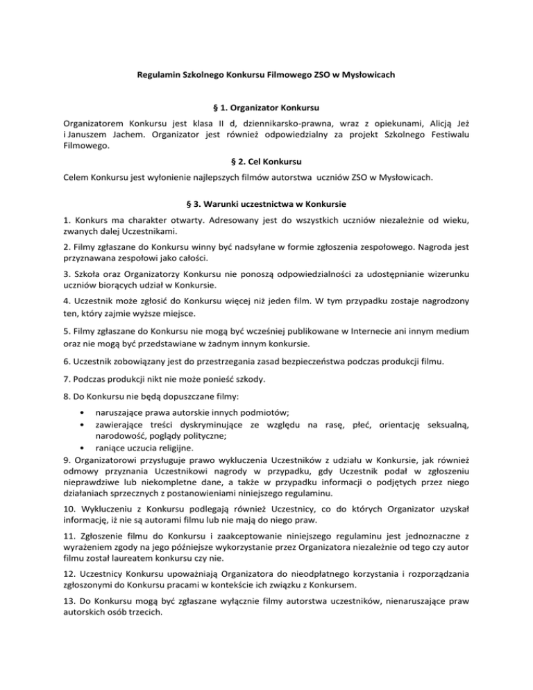 Regulamin Szkolnego Konkursu Filmowego ZSO w Mysłowicach § 1. Organizator Konkursu Organizatorem Konkursu jest klasa II d, dziennikarsko-prawna, wraz z opiekunami, Alicją Jeż i Januszem Jachem. Organizator jest również odpowiedzialny za projekt Szkolnego Festiwalu Filmowego. § 2. Cel Konkursu Celem Konkursu jest wyłonienie najlepszych filmów autorstwa uczniów ZSO w Mysłowicach. § 3. Warunki uczestnictwa w Konkursie 1. Konkurs ma charakter otwarty. Adresowany jest do wszystkich uczniów niezależnie od wieku, zwanych dalej Uczestnikami. 2. Filmy zgłaszane do Konkursu winny być nadsyłane w formie zgłoszenia zespołowego. Nagroda jest przyznawana zespołowi jako całości. 3. Szkoła oraz Organizatorzy Konkursu nie ponoszą odpowiedzialności za udostępnianie wizerunku uczniów biorących udział w Konkursie. 4. Uczestnik może zgłosić do Konkursu więcej niż jeden film. W tym przypadku zostaje nagrodzony ten, który zajmie wyższe miejsce. 5. Filmy zgłaszane do Konkursu nie mogą być wcześniej publikowane w Internecie ani innym medium oraz nie mogą być przedstawiane w żadnym innym konkursie. 6. Uczestnik zobowiązany jest do przestrzegania zasad bezpieczeństwa podczas produkcji filmu. 7. Podczas produkcji nikt nie może ponieść szkody. 8. Do Konkursu nie będą dopuszczane filmy: • • naruszające prawa autorskie innych podmiotów; zawierające treści dyskryminujące ze względu na rasę, płeć, orientację seksualną, narodowość, poglądy polityczne; • raniące uczucia religijne. 9. Organizatorowi przysługuje prawo wykluczenia Uczestników z udziału w Konkursie, jak również odmowy przyznania Uczestnikowi nagrody w przypadku, gdy Uczestnik podał w zgłoszeniu nieprawdziwe lub niekompletne dane, a także w przypadku informacji o podjętych przez niego działaniach sprzecznych z postanowieniami niniejszego regulaminu. 10. Wykluczeniu z Konkursu podlegają również Uczestnicy, co do których Organizator uzyskał informację, iż nie są autorami filmu lub nie mają do niego praw. 11. Zgłoszenie filmu do Konkursu i zaakceptowanie niniejszego regulaminu jest jednoznaczne z wyrażeniem zgody na jego późniejsze wykorzystanie przez Organizatora niezależnie od tego czy autor filmu został laureatem konkursu czy nie. 12. Uczestnicy Konkursu upoważniają Organizatora do nieodpłatnego korzystania i rozporządzania zgłoszonymi do Konkursu pracami w kontekście ich związku z Konkursem. 13. Do Konkursu mogą być zgłaszane wyłącznie filmy autorstwa uczestników, nienaruszające praw autorskich osób trzecich. 14. Filmy niespełniające wymagań określonych w niniejszym regulaminie zostaną wyłączone z udziału w Konkursie. 15. Jury ma prawo nie przyznawać nagród w przypadku, gdy poziom prac nie będzie spełniał wymogów regulaminu oraz kryteriów ustalonych przez Organizatora Konkursu. Jury ma również prawo podjąć decyzję o dowolnym podziale nagród. 16. Decyzje jury są ostateczne i niepodważalne. 17. Wszystkie przesłane filmy pozostają w archiwum Organizatora. 18. Wyniki konkursu zostaną ogłoszone podczas Gali Szkolnego Festiwalu Filmowego, która odbędzie się na początku czerwca 2017 roku. Wtedy też wręczone zostaną nagrody. § 4. Wymagania techniczne dotyczące przesyłanych filmów Film może być wykonany w dowolnej technice, jednak musi mieć formę pliku cyfrowego w formacie Quicktime, AVI lub MPEG, w rozdzielczości co najmniej HD. Preferowana rozdzielczość nadsyłanych filmów to Full HD: 1920x1080. § 5. Sposób i termin nadsyłania filmów 1. Filmy należy przesyłać przez e-mail ([email protected]), przynieść na pendrive lub płycie CD do profesor Alicji Jeż. 2. Zgłoszenia udziału w Konkursie będą przyjmowane od dnia 30 stycznia 2017 do dnia 17 lutego 2017 roku, a filmy mogą być przesyłane w nieprzekraczalnym terminie 20 kwietnia 2017 roku. 3. Wszelkie pytania lub wątpliwości dotyczące uczestnictwa w Konkursie prosimy kierować na adres: [email protected] 4. W czerwcu 2017 roku odbędzie się Szkolny Festiwal Filmowy, podczas którego wyemitowane zostaną wszystkie filmy zgłoszone do Konkursu. W czerwcu odbędzie się również uroczysta Gala, podczas której zostaną wręczone nagrody. § 6. Unieważnienie Konkursu Organizator zastrzega sobie prawo do unieważnienia Konkursu w przypadku: • • • gdy nie wpłynie żadna praca konkursowa, gdy wszystkie prace konkursowe nie spełnią warunków regulaminu, gdy poziom artystyczny prac konkursowych będzie niezadowalający. § 7. Ustalenia końcowe 1. Przystąpienie do Konkursu jest równoznaczne z akceptacją niniejszego regulaminu. 2. Organizator Konkursu nie ponosi odpowiedzialności za jego odwołanie bądź zmiany w harmonogramie wynikłe z przyczyn niezależnych od niego. 3. Organizator zastrzega sobie prawo do interpretacji regulaminu i jego zmiany pod warunkiem, że taka zmiana nie naruszy praw nabytych uczestników Konkursu.
