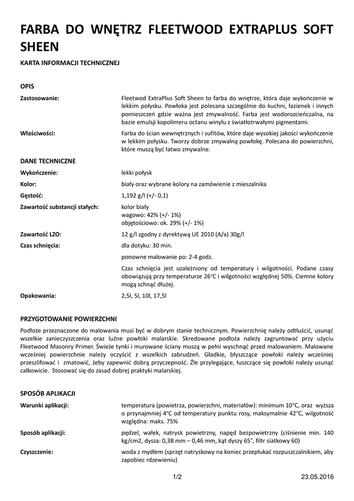 FARBA DO WNĘTRZ FLEETWOOD EXTRAPLUS SOFT SHEEN KARTA INFORMACJI TECHNICZNEJ OPIS Zastosowanie: Fleetwod ExtraPlus Soft Sheen to farba do wnętrze, która daje wykończenie w lekkim połysku. Powłoka jest polecana szczególnie do kuchni, łazienek i innych pomieszczeń gdzie ważna jest zmywalność. Farba jest wodorozcieńczalna, na bazie emulsji kopolimeru octanu winylu z światłotrwałymi pigmentami. Właściwości: Farba do ścian wewnętrznych i sufitów, które daje wysokiej jakości wykończenie w lekkim połysku. Tworzy dobrze zmywalną powłokę. Polecana do powierzchni, które muszą być łatwo zmywalne. DANE TECHNICZNE Wykończenie: lekki połysk Kolor: biały oraz wybrane kolory na zamówienie z mieszalnika Gęstość: 1,192 g/l (+/- 0,1) Zawartość substancji stałych: kolor biały wagowo: 42% (+/- 1%) objętościowo: ok. 29% (+/- 1%) Zawartość LZO: 12 g/l zgodny z dyrektywą UE 2010 (A/a) 30g/l Czas schnięcia: dla dotyku: 30 min. ponowne malowanie po: 2-4 godz. Czas schnięcia jest uzależniony od temperatury i wilgotności. Podane czasy obowiązują przy temperaturze 26 oC i wilgotności względnej 50%. Ciemne kolory mogą schnąć dłużej. Opakowania: 2,5l, 5l, 10l, 17,5l PRZYGOTOWANIE POWIERZCHNI Podłoże przeznaczone do malowania musi być w dobrym stanie technicznym. Powierzchnię należy odtłuścić, usunąć wszelkie zanieczyszczenia oraz luźne powłoki malarskie. Skredowane podłoża należy zagruntować przy użyciu Fleetwood Masonry Primer. Świeże tynki i murowane ściany muszą w pełni wyschnąć przed malowaniem. Malowane wcześniej powierzchnie należy oczyścić z wszelkich zabrudzeń. Gładkie, błyszczące powłoki należy wcześniej przeszlifować i zmatowić, żeby zapewnić dobrą przyczepność. Źle przylegające, łuszczące się powłoki należy usunąć całkowicie. Stosować się do zasad dobrej praktyki malarskiej. SPOSÓB APLIKACJI Warunki aplikacji: temperatura (powietrza, powierzchni, materiałów): minimum 10 oC, oraz wyższa o przynajmniej 4oC od temperatury punktu rosy, maksymalnie 42 oC, wilgotność względna: maks. 75% Sposób aplikacji: pędzel, wałek, natrysk powietrzny, napęd bezpowietrzny (ciśnienie min. 140 kg/cm2, dysza: 0,38 mm – 0,46 mm, kąt dyszy 65 o, filtr siatkowy 60) Czyszczenie: woda z mydłem (sprzęt natryskowy na koniec przepłukać rozpuszczalnikiem, aby zapobiec rdzewieniu) 1/2 23.05.2016 Wydajność: nawet do 16 m2/l na warstwę w przypadku podłoża nieporowatego ze względu na sposób aplikacji możliwa redukcja nawet do 20% UWAGI Trzymać poza zasięgiem dzieci. Należy zapewnić dobrą wentylację podczas aplikacji i schnięcia farby. W przypadku dostania się produktu do oczy, przemyć dużą ilością wody. Zabrudzenia ze skóry zmywać przy użyciu wody z mydłem. Nie zawiera dodatku ołowiu. Informacje tu zawarte przekazywane są w dobrej wierze, w celach informacyjnych. Ponieważ warunki aplikacji są poza kontrolą producenta, firma FLEETWOOD nie może ponosić jakiejkolwiek odpowiedzialności lub obciążeń finansowych, które mogą wynikać z niewłaściwego zastosowania tych produktów. Firma zastrzega sobie prawo modyfikowania danych bez uprzedzenia. Niniejsza karta techniczna zastępuje wszystkie poprzednie wersje. FLEETWOOD FSW COATINGS LTD, VIRGINIA, CO CAVAN, IRLANDIA. Dystrybutor: Noxan Sp. z o.o. ul. Pułtuska 13 61-052 Poznań Tel. +48 61 870 87 03 Fax +48 61 624 32 98 www.noxan.pl 2/2 23.05.2016