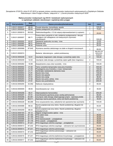 Zarządzenie 37/2015 z dnia 01-07-2015 w sprawie zmiany cennika procedur medycznych wykonywanych w Szpitalnym Oddziale Ratunkowym i Izbie Przyjęć w Resku, załącznik nr 1 „Cennik procedur medycznych SOR” Wykaz procedur medycznych wg ICD-9 / świadczeń wykonywanych w szpitalnym oddziale ratunkowym i szpitalnej izbie przyjęć Lp. Kod produktu 1. 2. 5.09.01.0000071 5.09.01.0000049 3. 5.09.01.0000010 Kod Nazwa procedury/świadczenia procedury 89.00 Porada lekarska, konsultacja, asysta 89.04 Opieka pielęgniarki lub położnej 89.522 Elektrokardiografia z 12 lub więcej odprowadzeniami (z opisem) 4. 5.09.01.0000057 89.71 5. 6. 7. 5.09.01.0000002 5.09.01.0000062 5.09.01.0000063 93.57 96.51 96.52 Ocena stanu pacjenta w celu ustalenia postępowania i decyzji o podjęciu lub odstąpieniu od medycznych czynności ratunkowych Założenie opatrunku na ranę - inne Płukanie oka Płukanie ucha 8. 5.09.01.0000068 97.642 Wymiana cewnika założonego na stałe w drogach moczowych 9. 5.09.01.0000074 kat. cena 1 1 130,00 70,00 1 25,00 1 1 1 1 100,00 10,00 80,00 80,00 1 Badania laboratoryjne - pakiet podstawowy 60,00 wg ceny za wykonane badania 10. 5.09.02.0000248 12.01 Usunięcie magnesem ciała obcego z przedniej części oka 1 2 11. 5.09.02.0000249 12.02 Usunięcie ciała obcego z przedniej części gałki (bez magnesu) 2 100,00 12. 5.09.02.0000282 16.89 Zaopatrzenie urazu oka/ oczodołu - inne 2 100,00 13. 14. 15. 16. 17. 18. 19. 20. 5.09.02.0000002 5.09.02.0000250 5.09.02.0000251 5.09.02.0000003 5.09.02.0000252 5.09.02.0000004 5.09.02.0000253 5.09.02.0000254 21.02 21.03 21.71 21.81 25.51 27.51 27.52 27.61 Tylna i przednia tamponada nosa przy krwotoku Przyżeganie przy krwotoku z nosa i tamponada Zamknięte nastawienie złamania nosa Szycie rany nosa Szycie rany języka Szycie rany wargi Szycie rany jamy ustnej - inne Szycie rany podniebienia 2 2 2 2 2 2 2 2 400,00 100,00 250,00 130,00 200,00 90,00 200,00 200,00 21. 5.09.02.0000255 34.092 Nakłucie międzyżebrza 2 60,00 22. 5.09.02.0000005 38.93 Cewnikowanie żył - inne 2 30,00 23. 24. 25. 26. 5.09.02.0000256 5.09.02.0000257 5.09.02.0000258 5.09.02.0000287 49.41 57.01 64.461 86.011 Odprowadzenie hemoroidów Cewnikowanie pęcherza przez cewkę jednorazowe Usunięcie ciała obcego obejmującego prącie - operacja prosta Aspiracja ropnia paznokcia, skóry lub tkanki podskórnej 2 2 2 2 250,00 60,00 300,00 30,00 27. 5.09.02.0000228 86.289 Inne oczyszczenie rany, zakażenia lub oparzenia bez wycinania 2 100,00 28. 5.09.02.0000088 86.52 2 50,00 29. 5.09.02.0000259 86.53 2 70,00 30. 31. 32. 33. 34. 35. 5.09.02.0000183 5.09.02.0000094 5.09.02.0000095 5.09.02.0000096 5.09.02.0000097 5.09.02.0000012 87.12 87.164 87.165 87.174 87.176 87.221 Szycie pojedynczej rany skóry i tkanki podskórnej, długości do 4,0 cm Szycie pojedynczej rany skóry i tkanki podskórnej, długości powyżej 4,0 cm Zdjęcie rentgenowskie zębów - inne RTG zatok nosa RTG nosa RTG twarzoczaszki – przeglądowe RTG czaszki – przeglądowe RTG kręgosłupa odcinka szyjnego – przeglądowe 2 2 2 2 2 2 30,00 30,00 30,00 30,00 55,00 36. 5.09.02.0000013 87.222 RTG kręgosłupa odcinka szyjnego – celowane lub czynnościowe 2 55,00 37. 5.09.02.0000014 87.231 2 55,00 38. 5.09.02.0000015 87.232 RTG kręgosłupa odcinka piersiowego RTG kręgosłupa odcinka piersiowego – celowane lub czynnościowe 2 55,00 39. 5.09.02.0000016 87.241 RTG kręgosłupa odcinka lędźwiowo-krzyżowego – przeglądowe 2 55,00 40. 5.09.02.0000017 87.242 RTG kręgosłupa odcinka lędźwiowo-krzyżowego – celowane lub czynnościowe 2 55,00 1z7 100,00 41. 42. 43. 44. 45. 46. 47. 48. 49. 50. 51. 52. 53. 54. 55. 56. 57. 58. 59. 60. 61. 62. 63. 64. 65. 66. 67. 68. 69. 70. 71. 72. 73. 74. 75. 76. 77. 78. 5.09.02.0000186 5.09.02.0000098 5.09.02.0000099 5.09.02.0000100 5.09.02.0000101 5.09.02.0000020 5.09.02.0000022 5.09.02.0000025 5.09.02.0000191 5.09.02.0000192 5.09.02.0000193 5.09.02.0000194 5.09.02.0000195 5.09.02.0000196 5.09.02.0000197 5.09.02.0000198 5.09.02.0000029 5.09.02.0000199 5.09.02.0000200 5.09.02.0000038 5.09.02.0000039 5.09.02.0000040 5.09.02.0000041 5.09.02.0000203 5.09.02.0000045 5.09.02.0000046 5.09.02.0000047 5.09.02.0000049 5.09.02.0000057 5.09.02.0000058 5.09.02.0000059 5.09.02.0000060 5.09.02.0000061 5.09.02.0000062 5.09.02.0000063 5.09.02.0000064 5.09.02.0000065 5.09.02.0000066 87.29 87.431 87.432 87.433 87.440 87.496 88.110 88.191 88.21 88.22 88.23 88.249 88.26 88.27 88.28 88.299 88.331 88.339 88.39 88.732 88.733 88.735 88.738 88.739 88.752 88.759 88.761 88.769 88.781 88.783 88.789 88.792 88.793 88.794 88.795 88.796 88.797 88.798 Zdjęcie rtg kręgosłupa - inne RTG żeber RTG mostka RTG obojczyków RTG klatki piersiowej RTG tchawicy RTG miednicy – przeglądowe RTG jamy brzusznej przeglądowe Zdjęcie RTG kości barku i ramienia Zdjęcie RTG kości łokcia/przedramienia Zdjęcie RTG nadgarstka/dłoni RTG kości kończyny górnej - nieokreślone inaczej Zdjęcie RTG kości miednicy/biodra - inne Zdjęcie RTG uda/kolana/podudzia Zdjęcie RTG kostki/stopy RTG kości kończyny dolnej - nieokreślone inaczej RTG łopatek RTG układu kostnego - nieokreślone inaczej Zdjęcie RTG - inne USG piersi USG płuc USG śródpiersia USG klatki piersiowej USG klatki piersiowej - inne USG nerek, moczowodów, pęcherza moczowego USG układu moczowego – inne USG brzucha i przestrzeni zaotrzewnowej USG brzucha – inne USG płodu Lokalizacja łożyska w USG Diagnostyka USG macicy ciężarnej - pełna USG macicy nieciężarnej i przydatków USG kończyn górnych lub dolnych USG stawów barkowych USG stawów łokciowych USG stawów rąk lub stawów stóp USG stawów biodrowych USG stawów kolanowych 2 2 2 2 2 2 2 2 2 2 2 2 2 2 2 2 2 2 2 2 2 2 2 2 2 2 2 2 2 2 2 2 2 2 2 2 2 2 30,00 30,00 30,00 30,00 30,00 30,00 30,00 55,00 55,00 55,00 55,00 30,00 55,00 55,00 55,00 55,00 30,00 60,00 60,00 100,00 100,00 100,00 100,00 100,00 100,00 100,00 60,00 60,00 60,00 60,00 60,00 60,00 60,00 60,00 60,00 60,00 79. 5.09.0