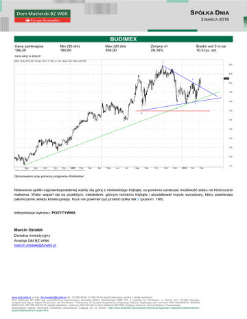 SPÓŁKA DNIA 3 MARCA 2016 BUDIMEX Cena zamknięcia 196,20 Min (30 dni) 180,00 Max (30 dni) 206,00 Zmiana r/r 29,16% Średni wol 3 m-ce 10,5 tys. szt. Ceny akcji w złotych Opracowano przy pomocy programu Amibroker Notowania spółki najprawdopodobniej wybiły się górą z niebieskiego trójkąta, co powinno oznaczać możliwość ataku na historyczne maksima. Walor wsparł się na przebitym, niebieskim, górnym ramieniu trójkąta i ukształtował impuls wzrostowy, który potwierdza zakończenie układu korekcyjnego. Kurs nie powinien już przebić dołka fali e (poziom 180). Interpretacja wykresu: POZYTYWNA Marcin Działek Doradca inwestycyjny Analityk DM BZ WBK [email protected] www.dmbzwbk.pl, e-mail: [email protected], tel.: 61 856 48 80, 61 856 44 45 (koszt połączenia zgodny z taryfą operatora) Dom Maklerski BZ WBK jest wyodrębnioną organizacyjnie jednostką Banku Zachodniego WBK S.A. z siedzibą we Wrocławiu, ul. Rynek 9/11, 50-950 Wrocław, zarejestrowanego w Sądzie Rejonowym dla Wrocławia - Fabrycznej, VI Wydział Gospodarczy Krajowego Rejestru Sądowego pod numerem KRS 0000008723, REGON 930041341, NIP 896 000 56 73, kapitał zakładowy i wpłacony 992.345.340 zł. Dom Maklerski BZ WBK podlega nadzorowi Komisji Nadzoru Finansowego. Zastrzeżenia prawne dotyczące charakteru opracowania znajdują się na stronie: http://www.dmbzwbk.pl/przydatne-informacje/regulacje-i-regulaminy/zastrzezenia-iryzyko/zastrzezenia-i-ryzyko.html.