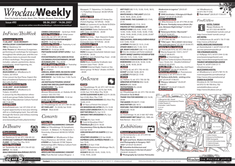 WrocławWeekly Free City Guide to Events, Music, Film, Theatre, Museum, Pubs & More Issue #95 08.06.2007 - 14.06.2007 > we are now online: www.WroclawWeekly.pl > [email protected] InFocus:ThisWeek Teenagers on Stage 11.06.2007 - 18:00 (Monday) Współczesny (Contemporary) Theatre (ul. Rzeźnicza 12) Arka Theatre (ul. Mennicza 3) organizes performing art workshops for teenagers throughout the whole year, and this evening allows teens to present the result of these workshops. The programme includes: cabaret, pantomime, dance, monodrame, street hapening, etc. Que Passa 08.06.2007 - 20:00 (Friday) MLECZARNIA (ul. Włodkowica 5) Tickets: 20/15PLN A live concert by Que Passa. Expect the best of traditional flamenco tunes and the Latin rhythm. Vlatko Stefanovski Trio 10.06.2007 - 20:00 (Sunday) MLECZARNIA (ul. Włodkowica 5) Tickets: 25/20PLN A concert by the Macedonian ethnorock & jazz group Vlatko Stefanovski Trio. Part of Macedonian Culture Festival (08-11.06.07). Quad Biking ActivePoland.com / tel. 071/354-47-42 A great opportunity to test your driving skill on a challenging track. You will ride through the forests and military training fields. Read more at: wroclawweekly.pl/index.php/activities/ InTheatre Współczesny (Contemporary) Theatre (ul. Rzeźnicza 12, tel. 071/ 358-89-22) Uciekający samolot (The Runaway Plane) - Fri-Sun, Tue-Thu 19:15 Polski Theatre (1) (ul. Świdnicka 28, tel. 071/ 316-07-52) Smycz - Fri 18:00 Małe zbrodnie małżeńskie (Petits crimes conjugaux) - Sat & Sun 19:00 Polski Theatre (2) (pl. Orląt Lwowskich 20c, tel. 071/ 341-29-54) Wszystkim zygmuntom między oczy!!! - Fri & Sat 18:30 Komedia Theatre (pl. Teatralny 4, tel. 071/ 316-07-78 thru -80) Mayday 2 - Fri & Sat 20:00 Przyjazne Dusze (Spirit Level) - Sun 17:00 Psychoterapia czyli seks w zyciu czlowieka (Psychotherapy, or sex in human life) - Thu 20:00 Lalek (Puppet) Theatre (pl. Teatralny 4, tel. 071/ 344-76-77, 344-12-16) > For children: Amelka, Bóbr i Król na dachu (Ameley, der Biber und der König auf dem Dach) - Sat 15:00; Sun 11:00; Tue & Wed 10:00 Jak Matołusz poszedł szukać olbrzyma (Wie Dilldapp nach dem Riesen ging) - Thu 10:00 Ad Spectatores (Browar Mieszczanski, ul. Hubska 44-48, contact: 502-210-735) Mord w domu Ipatiewa - Fri & Sat 21:00; Sun 20:00 CAPITOL Musical Theatre (ul. Piłsudskiego 67, tel. 071/789-04-00) My Fair Lady - Fri 20:00; Sat 19:00 Stolik - Wed 20:00 Concerts Friday 8th WROCŁAW PHILHARMONIC CONCERT HALL (ul. Piłsudskiego 19) Symphonic Concert - A. Webern / K. Penderecki / I. Stravinsky (Classical: 60/40/25/15PLN) - 19:00 MLECZARNIA (ul. Włodkowica 5) Que Passa (Flamenco: 20/15PLN) - 20:00 ŁYKEND (ul. Podwale 37/38) Tatjana Biełanochaja (BY) (“Belarus Culture Festival”: 10PLN) - 21:00 Saturday 9th WROCŁAW PHILHARMONIC CONCERT HALL Flute Recital: Łukasz Długosz - J. Mouquet / T. Takemitsu / H. Dutilleux / S. Prokofiew (Classical: 30/20/15PLN) - 18:00 Sunday 10th ALIBI (ul. Grunwaldzka 67) Hemp Gru (Polish/HipHop: 19/14PLN) - 19:00 RURA (ul. Łazienna 4) Jan Budař & Eliščin Band (CZ) (Jazz: 9PLN) - 20:00 MLECZARNIA Vlatko Stefanovski Trio (MK) (Jazz: 25/20PLN) - 20:00 Tuesday 12th RURA Not Only… feat: Sławomir Dudar Quartet, Marcin Wołowiec & Paweł Ostrowski (Jazz: 9/7/5PLN) - 20:30 Wednesday 13th BEZSENNOŚĆ (ul. Ruska 51) The Positive (Funk/Jazz: Free) - 20:00 RURA Grzegorz Grocholski Sekstet (Jazz: 9/7/5PLN) - 20:30 ALIBI Reni Jusis (Polish/Pop: Free) - 21:00 Thursday 14th RURA Music Academy Graduate Jazz Session (Jazz: Free) - 20:30 ŁYKEND Oriental Night: Ynarin w/ the dance group “Al Mara” (Arabic: 8/5PLN) - 20:00 OnScreen ATOM (ul. Piłsudskiego 74, tel. 071/ 347-14-65) Štěstí (CZ) Fri 16:45, 22:15; Sat 14:45, 22:00; Sun 19:15; Mon-Thu 19:30 Ostre sledované vlaky (CZ) Fri 20:30; Sun 21:00; Mon-Thu 17:45 Azuloscurocasinegro (ES) Mon-Thu 16:00, 21:15 > “50 Years of Polish Film School”: Do widzenia do jutra (PL) Fri 13:30 Baza ludzi umarłych (PL) Fri 15:00 Nikt nie woła (PL) Sat 13:15 Świadectwo urodzenia (PL) Sun 12:15 Pociąg (PL) Sun 14:00 > “Czech & Slovakian Films”: Pravidla lži (CZ) Fri 18:30 Documentary Films by Martin Slivka (CZ) Sat 16:30 Udelení milosti se zamítá (CZ) Sat 18:00 Účastníci zájezdu (CZ) Sat 20:00 Kupředu levá, kupředu pravá (CZ) Sun 15:45 Mistři (CZ) Sun 17:00 HELIOS (Kazimierza Wielkiego 19a-21, tel.071/ 786-65-66) Ocean’s 13 (US) 10:45, 13:00, 15:15, 17:30, 19:45, 22:00 Hot Fuzz (GB) 11:15, 13:30, 15:45, 18:15, 20:45, 23:00 White Noise 2: The Light (US/CA) 16:45, 18:45, 20:45, 22:45 Code Name: The Cleaner (US) 17:45, 21:15 Pathfinder (US) 17:15, 19:15 Pirates of the Caribbean: At World’s End (US) 9:00, 10:00, 11:00, 12:00, 13:00, 14:00, 15:00, 16:00, 17:00, 18:00, 19:00, 20:00, 21:00, 22:00, 23:00* (*Only Fri & Sat) Obsluhoval jsem anglického krále (CZ) 13:00, 19:30 La Môme (FR/GB/CZ) 15:15, 21:45 Spider-Man 3 (US) 11:30, 14:15 Mr. Bean’s Holiday (GB) 11:15, 22:30 > Films for children (all Polish dubbed): Happy wkręt (Happily N’Ever After) (DE/US) 11:15, 13:00, 14:45 Rodzinka Robinsonów (Meet the Robinsons) (US) 8:30, 10:30, 12:30, 14:30, 16:30, 18:30, 20:30 LALKA (ul. Prusa 32, tel. 071/ 792-44-05) Scoop (US/GB) 16:00, 20:15 La Môme (FR/GB/CZ) 17:45 LWOW (ul. Hallera 15, tel. 071/ 793-50-78) Эйфория (Eyforiya) (RU) 16:45 Breach (US) 18:00 Testosteron (PL) 20:00 WARSZAWA (ul. Piłsudskiego 64, tel. 071/ 792-43-83) [Closed on Tue & Wed] Thank You for Smoking (US) 16:30, 20:00 The Queen (FR/GB/IT) 17:00 Miss Potter (GB) 18:15 Perfume: The Story of a Murderer (FR/ES/DE) 19:30 Modernism in Legnica” (29.03.0710.06.07) > “JEMS Architekci. 9 Designs & 9 Realizations” (31.05.07-02.09.07) (ul. Włodkowica 5, tel.071/78-77-576) > “Piotr Anioł” (28.05.07-17.06.07) BWA Awangarda FindUsHere (ul. Wita Stwosza 32, tel. 071/790-25-82) > “Aurora. Pomiędzy nocą a dniem (Aurora. Between Night & Day)” (14.04.0710.06.07) > “Katarzyna Kmita / Wycinanki” (11.05.07-10.06.07)