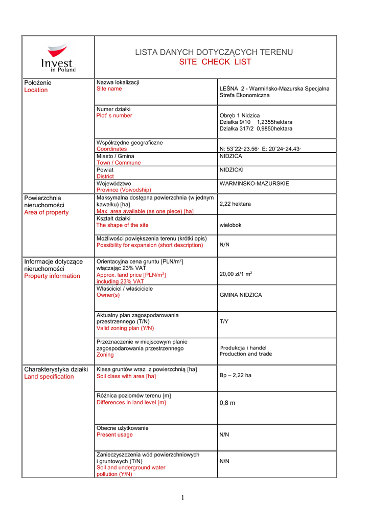 LISTA DANYCH DOTYCZĄCYCH TERENU SITE CHECK LIST Położenie Location Nazwa lokalizacji Site name LEŚNA 2 - Warmińsko-Mazurska Specjalna Strefa Ekonomiczna Numer działki Plot’ s number Powierzchnia nieruchomości Area of property Obręb 1 Nidzica Działka 9/10 1,2355hektara Działka 317/2 0,9850hektara Współrzędne geograficzne Coordinates Miasto / Gmina Town / Commune Powiat District Województwo Province (Voivodship) Maksymalna dostępna powierzchnia (w jednym kawałku) ha Max. area available (as one piece) ha Kształt działki The shape of the site Możliwości powiększenia terenu (krótki opis) Possibility for expansion (short description) Informacje dotyczące nieruchomości Property information Charakterystyka działki Land specification Orientacyjna cena gruntu PLN/m2 włączając 23% VAT Approx. land price PLN/m2 including 23% VAT Właściciel / właściciele Owner(s) N: 53˚22״23.56 ׳E: 20˚24״24.43׳ NIDZICA NIDZICKI WARMIŃSKO-MAZURSKIE 2,22 hektara wielobok N/N 20,00 zł/1 m2 GMINA NIDZICA Aktualny plan zagospodarowania przestrzennego (T/N) Valid zoning plan (Y/N) T/Y Przeznaczenie w miejscowym planie zagospodarowania przestrzennego Zoning Produkcja i handel Production and trade Klasa gruntów wraz z powierzchnią ha Soil class with area ha Bp – 2,22 ha Różnica poziomów terenu m Differences in land level m 0,8 m Obecne użytkowanie Present usage N/N Zanieczyszczenia wód powierzchniowych i gruntowych (T/N) Soil and underground water pollution (Y/N) 1 N/N Poziom wód gruntowych m Underground water level m 0,5 m – 5 m Czy były prowadzone badania geologiczne terenu (T/N) Were geological research done (Y/N) N/N Ryzyko wystąpienia zalań lub obsunięć terenu (T/N) Risk of flooding or land slide (Y/N) N/N Przeszkody podziemne (T/N) Underground obstacles (Y/N) NIE Przeszkody występujące na powierzchni terenu N/N (T/N) Ground and overhead obstacles (Y/N) Połączenia transportowe Transport links Istniejące ograniczenia ekologiczne (T/N) Ecological restrictions (Y/N) N/N Budynki i zabudowania na terenie (T/N) Buildings / other constructions on site (Y/N) N/N Droga dojazdowa do terenu (rodzaj drogi i jej szerokość) Access road to the plot (type and width of access road) Autostrada / droga krajowa km Nearest motorway / national road km Ul.Olsztynska i Lesna Acces road - Olsztynska avenue and lesna avenue Droga krajowa S-7 The national Road S-7 Porty rzeczne i morskie w odległości do 200 km Sea and river ports located up to 200 km Port morski w Gdańsku - 190km Seaport in Gdansk - 190km km Kolej km Railway line km NIDZICA - 1,0 km Bocznica kolejowa km Railway siding km NIDZICA - 1,0 km Najbliższe lotnisko międzynarodowe km Nearest international airport km Istniejąca infrastruktura Existing infrastructure Port lotniczy Olsztyn-Mazury – 60km Port lotniczy Warszawa-Modlin – 120km Airport Olsztyn Mazury- 60km Aiport Modlin – 120km Najbliższe miasto wojewódzkie km Nearest province capital km OLSZTYN – 60 km Elektryczność na terenie (T/N) Electricity (Y/N) T/Y Odległość przyłącza od granicy terenu Connection point (distance from boundary) m Napięcie Voltage kV 2 10 m Bez ograniczeń Non limits Dostępna moc Available capacity MW Bez ograniczeń Non limits Gaz na terenie (T/N) Gas (Y/N) T/Y Odległość przyłącza od granicy działki Connection point (distance from boundary) m Wartość kaloryczna Calorific value MJ/Nm3 225 mm Dostępna objętość Available capacity Nm3/h X T/Y Odległość przyłącza od granicy terenu Connection point (distance from boundary) m Dostępna objętość Available capacity m3/24h Kanalizacja na terenie (T/N) Sewage discharge (Y/N) Uwagi Comments 10 m x T/Y Odległość przyłącza od granicy terenu Connection point (distance from boundary) m Dostępna objętość Available capacity m3/24h Oczyszczalnia ścieków na terenie bądź w bezpośrednim sąsiedztwie Treatment plant (Y/N) Telefony (T/N) Telephone (Y/N) X Średnica rury Pipe diameter mm Woda na terenie (T/N) Water supply (Y/N) 10 m Odległość przyłącza od granicy terenu Connection point (distance from boundary) m 10 m 500 m3/24h N/N T/Y 10 m X Osoba przygotowująca ofertę Offer prepared by Imię, nazwisko, stanowisko, tel., tel. komórkowy, e-mail, znajomość języków obcych Osoby do kontaktu Contact person Imię, nazwisko, stanowisko, tel., tel. komórkowy, e-mail, znajomość języków obcych Andrzej Kamiński - Inspektor ds. obsługi inwestorów (89) 625-07-63, [email protected] Andrzej Kamiński - Inspektor ds. obsługi inwestorów ( (89) 625-07-63, [email protected] Aerial photographs (if available). 3