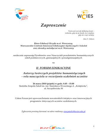 Zaproszenie Twórczość jest jak delikatny kwiat – rozkwita, gdy się ją chwali, lecz więdnie, gdy nie czuje zachęty. Alex F. Osborn Biuro Edukacji Urzędu m.st. Warszawy, Warszawskie Centrum Innowacji Edukacyjno–Społecznych i Szkoleń oraz doradcy metodyczni m.st. Warszawy serdecznie zapraszają Dyrektorów oraz Nauczycieli przedmiotów humanistycznych szkół podstawowych, gimnazjalnych i ponadgimnazjalnych na II FORUM EDUKACYJNE Autorzy twórczych projektów humanistycznych - rola nauczyciela w rozwijaniu uzdolnień uczniów 26 marca 2010 (piątek) w godz. 8.45 – 15.00 Siedziba Zespołu Szkół im. inŜ. Stanisława Wysockiego d. „Kolejówka”, ul. Szczęśliwicka 56 Celem Forum jest upowszechnianie nowatorskich inicjatyw oraz innowacyjnych programów dotyczących uczniów uzdolnionych. Zgłoszenia prosimy kierować na adres mailowy: [email protected] 1 PROGRAM FORUM Zespół Szkół im.inŜ. Stanisława Wysockiego d. „Kolejówka”, ul. Szczęśliwicka 56, 26 marca 2010 roku 8.45 - 9.15 Rejestracja uczestników 9.15 - 9.45 Otwarcie forum Włodzimierz Paszyński - Zastępca Prezydenta m.st. Warszawy Jolanta Lipszyc - Dyrektor Biura Edukacji Urzędu m.st. Warszawy 9.45 - 10.30 Wykład inauguracyjny „Nauczyciel i uczeń uzdolniony –przykłady dobrej praktyki” dr Krystyna Starczewska - Dyrektor Społecznego Gimnazjum nr 20 „Raszyńska” 10.30 - 11.00 Wykład „Kompetencje nauczyciela” dr Rafał Bodarski - pedagog, Chrześcijańska Akademia Teologiczna 11.10 – 12.30 Panel dyskusyjny „Rola nauczyciela w rozwijaniu zainteresowań uczniów” Moderator: Arkadiusz Walczak - Dyrektor Warszawskiego Centrum Innowacji EdukacyjnoSpołecznych i Szkoleń Uczestnicy panelu – dyrektorzy i nauczyciele praktycy warszawskich szkół podstawowych, gimnazjalnych i ponadgimnazjalnych (publicznych i niepublicznych) 12.30 - 13.30 Uroczyste otwarcie ekspozycji szkół wspierających uczniów uzdolnionych (zwiedzanie) 13.30 - 15.00 Zajęcia warsztatowe GRUPA A „Mistrz i uczeń - wspólne działanie plastyczne" dr Magdalena Janota Bzowska - historyk sztuki, pedagog, Akademia Pedagogiki Specjalnej GRUPA B „Praca z uczniem uzdolnionym” dr Rafał Bodarski - pedagog, Chrześcijańska Akademia Teologiczna 2
