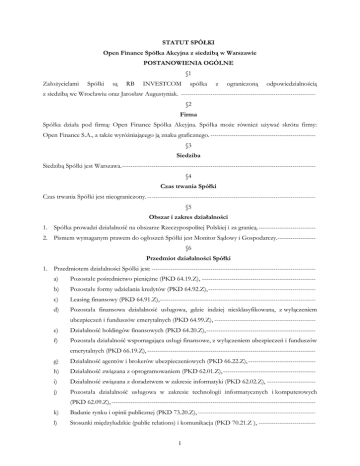 STATUT SPÓŁKI Open Finance Spółka Akcyjna z siedzibą w Warszawie POSTANOWIENIA OGÓLNE §1 Założycielami Spółki są RB INVESTCOM spółka z ograniczoną odpowiedzialnością z siedzibą we Wrocławiu oraz Jarosław Augustyniak. ---------------------------------------------------------------§2 Firma Spółka działa pod firmą: Open Finance Spółka Akcyjna. Spółka może również używać skrótu firmy: Open Finance S.A., a także wyróżniającego ją znaku graficznego. -------------------------------------------------§3 Siedziba Siedzibą Spółki jest Warszawa. -------------------------------------------------------------------------------------------§4 Czas trwania Spółki Czas trwania Spółki jest nieograniczony. -------------------------------------------------------------------------------§5 Obszar i zakres działalności 1. Spółka prowadzi działalność na obszarze Rzeczypospolitej Polskiej i za granicą. --------------------------2. Pismem wymaganym prawem do ogłoszeń Spółki jest Monitor Sądowy i Gospodarczy.-----------------§6 Przedmiot działalności Spółki 1. Przedmiotem działalności Spółki jest: -----------------------------------------------------------------------------a) Pozostałe pośrednictwo pieniężne (PKD 64.19.Z), ------------------------------------------------------ b) Pozostałe formy udzielania kredytów (PKD 64.92.Z), --------------------------------------------------- c) Leasing finansowy (PKD 64.91.Z),-------------------------------------------------------------------------- d) Pozostała finansowa działalność usługowa, gdzie indziej niesklasyfikowana, z wyłączeniem ubezpieczeń i funduszów emerytalnych (PKD 64.99.Z), ------------------------------------------------ e) Działalność holdingów finansowych (PKD 64.20.Z), ---------------------------------------------------- f) Pozostała działalność wspomagająca usługi finansowe, z wyłączeniem ubezpieczeń i funduszów emerytalnych (PKD 66.19.Z), -------------------------------------------------------------------------------- g) Działalność agentów i brokerów ubezpieczeniowych (PKD 66.22.Z), -------------------------------- h) Działalność związana z oprogramowaniem (PKD 62.01.Z), -------------------------------------------- i) Działalność związana z doradztwem w zakresie informatyki (PKD 62.02.Z), ----------------------- j) Pozostała działalność usługowa w zakresie technologii informatycznych i komputerowych (PKD 62.09.Z), ------------------------------------------------------------------------------------------------- k) Badanie rynku i opinii publicznej (PKD 73.20.Z), -------------------------------------------------------- l) Stosunki międzyludzkie (public relations) i komunikacja (PKD 70.21.Z ), --------------------------1 m) Pozostałe doradztwo w zakresie prowadzenia działalności gospodarczej i zarządzania (PKD 70.22.Z), --------------------------------------------------------------------------------------------------------- n) Działalność agencji reklamowych (PKD 73.11.Z), ------------------------------------------------------- o) Pośrednictwo w sprzedaży czasu i miejsca na cele reklamowe w radio i telewizji (PKD 73.12.A), p) Pośrednictwo w sprzedaży miejsca na cele reklamowe w mediach drukowanych (PKD 73.12.B), q) Pośrednictwo w sprzedaży czasu i miejsca na cele reklamowe w mediach elektronicznych (Internet) (PKD 73.12.C),------------------------------------------------------------------------------------- r) Pośrednictwo w sprzedaży czasu i miejsca na cele reklamowe w pozostałych mediach (PKD 73.12.D), --------------------------------------------------------------------------------------------------------- s) Działalność związana z wyszukiwaniem miejsc pracy i pozyskiwaniem pracowników (PKD 78.10.Z), --------------------------------------------------------------------------------------------------------- t) Działalność agencji pracy tymczasowej (PKD 78.20.Z), ------------------------------------------------- u) Pozostała działalność związana z udostępnianiem pracowników (PKD 78.30.Z), ------------------ v) Działalność rachunkowo-księgowa; doradztwo podatkowe (PKD 69.20.Z), ------------------------- w) Pozostałe pozaszkolne formy edukacji, gdzie indziej niesklasyfikowane (PKD 85.59.B), ---------- x) Pozostała działalność usługowa w zakresie informacji, gdzie indziej niesklasyfikowana (PKD 63.99.Z), --------------------------------------------------------------------------------------------------------- y) Pośrednictwo w obrocie nieruchomościami (PKD 68.31.Z). ------------------------------------------- 2. Jeżeli podjęcie określonej działalności przez Spółkę będzie wymagało uzyskania koncesji, pozwolenia, zezwolenia, licencji lub wpisu do rejestru działalności regulowanej, Spółka podejmie taką działalności po uzyskaniu, odpowiednio, koncesji, pozwolenia, zezwolenia, licencji lub wpisu do rejestru działalności regulowanej. --------------------------------------------------------------------------------------------§7 Na obszarze swojego działania Spółka może otwierać zakłady, filie, biura, przedstawicielstwa i inne placówki, jak również obejmować udziały w spółkach krajowych i zagranicznych oraz uczestniczyć we wszystkich dopuszczalnych powiązaniach organizacyjno-prawnych. ---------------------------------------------§8 1. Kapitał zakładowy Spółki wynosi 542.500 zł (pięćset czterdzieści dwa tysiące pięćset złotych) i dzieli się na: -------------------------------------------------------------------------------------------------------a) 15.000.000 (piętnaście milionów) akcji serii zwykłych na okaziciela serii A o wartości nominalnej 1 gr (jeden grosz) każda, ----------------------------------------------------------------- b) 35.000.000 (trzydzieści pięć milionów) akcji zwykłych na okaziciela serii B o wartości nominalnej 1 gr (jeden grosz
