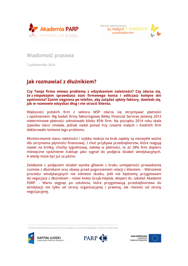 Wiadomość prasowa 7 października 2014 Jak rozmawiać z dłużnikiem? Czy Twoja firma miewa problemy z odzyskaniem należności? Czy zdarza się, że z niepokojem sprawdzasz stan firmowego konta i odliczasz kolejne dni opóźnienia? Zanim sięgniesz po telefon, aby zażądać spłaty faktury, dowiedz się, jak w rozmowie odzyskać dług i nie stracić klienta. Większości polskich firm z sektora MŚP zdarza się otrzymywać płatności z opóźnieniem. Wg badań firmy faktoringowej Bibby Financial Services jesienią 2013 nieterminowe płatności odnotowało blisko 85% firm. Na początku 2014 roku skala zjawiska nieco zmalała, jednak nadal ponad trzy czwarte małych i średnich firm deklarowało istnienie tego problemu. Monitorowanie stanu należności i szybka reakcja na brak zapłaty są niezwykle ważne dla utrzymania płynności finansowej. I choć przybywa przedsiębiorstw, które reagują nawet na krótką, choćby tygodniową, zwłokę w płatności, to aż 38% firm dopiero miesięczne opóźnienie traktuje jako sygnał do podjęcia działań windykacyjnych. A wtedy może być już za późno. Zwlekanie z podjęciem działań wynika głównie z braku umiejętności prowadzenia rozmów z dłużnikami oraz obawy przed pogorszeniem relacji z klientem. - Wdrożenie procedur windykacyjnych nie odniesie skutku, jeśli nie będziemy przygotowani do negocjacji z dłużnikiem - mówi Aneta Grzyb-Hejduk, ekspert ds. szkoleń Akademii PARP. - Warto sięgnąć po szkolenia, które przygotowują przedsiębiorstwa do windykacji nie tylko od strony organizacyjnej i prawnej, ale również od strony negocjacyjnej. Projekt współfinansowany przez Unię Europejską w ramach Europejskiego Funduszu Społecznego Już od 2006 roku Akademia PARP pomaga rozwijać umiejętności windykacyjne i negocjacyjne małych firm za pomocą szkoleń e-learningowych. We wrześniu tego roku uruchomiliśmy również szkolenie mobilne, poświęcone wyłącznie umiejętności rozmowy z nierzetelnym partnerem: "Jak rozmawiać z dłużnikiem?" Uświadamia ono, na czym polega specyfika rozmowy z kontrahentem niewywiązującym się z umowy. Uzasadnia również, dlaczego w rozmowie windykacyjnej należy pamiętać, że dłużnik nadal pozostaje klientem. Szkolenie składa się z 3 modułów: Rozmowa windykacyjna, Typy kontrahentów i sposoby radzenia sobie z nimi oraz Strategie negocjacyjne w windykacji. Uczestnicy poznają w nich prawidłowy układ rozmowy windykacyjnej i praktyczne wskazówki, jak ją prowadzić, np. jak sprawdzić, czy powody odwlekania zapłaty są prawdziwe, czy są tylko wymówką. Dowiedzą się, jak rozmawiać z dłużnikiem w zależności od typu jego osobowości: jakich sformułowań używać w rozmowie, jak reagować na ataki słowne. Po szkoleniu uczestnikom łatwiej będzie zdecydować, czy i kiedy warto podejmować negocjacje z klientem, kiedy stosować podejście pozycyjne, a kiedy problemowe. Będą też wiedzieć, jak pokonać niechęć dłużników do podejmowania negocjacji oraz jak skutecznie negocjować terminy i sposoby spłaty zaległości. „Jak rozmawiać z dłużnikiem” to jedno z 45 szkoleń m-learning Akademii PARP, dostępnych na smartfonach i tabletach. Portal szkoleniowy www.akademiaparp.gov.pl oferuje jeszcze 45 szkoleń e-learning, które przechodzi się za pomocą komputera lub laptopa z dostępem do Internetu. Wszyscy przedsiębiorcy i pracownicy sektora MŚP oraz osoby planujące rozpoczęcie własnej działalności gospodarczej mogą podjąć bezpłatną naukę. Wiedza potwierdzana jest certyfikatem. Projekt jest realizowany na zlecenie Polskiej Agencji Rozwoju Przedsiębiorczości i współfinansowany ze środków UE w ramach Europejskiego Funduszu Społecznego. kontakt: [email protected] Infolinia 0-801 444 MSP (czyli 0-801 444 677) Projekt współfinansowany przez Unię Europejską w ramach Europejskiego Funduszu Społecznego
